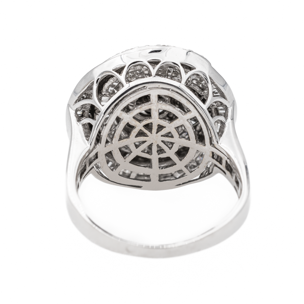 Bague cocktail en or blanc 750 millièmes (18 carats), sertie de diamants taille brillant et taille baguette, estimés G/VS, diamant central environ 0,07 ct, 6 diamants brillant environ 0,03 ct chacun, 60 diamants brillant environ 0,01 ct chacun, 80 diamants baguette environ 0,02 ct chacun), Poids total estimé des diamants: 2,45 cts, Tour de doigt: 59, diamètre du motif: 2,04 cm, Poids total: 11,05 g, Poinçon hibou, Excellent état