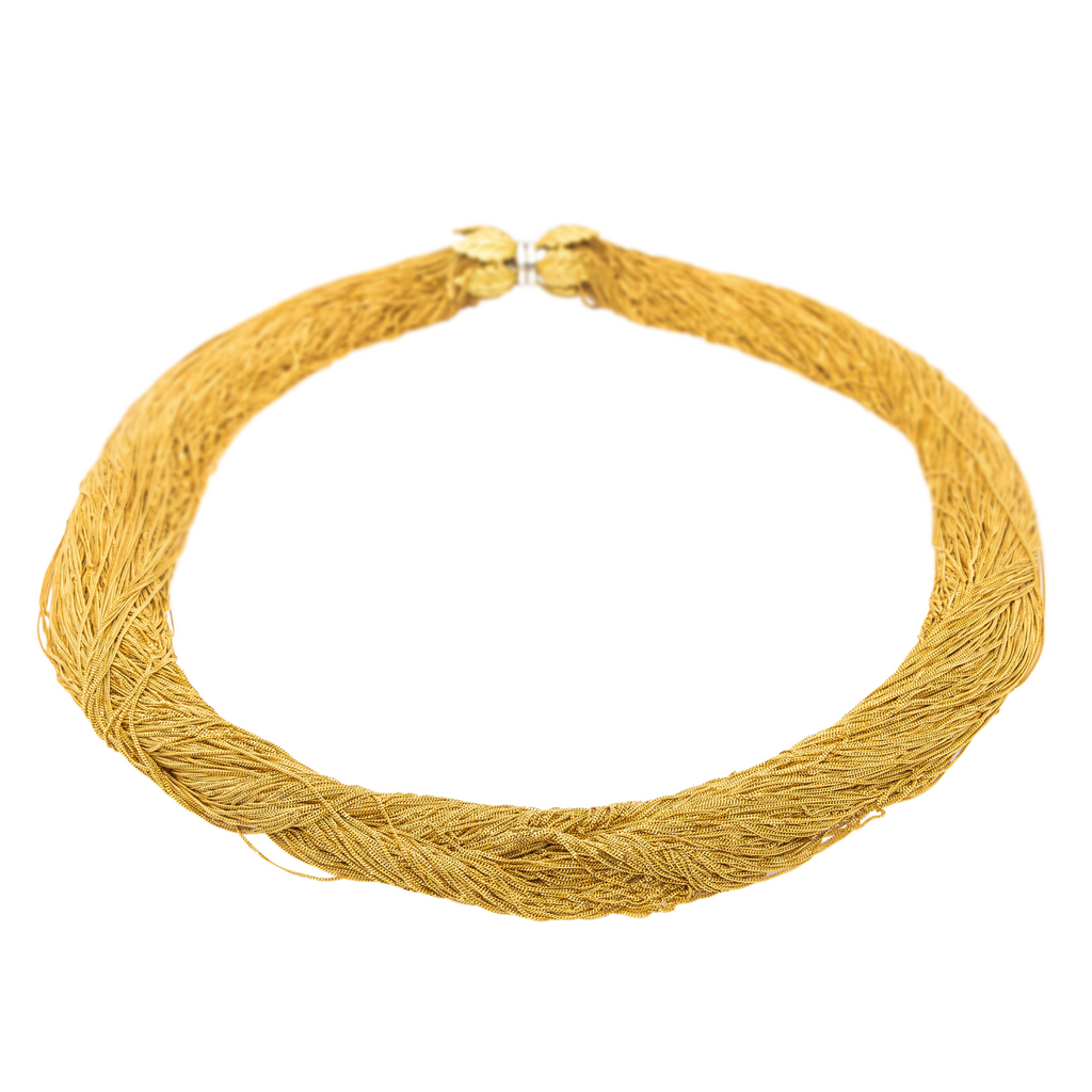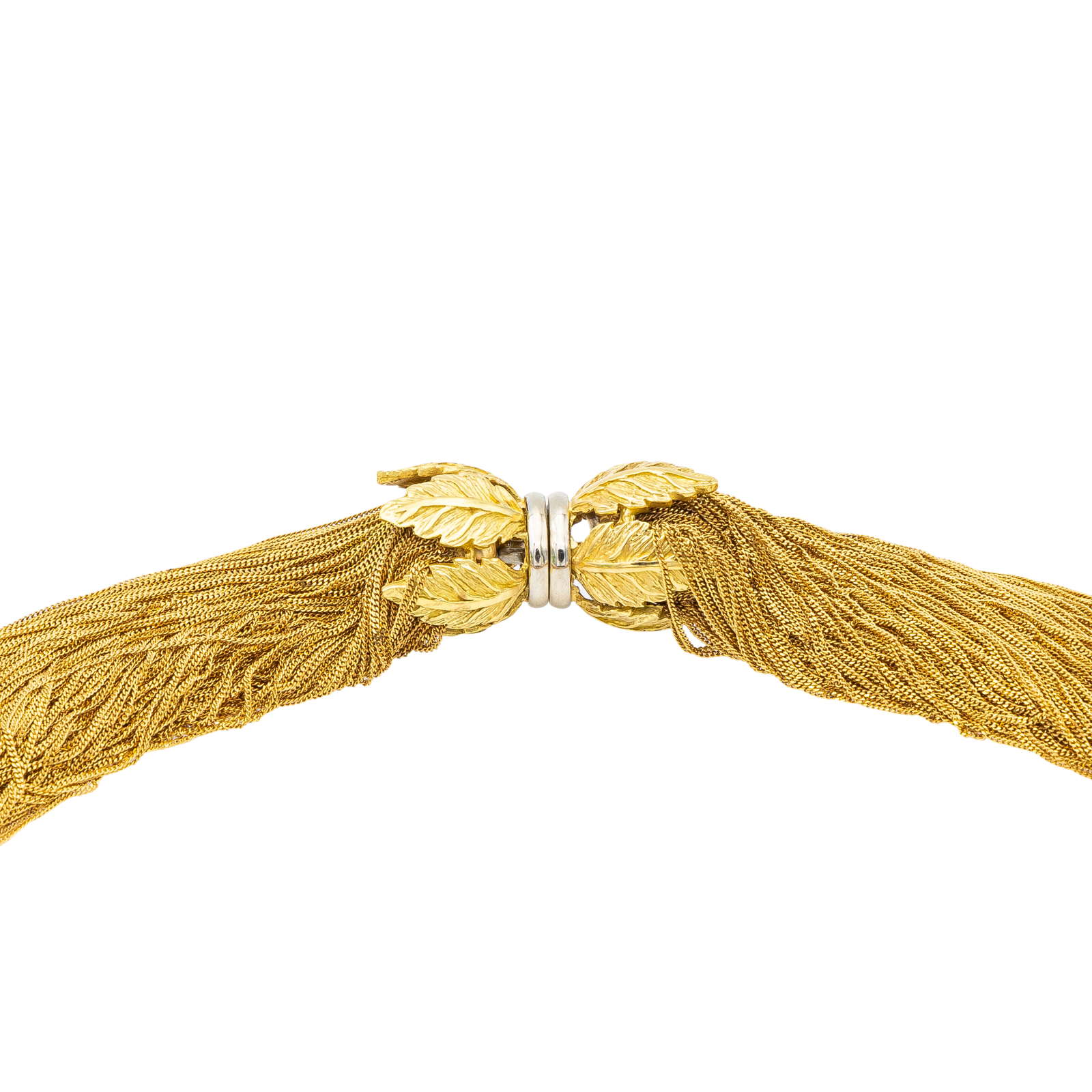 Magnifique collier vintage, en or jaune 750 millièmes (18 carats), composé de nombreuses chaînettes très fines entrelacées, joli fermoir ornée de motifs feuilles d'or, fermeture sur or blanc, longueur: 50,5 cm, largeur fermoir 1,43 cm, largeur d'une chaînette: 0,3 mm, largeur collier environ 0,9 cm, poids total: 224,77 g, poinçonné, très bon état