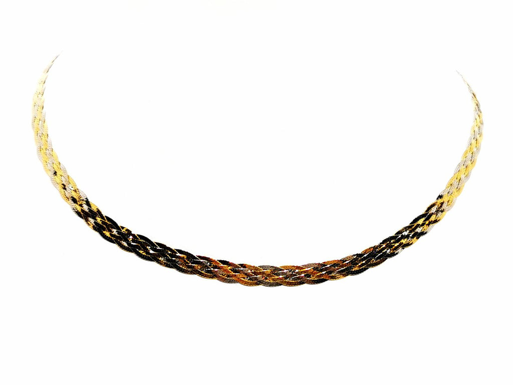 Collier en jaune et blanc 750 millièmes (18 carats), 6 brins tréssés d'une largeur de 0,11 cm chacun, 3 en or jaune brillant et 3 en or blanc, longueur: 40 cm, largeur: 0,59 cm, épaisseur: 0,01 cm, poids total: 8,06 g, poinçon tête d'aigle, excellent état