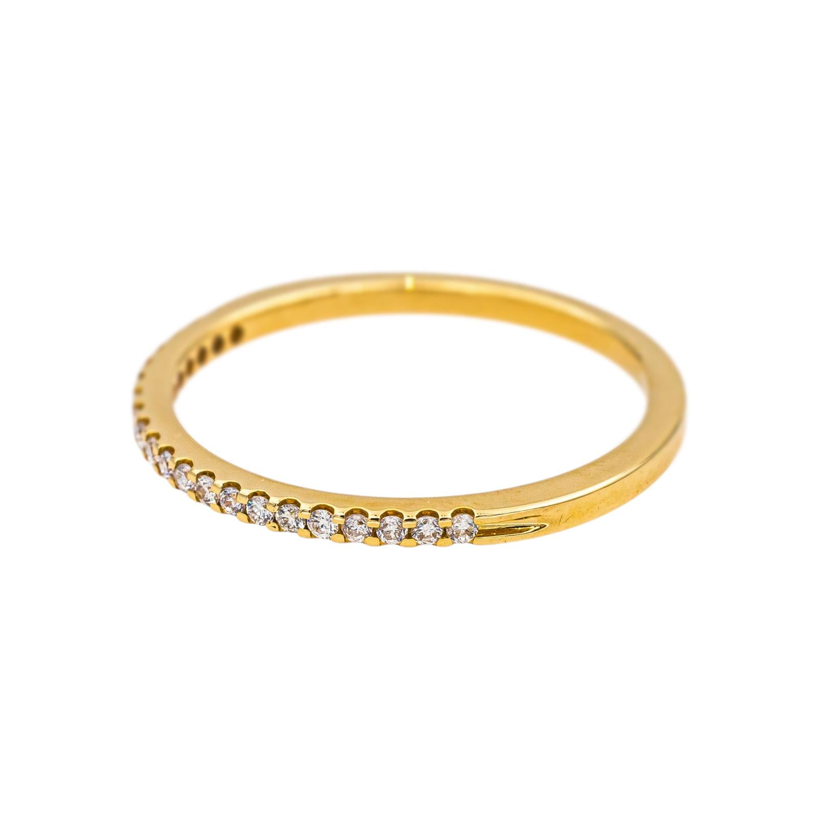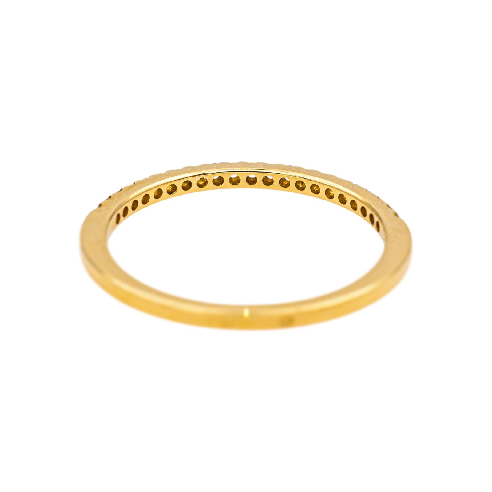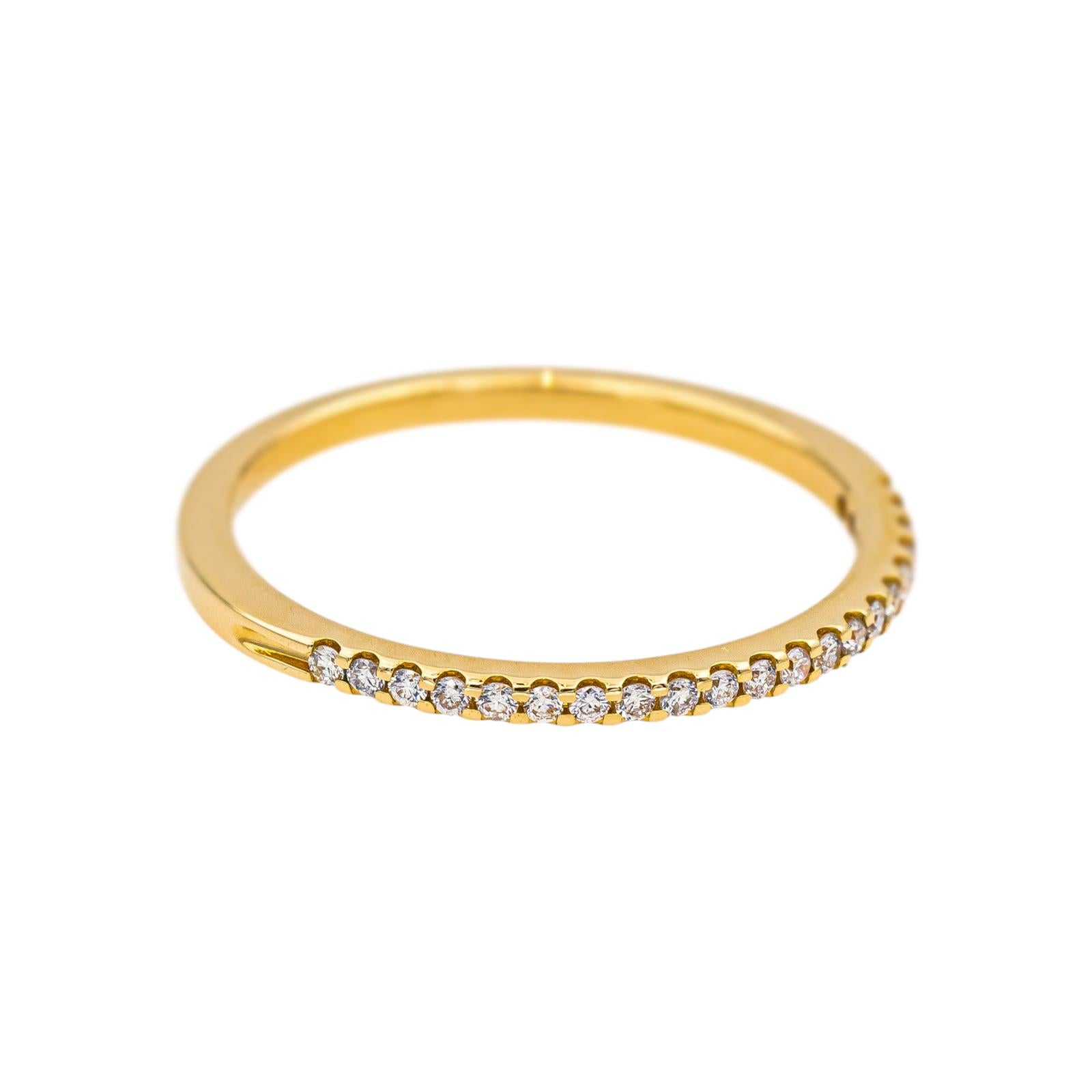 Demi-alliance en or jaune 750 millièmes (18 carats), sertie de 21 diamants taille brillant environ H-SI, d'environ 0,003 ct chacun, poids total diamants : environ 0,06 ct, largeur sur le dessus : 0,14 cm, tour de doigt : 51, poids total : 1,48 g, poinçon tête d'aigle, excellent état