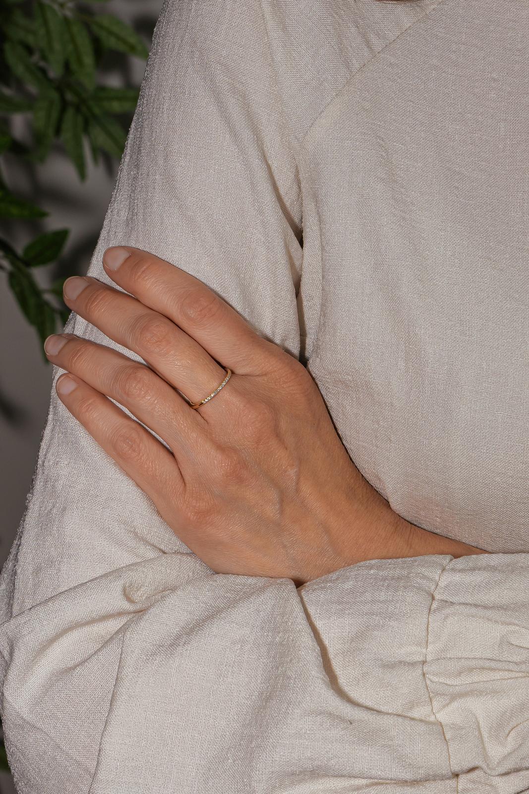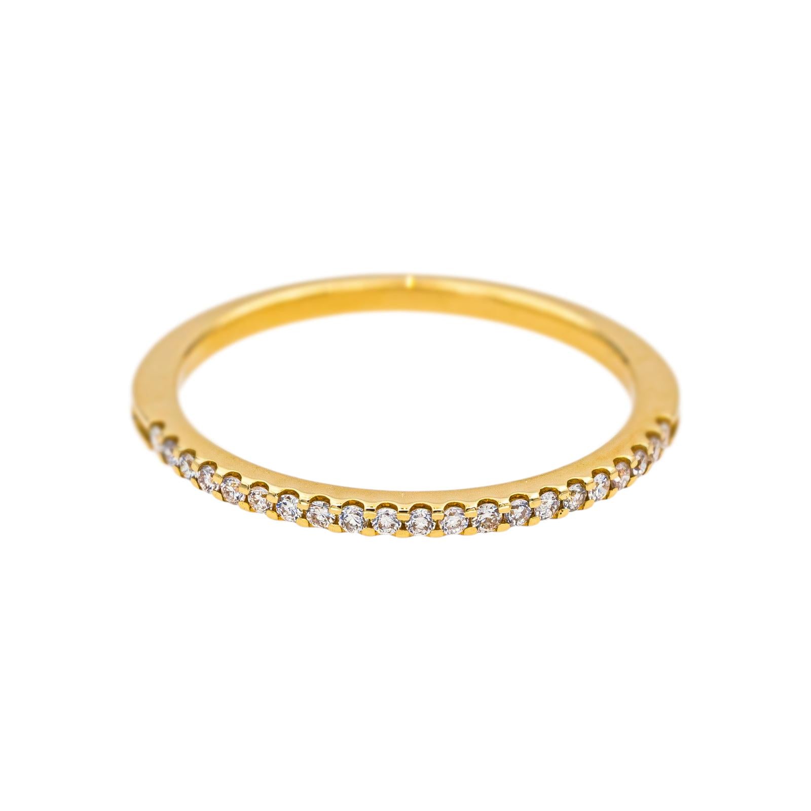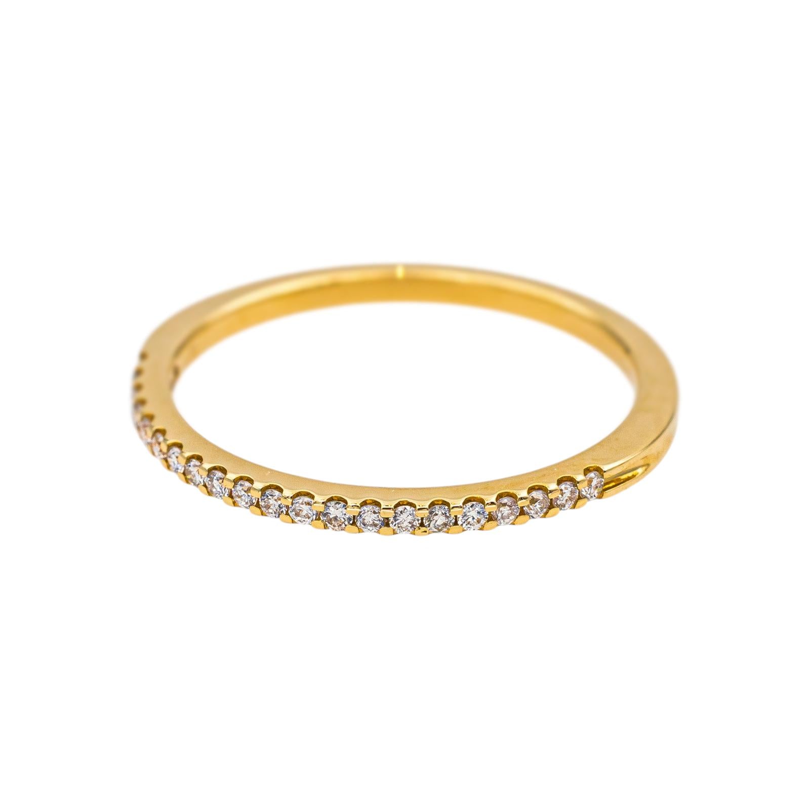 Demi-alliance en or jaune 750 millièmes (18 carats), sertie de 21 diamants taille brillant environ H-SI, d'environ 0,003 ct chacun, poids total diamants : environ 0,06 ct, largeur sur le dessus : 0,14 cm, tour de doigt : 51, poids total : 1,48 g, poinçon tête d'aigle, excellent état