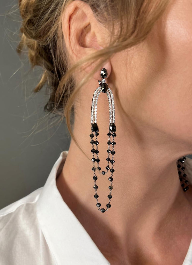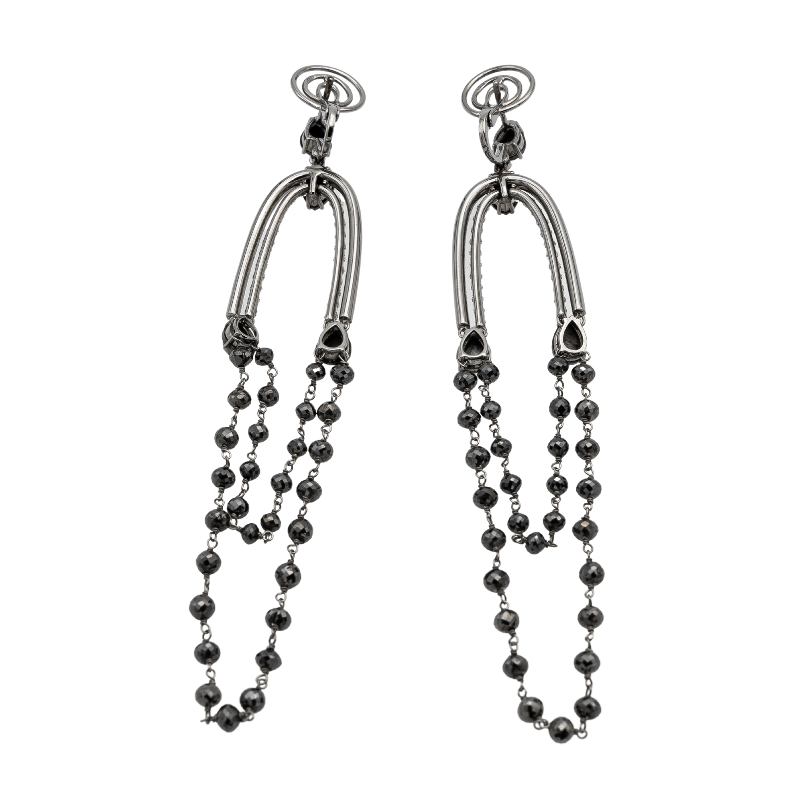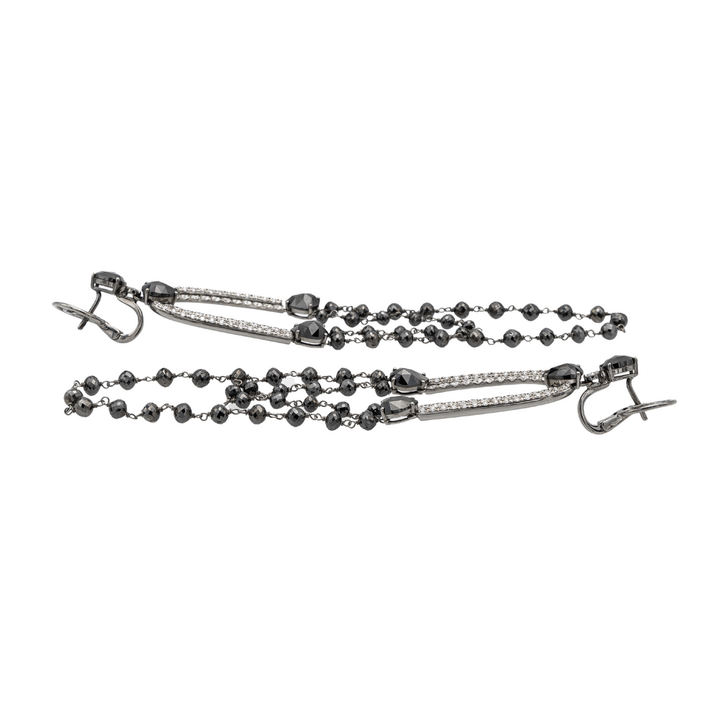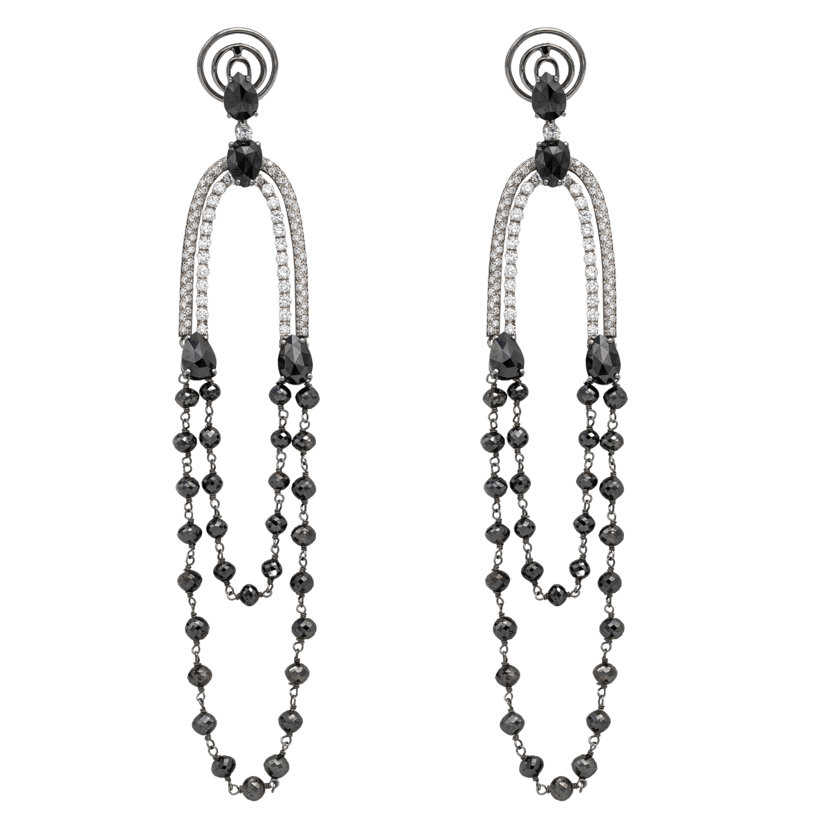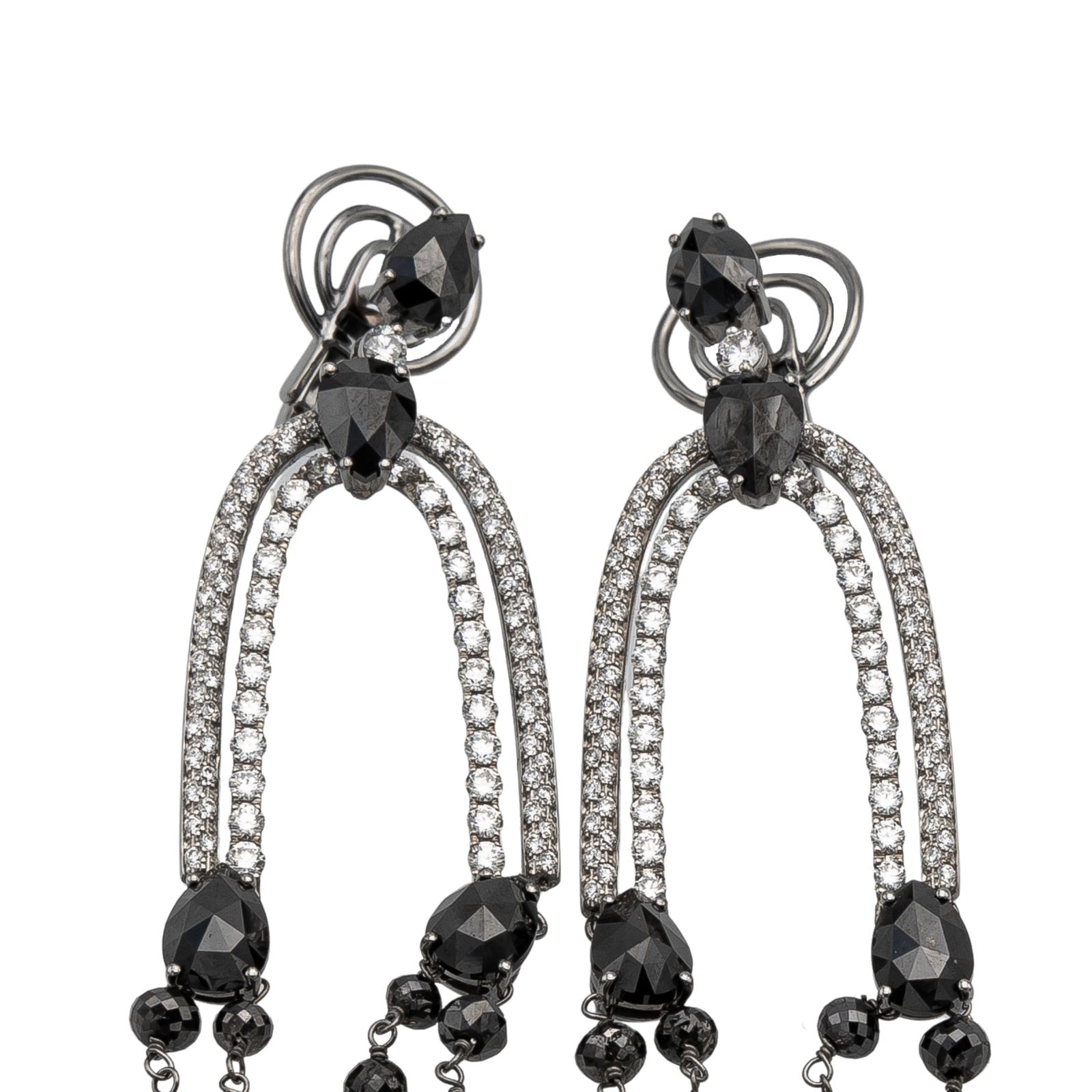 Boucles d'oreilles en blanc 750 millièmes (18 carats), haute joaillerie, pavées de diamants noirs et blanc F-VS pour un total de 23,28 carats, Deux diamants blanc taille brillant F-VS d'environ 0,06 ct chacun, 48 diamants blanc taille brillant F-VS d'environ 0,015 ct chacun, 120 diamants blanc taille brillant F-VS d'environ 0,005 ct chacun, 8 diamants noirs taillés en poire d'environ 0,60 chacun, 38 boules facetées de diamants noirs de 3,4 mm de diamètre, 22 boules facetées de diamants noirs de 2,9 mm de diamètre, Fermoir tige + clips, poids total: 17,58 g, poinçon tête d'aigle, longueur: 10,5 cm, largeur: 1,85 cm, état neuf