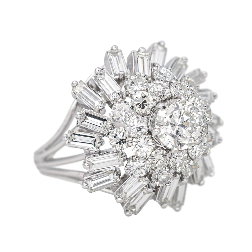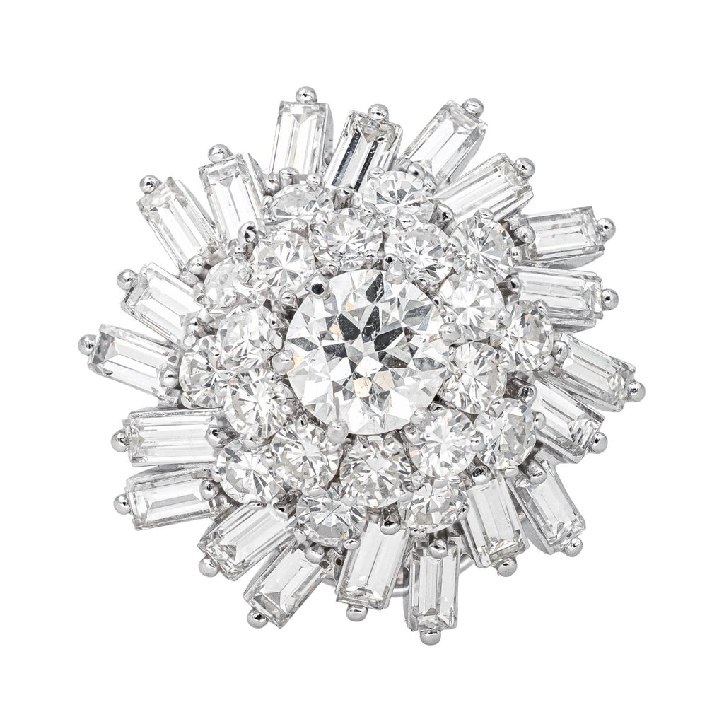 Bague en platine 950 millièmes, sertie de diamants, 1 diamant taille ancienne, environ G-SI, d'un poids total d'environ 0,88 ct, entouré de 20 diamants taille brillant, environ G-SI, d'un poids total d'environ 1,40 ct, (chaque diamant d'un poids d'environ 0,07 ct), 20 diamants taille baguette, environ G-SI, d'un poids total d'environ 1,00 ct, (chaque diamant d'un poids d'environ 0,05 ct), poids total diamants environ : 3,28 ct, largeur sur le dessus : 2,17 cm, tour de doigt : 50, poids total : 13,85 g, poinçon tête de chien, excellent état