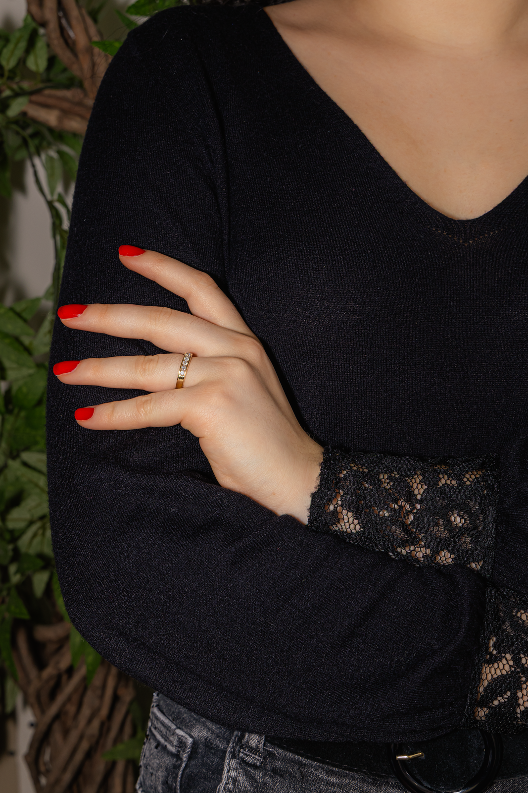 Demi-alliance en or jaune 750 millièmes (18 carats), sertie de 7 diamants taille brillant environ G-SI, d'environ 0,06 ct chacun, poids total diamants : environ 0,42 ct largeur sur le dessus : 0,38 cm, tour de doigt : 53, poids total : 3,86 g, poinçon tête d'aigle, excellent état