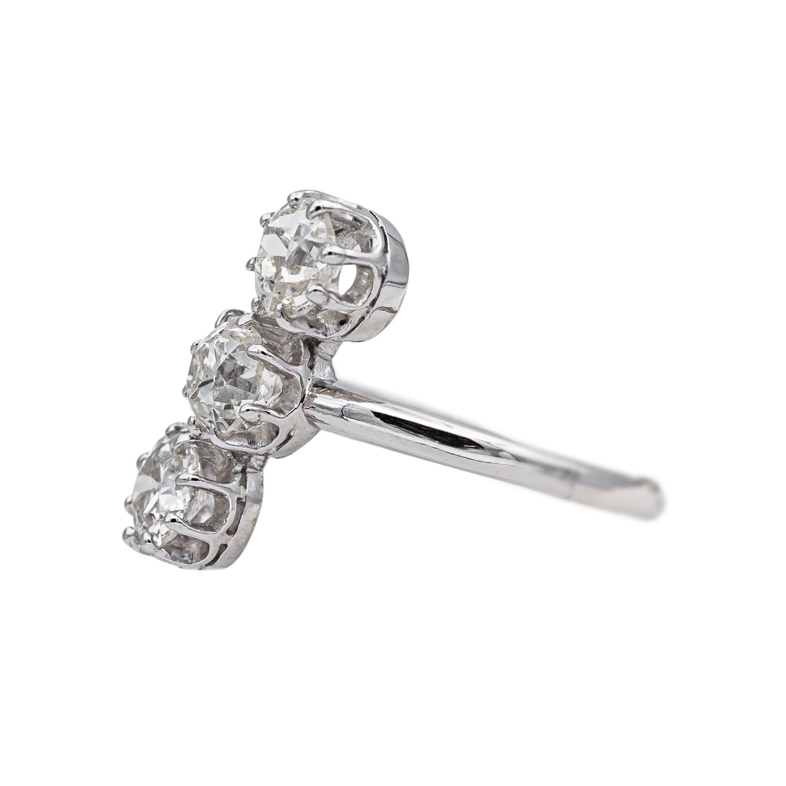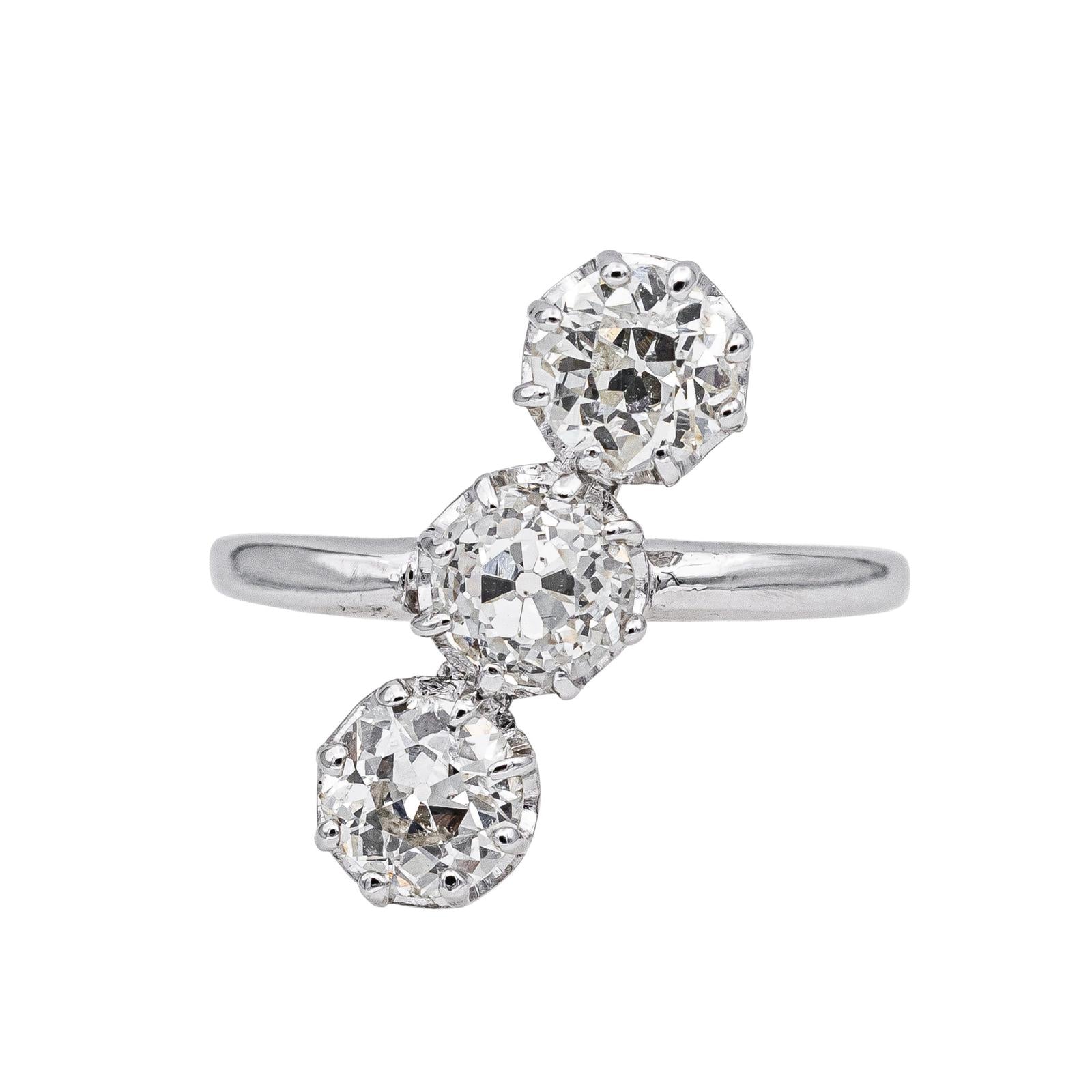 Bague trilogie en platine 950 millièmes, sertie de 3 diamants taille ancienne, environ H-SI, d'un poids total d'environ 1,74 ct, (chaque diamant d'un poids d'environ 0,58 ct), largeur sur le dessus : 1,75 cm, tour de doigt : 49, poids total : 3,78 g, poinçon mascaron, très bon état