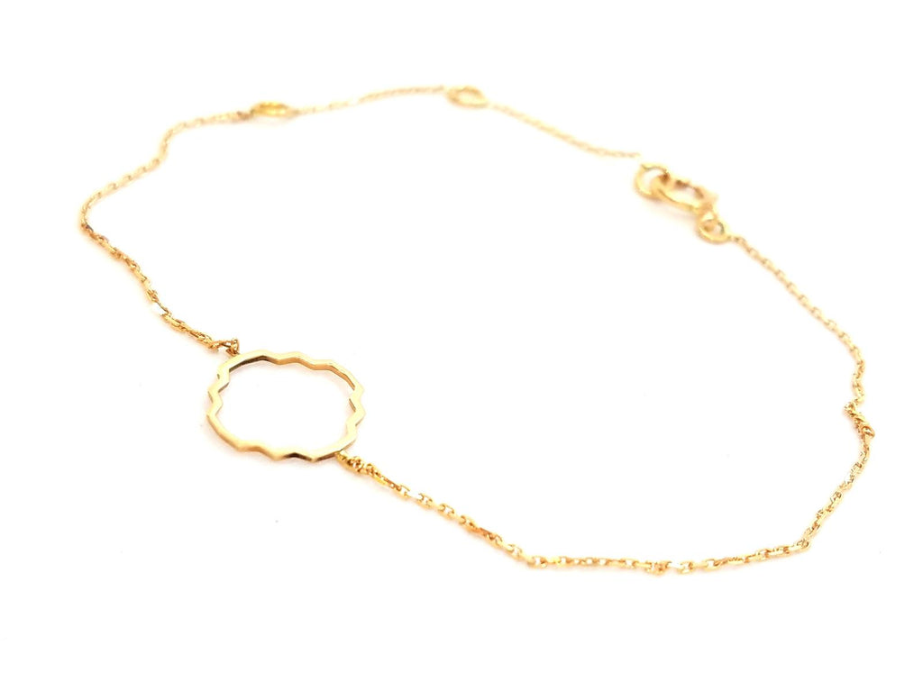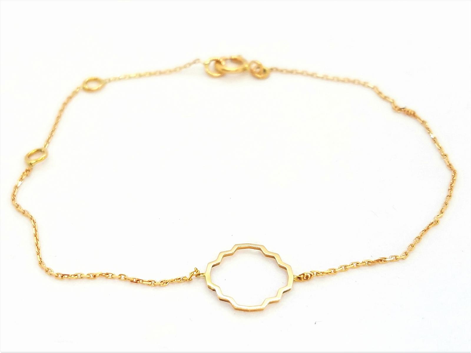 Bracelet en or rose 750 millièmes (18 carats), motif graphique en transparence sur chaîne en maille forçat, dimensions du motif: 1 cm x 1 cm, largeur de la chaîne: 0,7 mm, longueur: 18,5 cm avec anneaux intermédiaires à 16,5 cm et à 14,4 cm, poids total: 0,70 g, poinçon tête d'aigle, état neuf