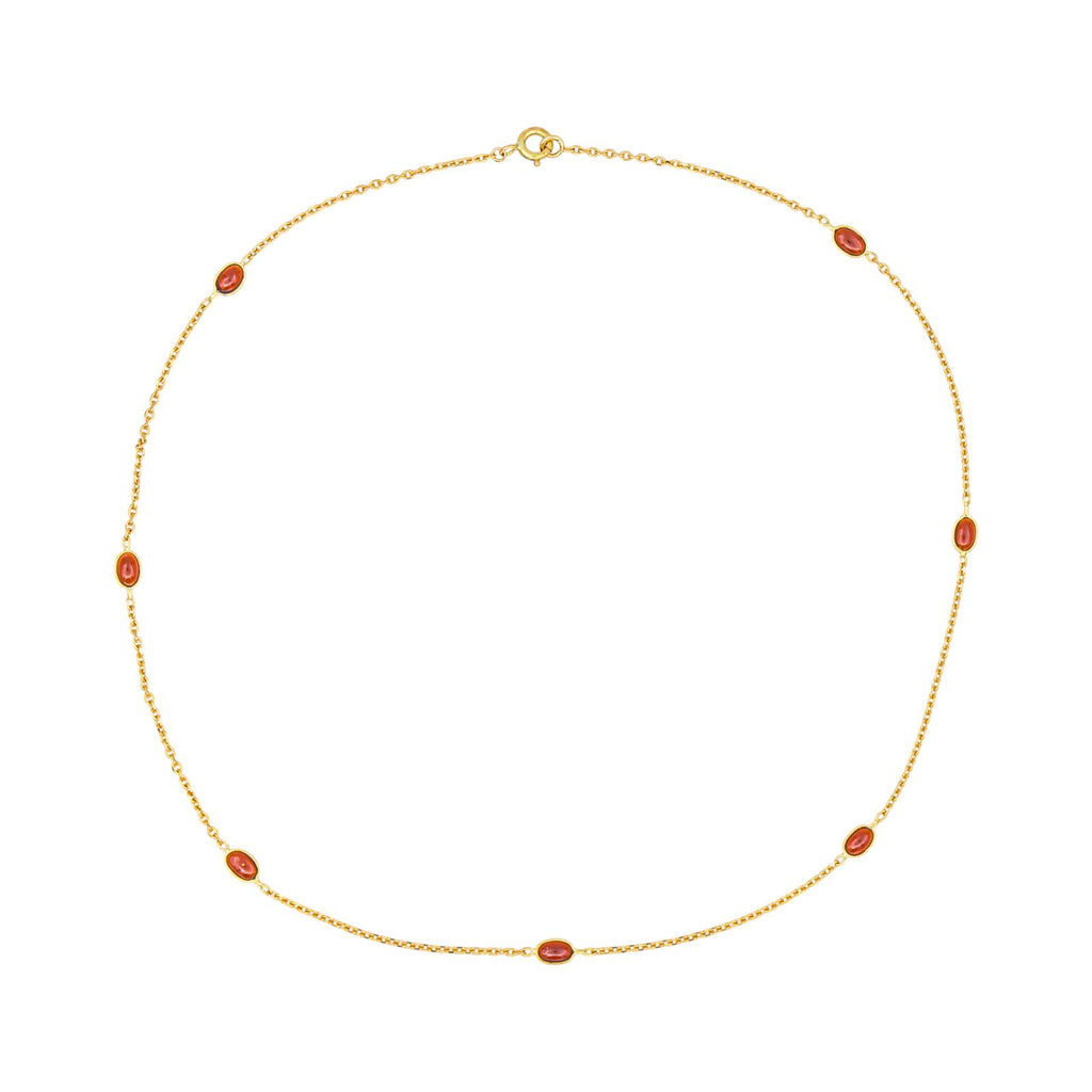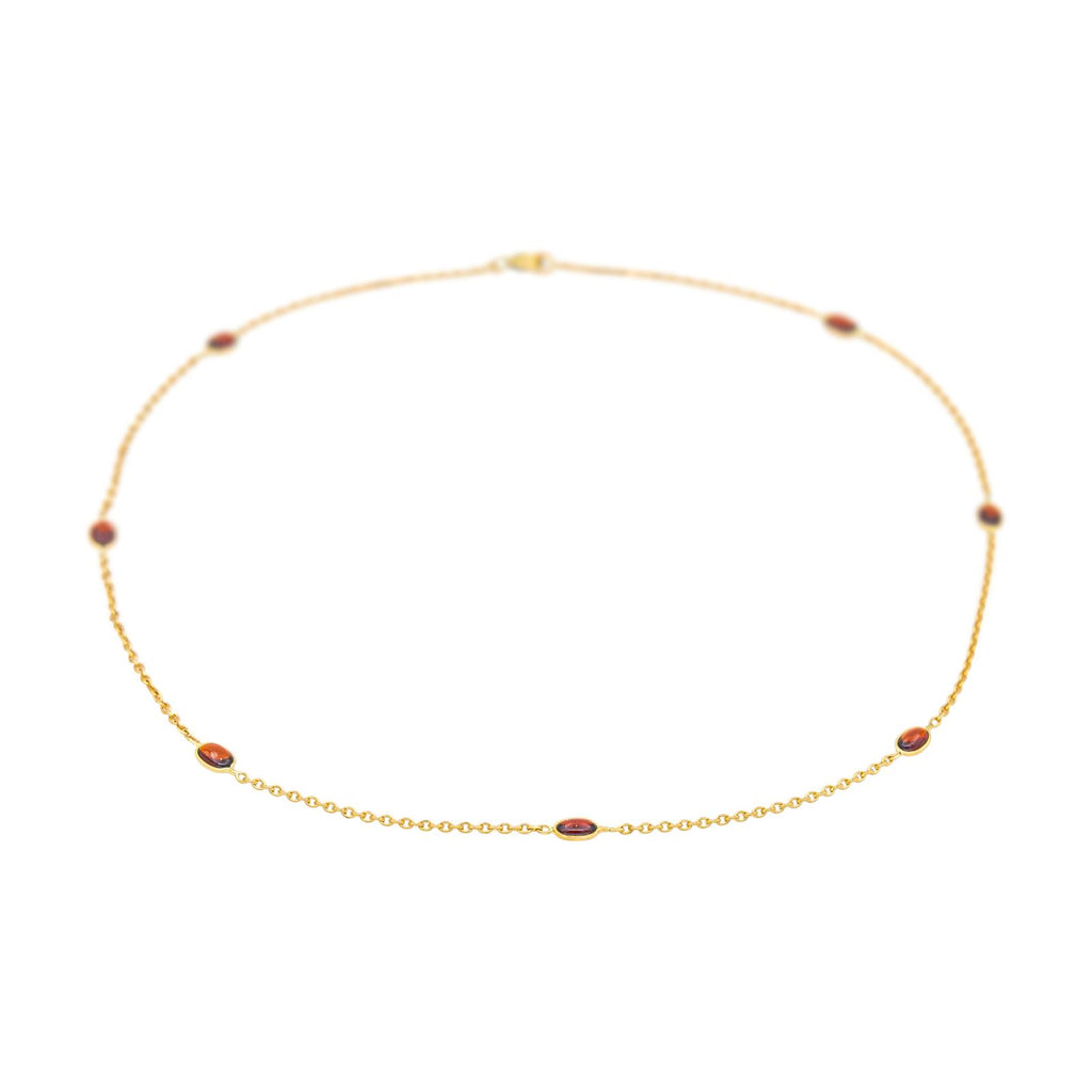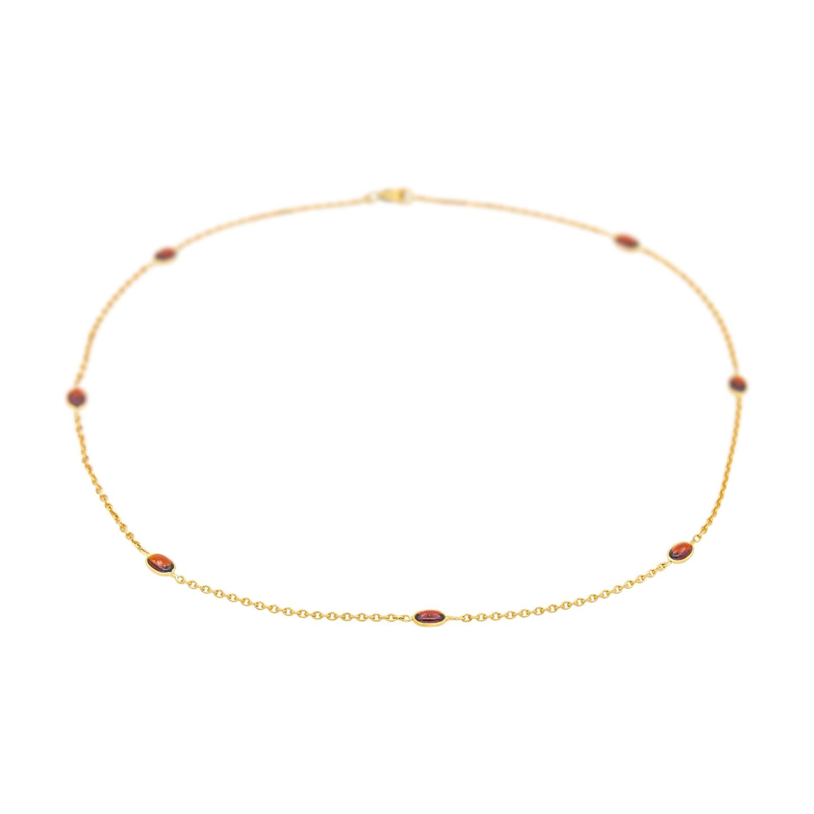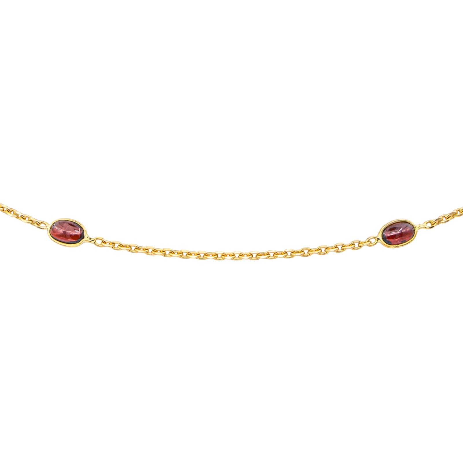 Collier en or jaune 750 millièmes (18 carats), sertis de grenats, taille cabochon, poids total : environ 1,75 ct (chaque grenant d'un poids d'environ d'un poids d'environ 0,25 ct), maille forçat, longueur : 38 cm, largeur de la chaîne : 0,10 cm, fermoir à ressort, poids total : 3,31 g, poinçon tête d’aigle, excellent état