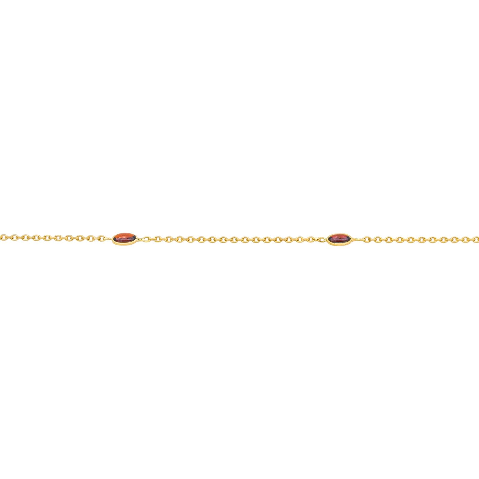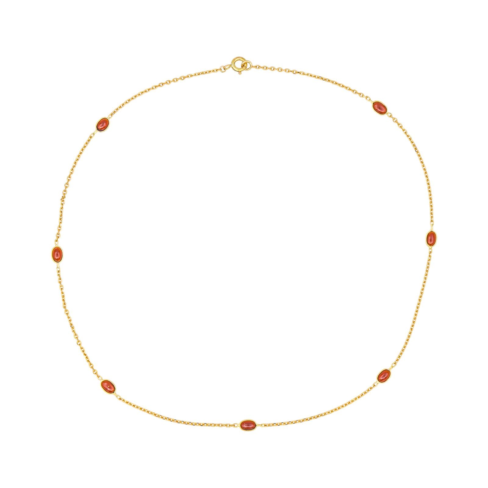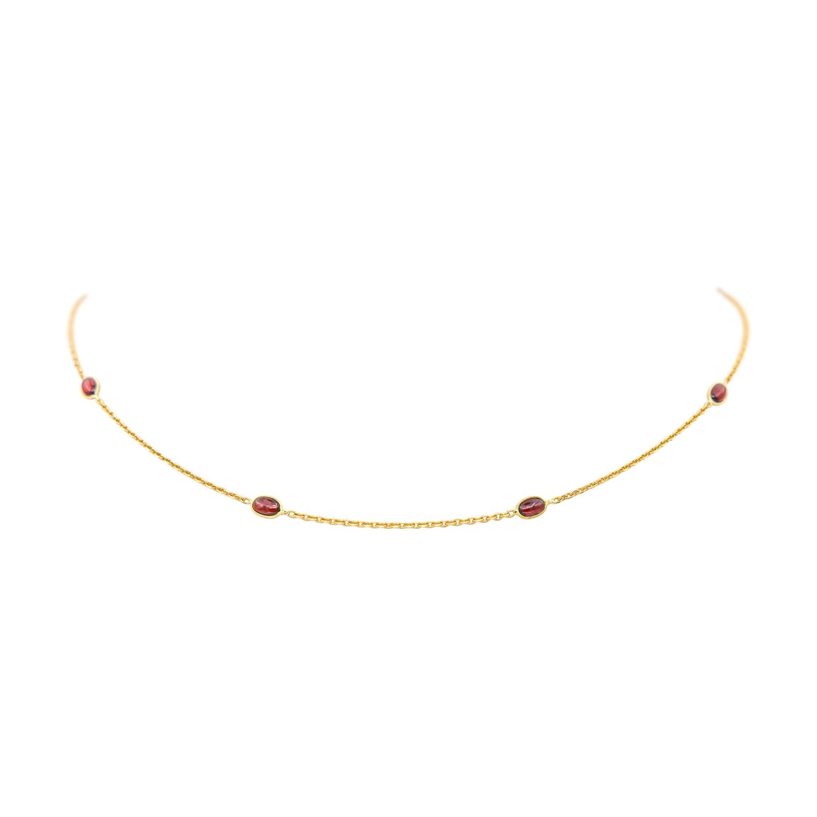 Collier en or jaune 750 millièmes (18 carats), sertis de grenats, taille cabochon, poids total : environ 1,75 ct (chaque grenant d'un poids d'environ d'un poids d'environ 0,25 ct), maille forçat, longueur : 38 cm, largeur de la chaîne : 0,10 cm, fermoir à ressort, poids total : 3,31 g, poinçon tête d’aigle, excellent état