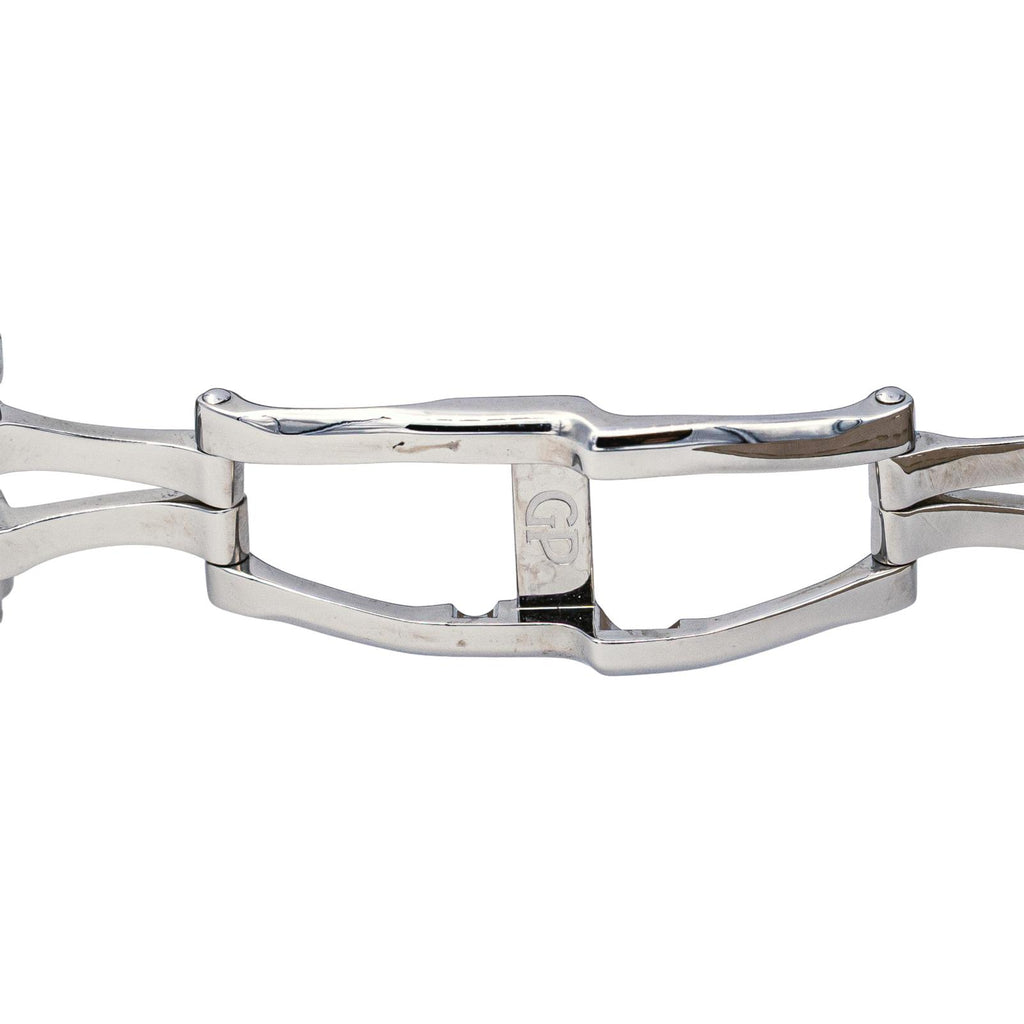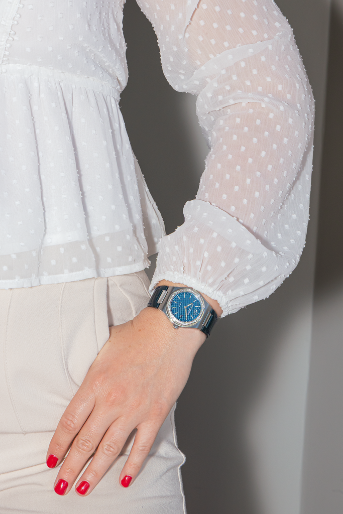Montre Girard-Perregaux modèle Laureato acier, n°série A n°315, cadran bleu guichoché à index bâtons, sertie de 56 diamants, 8 diamants taille brillant, environ F-G/VVS, d'un poids total 0,48ct (chaque diamant d'un poids d'environ 0,06 ct), 48 diamants taille brillant, environ F-G/VVS, d'un poids d'environ 0,34ct (chaque diamant d'un poids d'environ 0,007 ct), mouvement à quartz, boîtier 34 mm, verre saphir, bracelet cuir à boucle papillon, (taille poignet 20 cm ajustable, largeur bracelet 2,10 cm en chute), poids total : 53,58 g, full set (boite et papier d'origine), année 2025, garantie, excellent état jamais portée