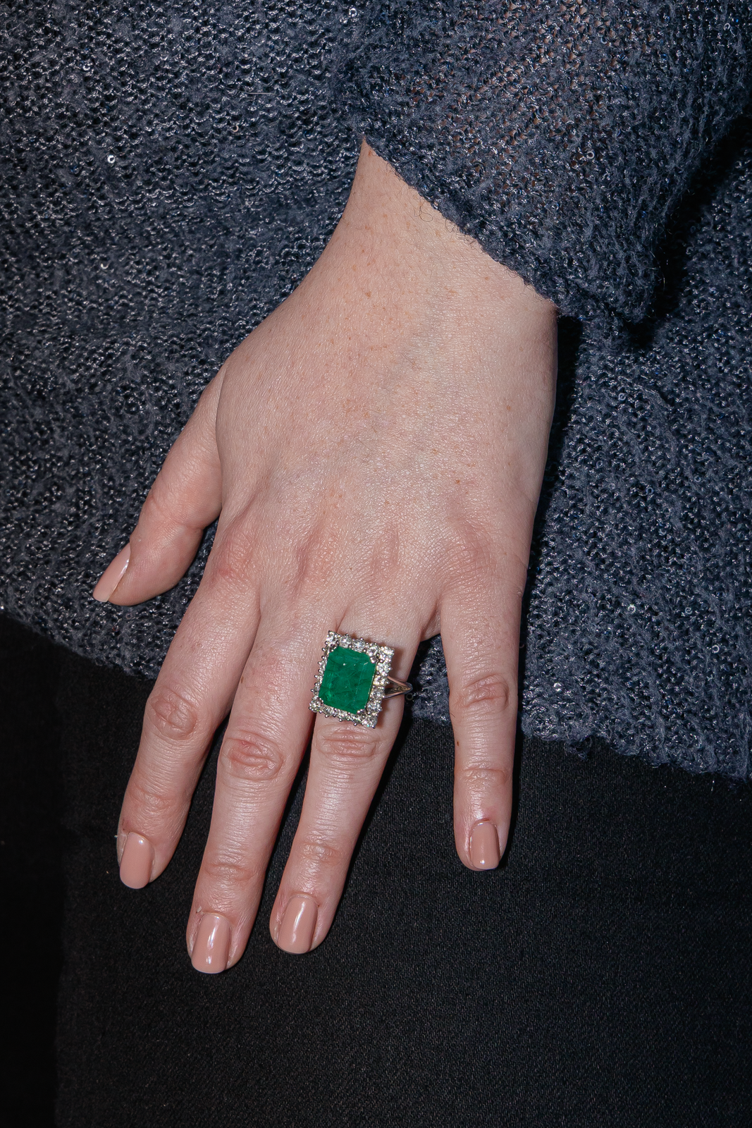 Bague en or blanc 750 millièmes (18 carats), sertie d'une émeraude et de diamants, une émeraude taille rectangle, d'un poids total d'environ 4,26 cts, entourée de 18 diamants taille brillant, environ H-SI, d'un poids total d'environ 1,26 cts, (chaque diamant d'un poids d'environ 0,07 ct), largeur sur le dessus : 1,98 cm, tour de doigt : 51, poids total : 8,71 g, poinçon hibou, excellent état