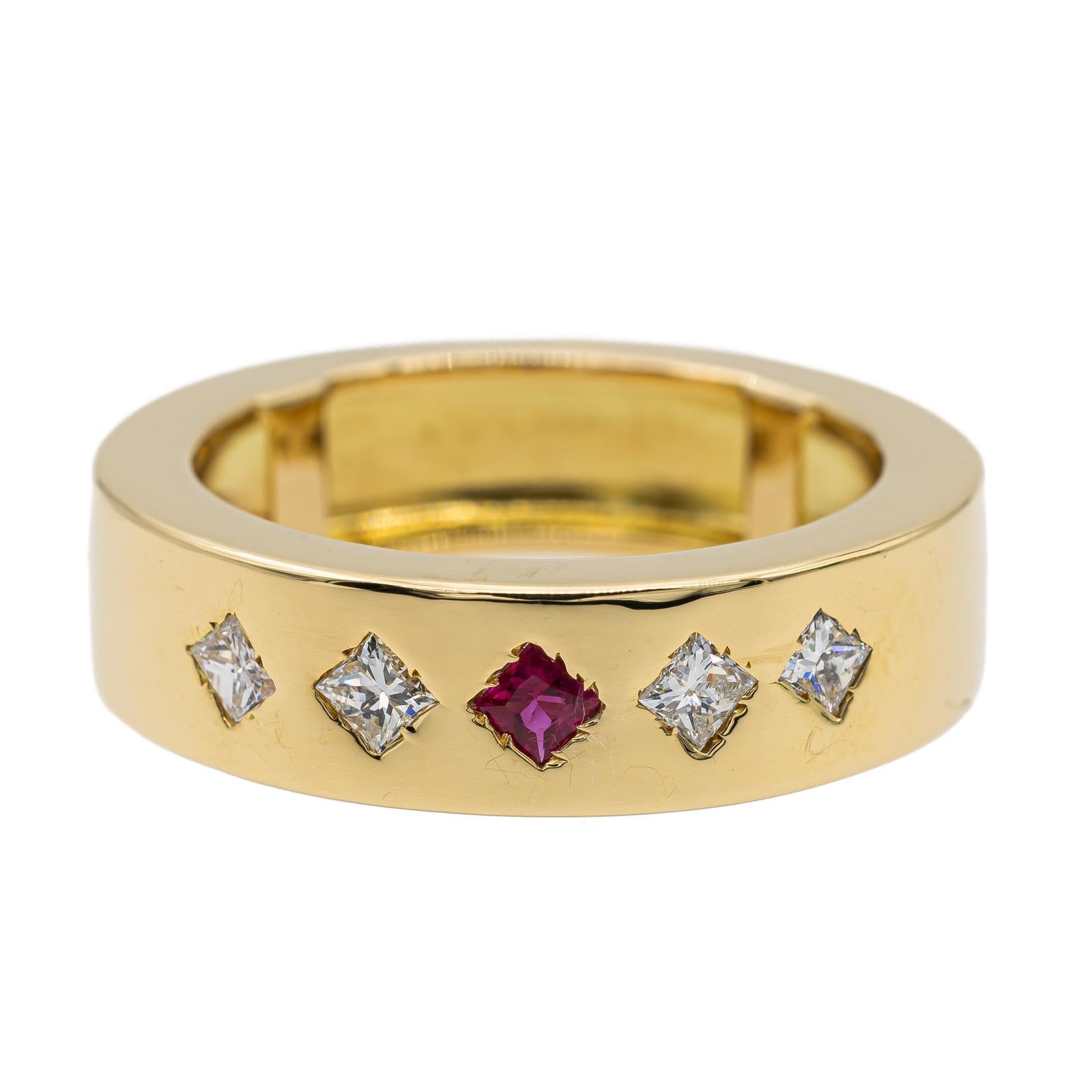 Bague en or jaune 750 millièmes (18 carats), sertie d’un rubis taille princesse, d’environ 0,03 ct, sertie de 4 diamants taille princesse, environ F-VS, d'un poids total d'environ 0,12 ct, (chaque diamant d'un poids d'environ 0,03 ct), largeur sur le dessus: 0,58 cm, tour de doigt: 52, poids total: 7,78 g, poinçon hibou, excellent état
