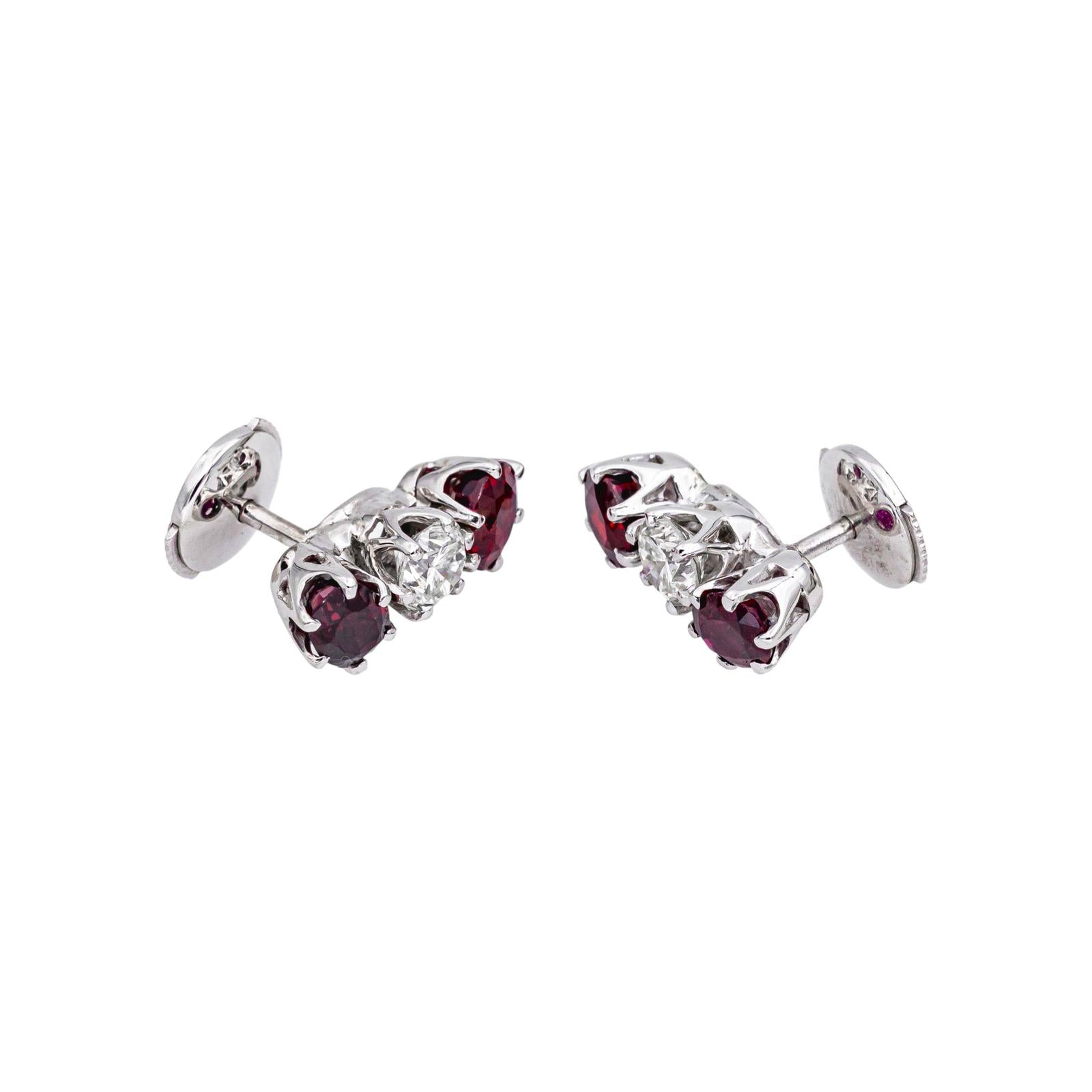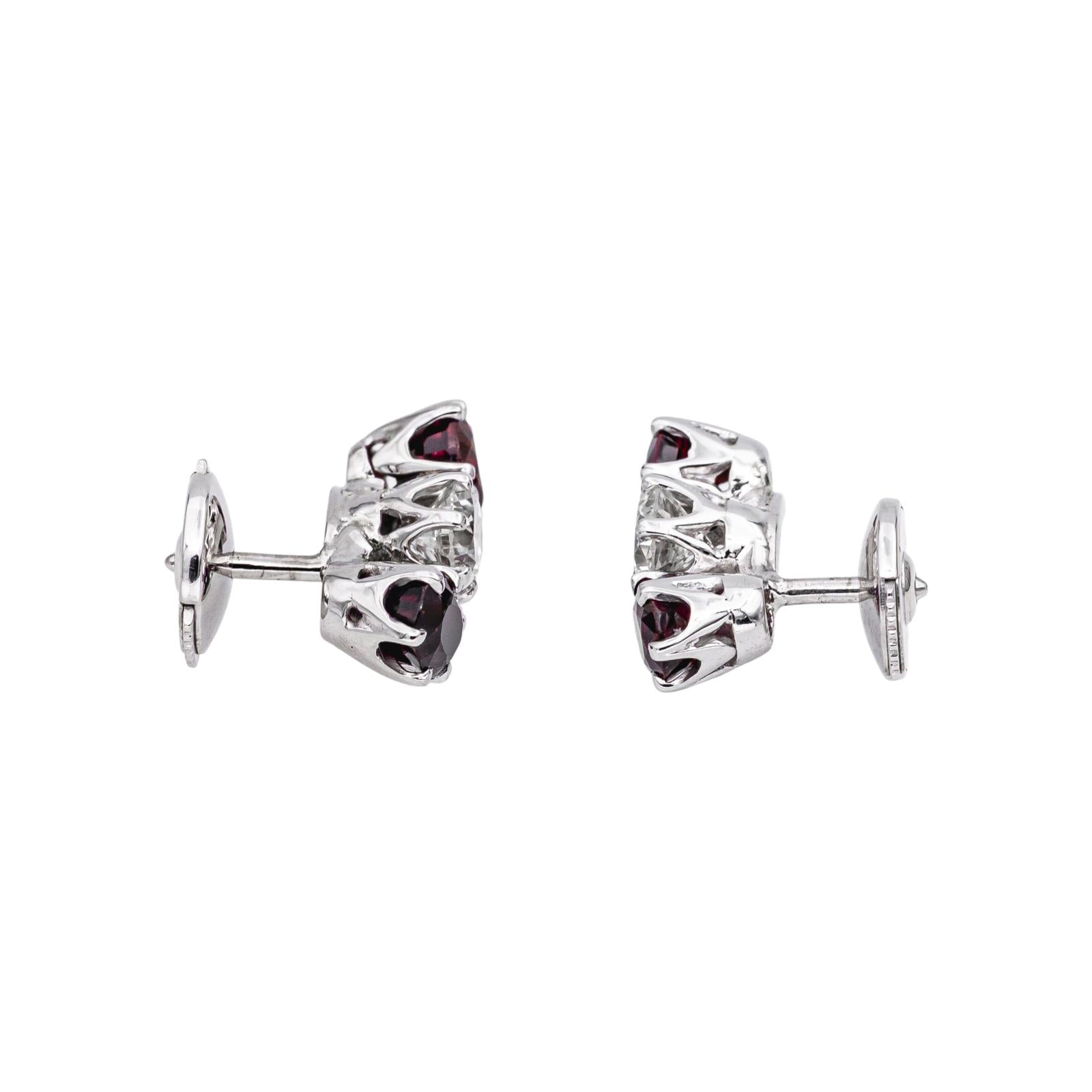 Paire de boucles d’oreilles en or blanc 750 millièmes (18 carats)testé, sertie de rubis et de diamants, 4 rubis taille ovale, d'un poids total d'environ 2,00 cts, (chaque rubis d'un poids d'environ 0,50 ct), et 2 diamants taille brillant, environ G-SI, d'un poids total d'environ 0,60 ct, (chaque diamant d'un poids d'environ 0,30 ct), dimensions : 1,48 cm x 0,57 cm, poids total : 3,68 g, excellent état