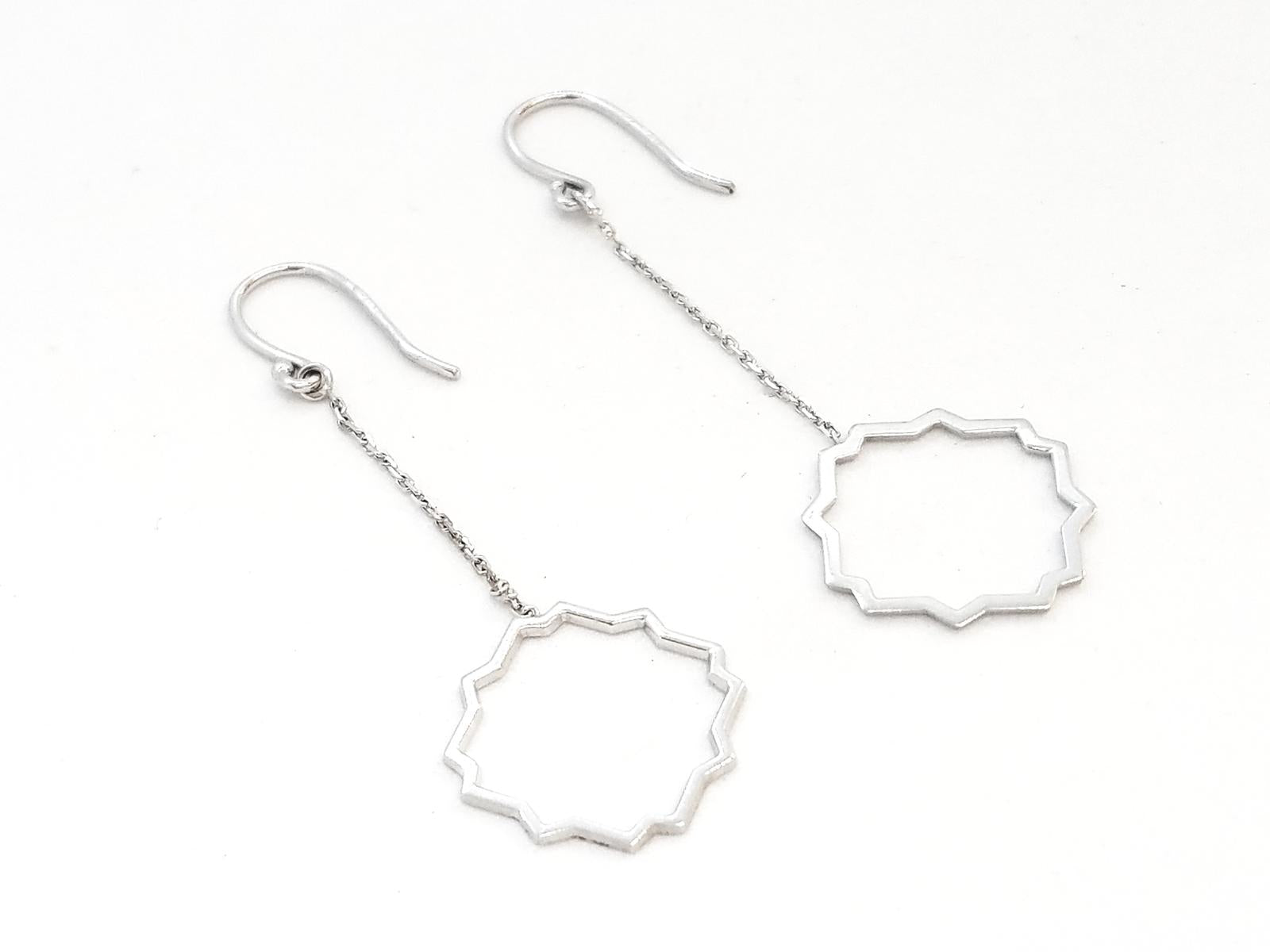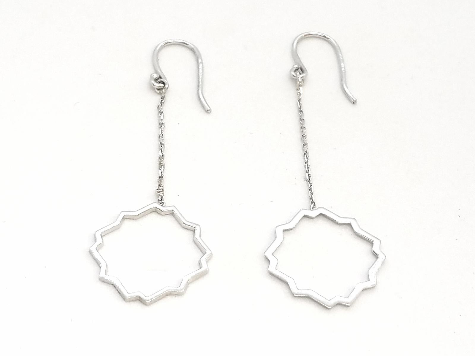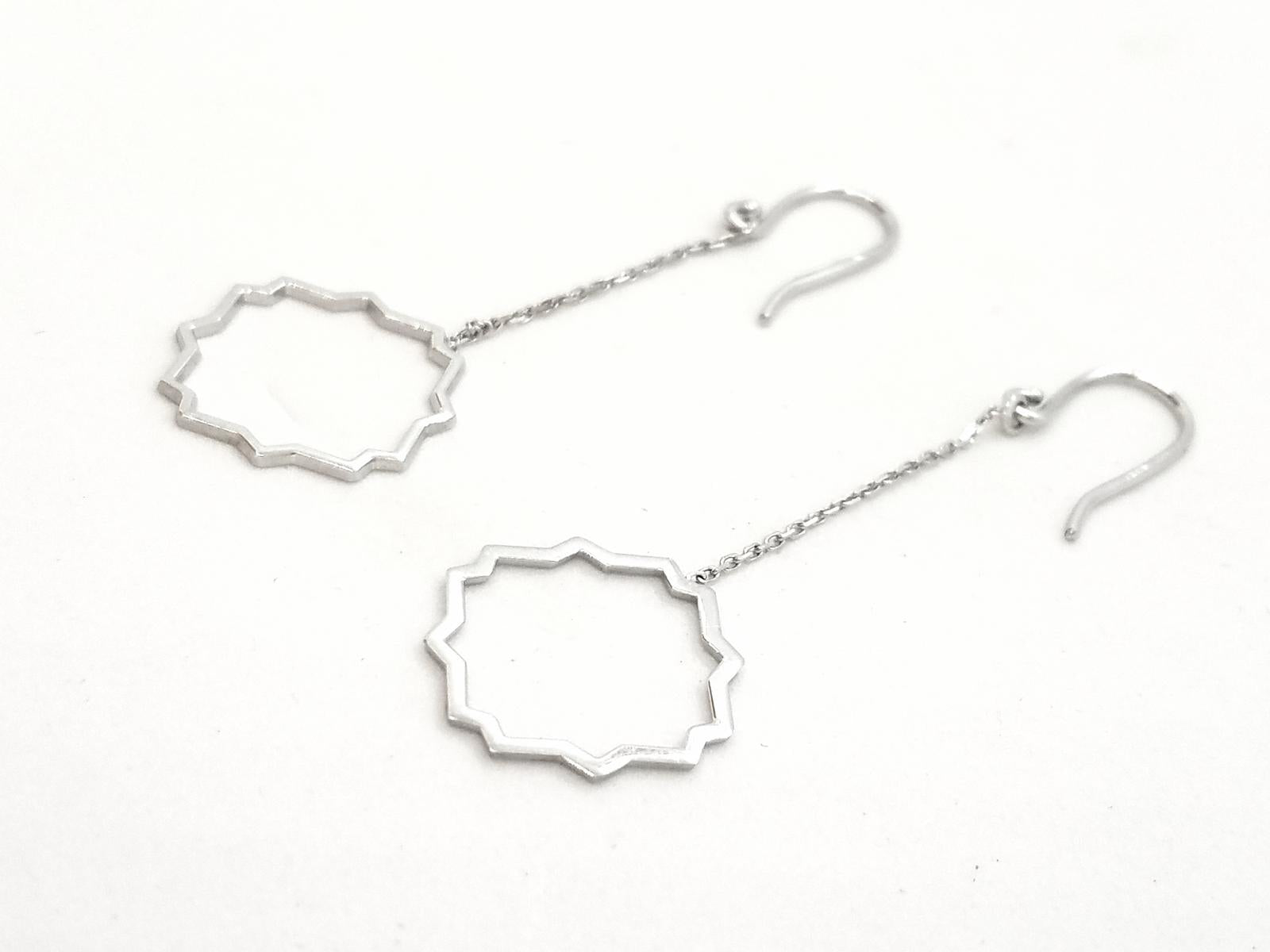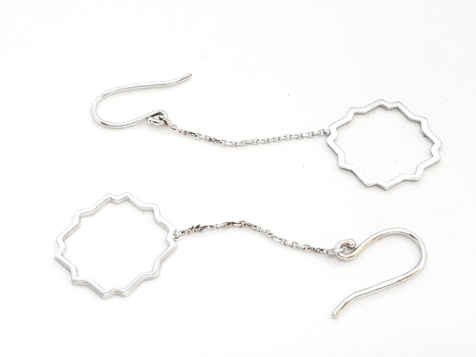 Boucles d'oreilles pendantes en or blanc 750 millièmes (18 carats), motif graphique en tranparence suspendu à une chaîne maille forçat, dimensions du motif: 1,52 cm x 1,52 cm, largeur de la chaîne: 0,7 mm, longueur totale: 5 cm, poids total: 01,42 g, poinçon tête d'aigle, état neuf