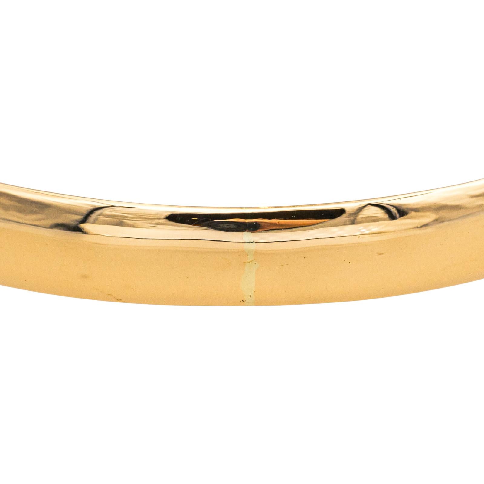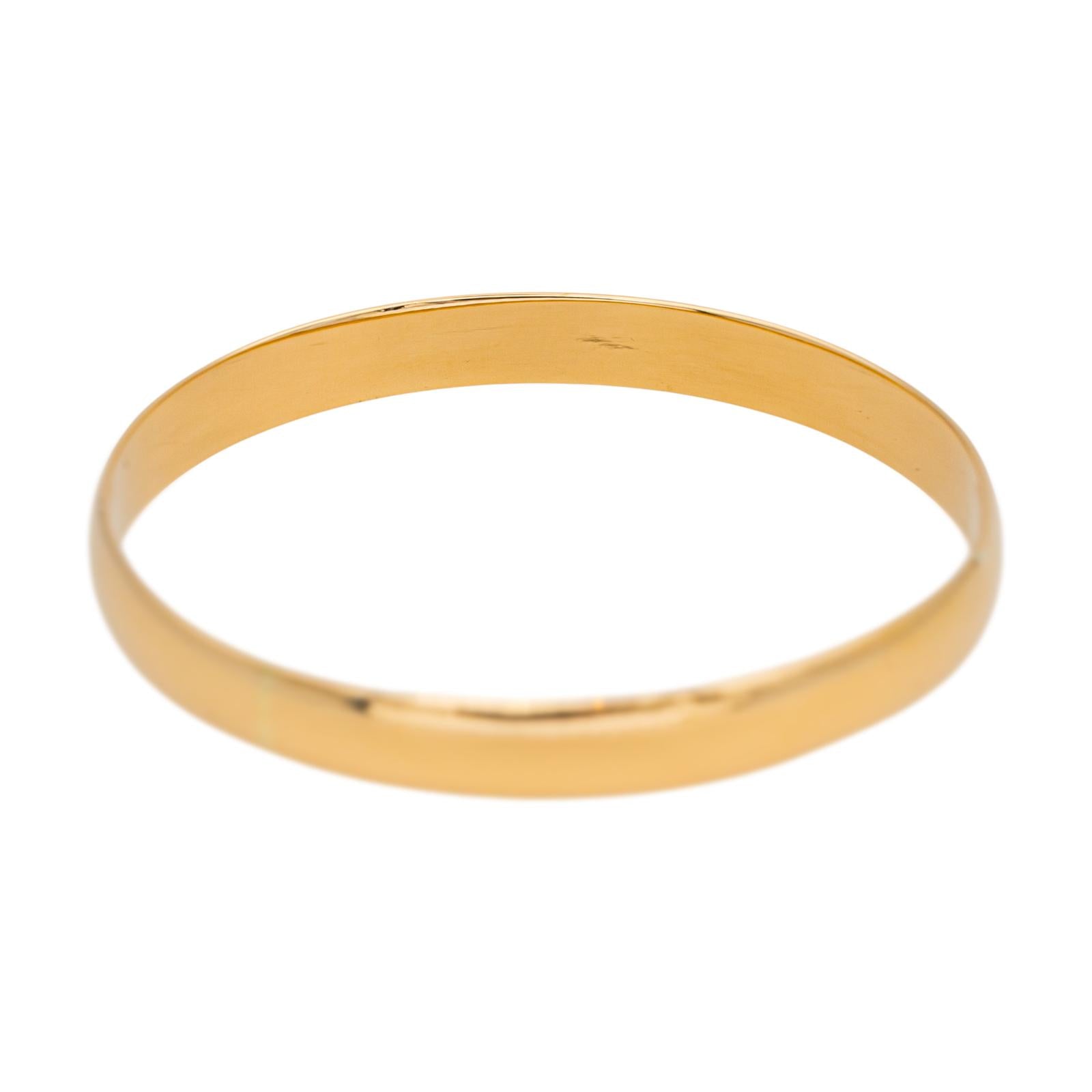 Bracelet jonc en or jaune 750 millièmes (18 carats), diamètre intérieur : 6,24 cm x 6,36 cm, largeur : 0,21 cm, tour de poignet : 21,00 cm, poids total : 35,85 g, poinçon tête d’aigle, très bon état
