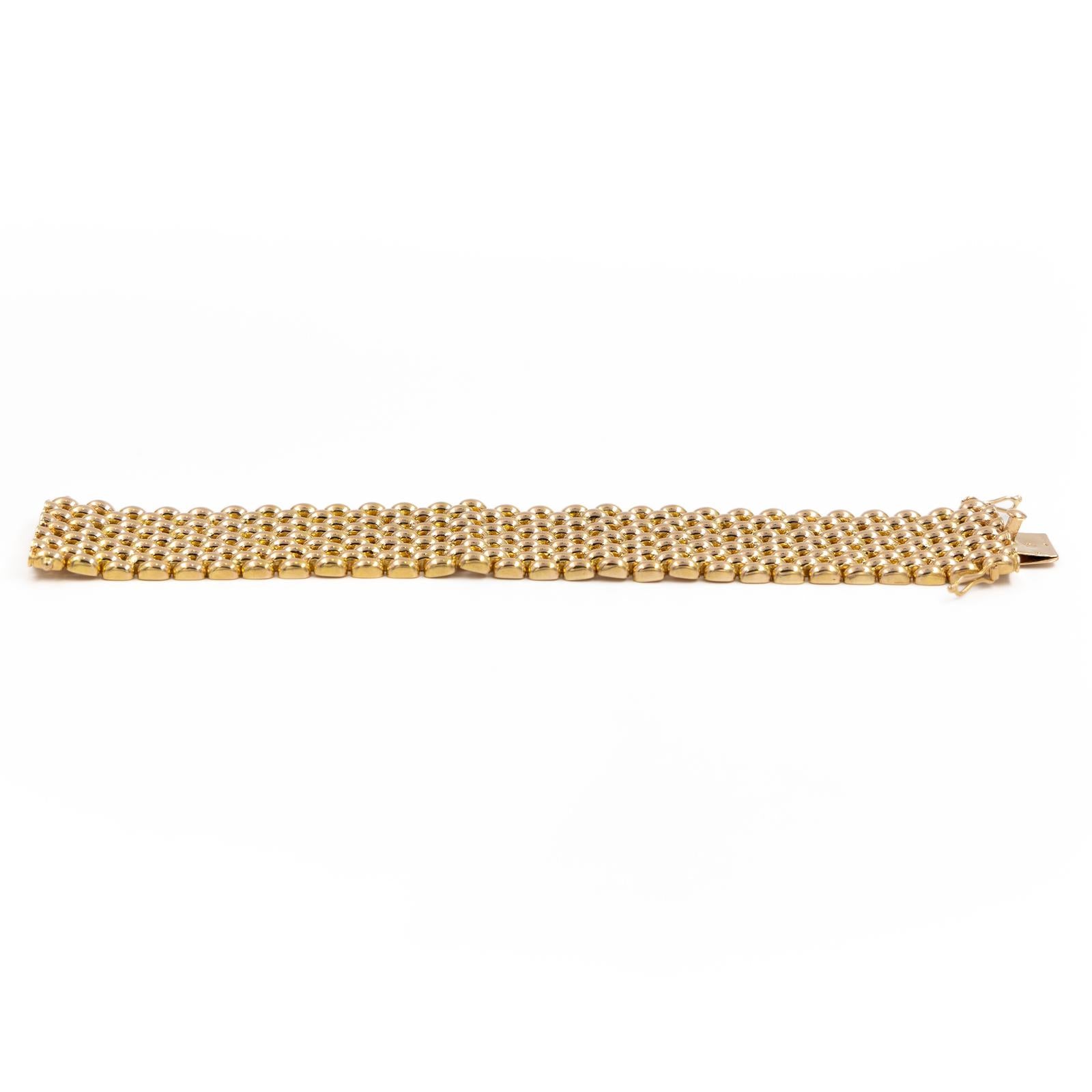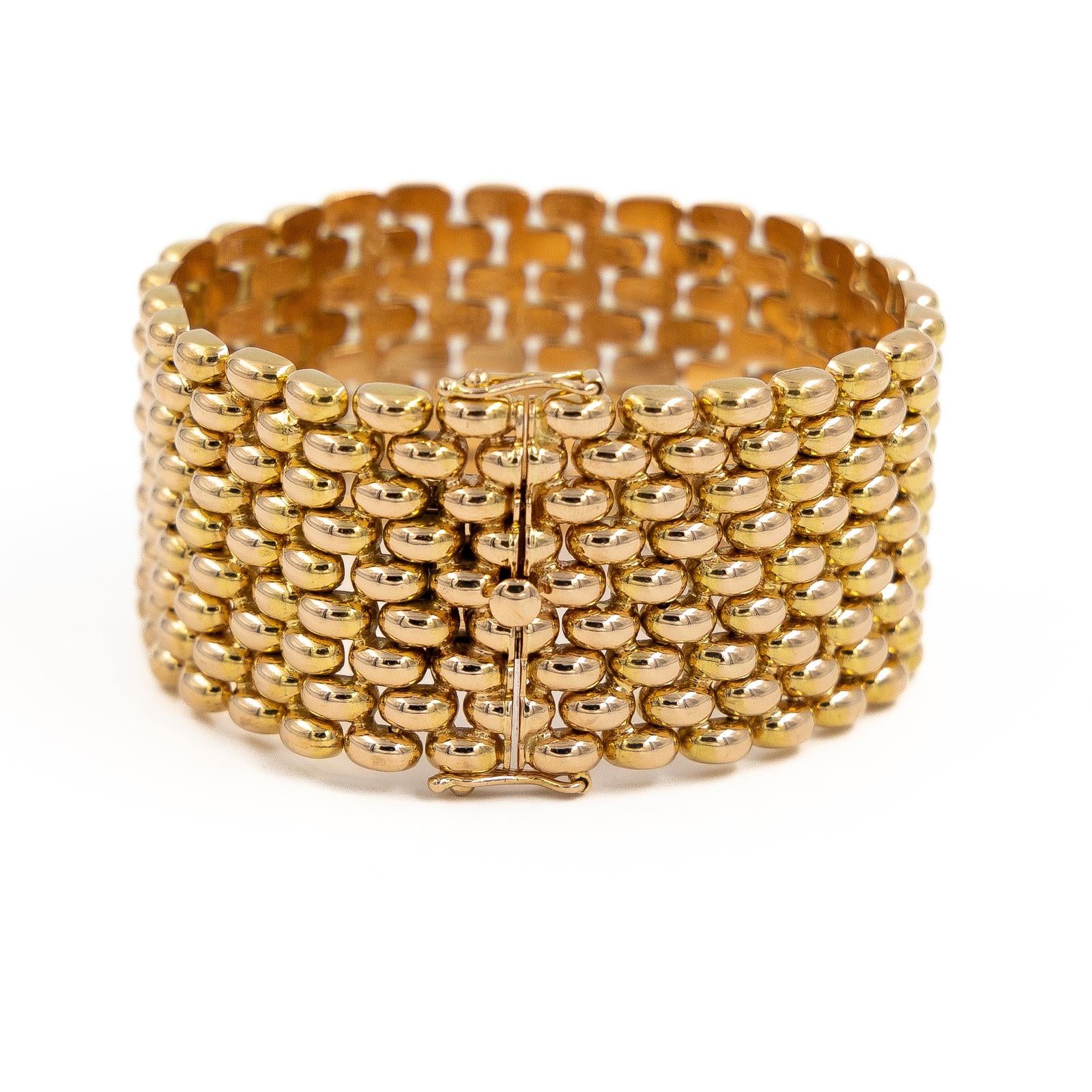 Bracelet manchette or jaune 750 millièmes (18 carats), maille grain de riz épaisse, longueur: 17,5 cm, largeur: 3 cm, poids total: 79,16 g, fermoir avec double huit de sécurité, poinçon rhinocéros, excellent état