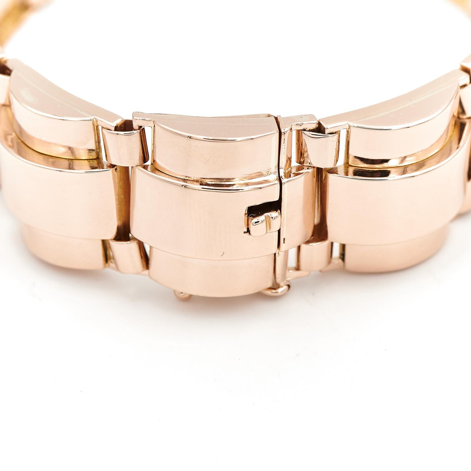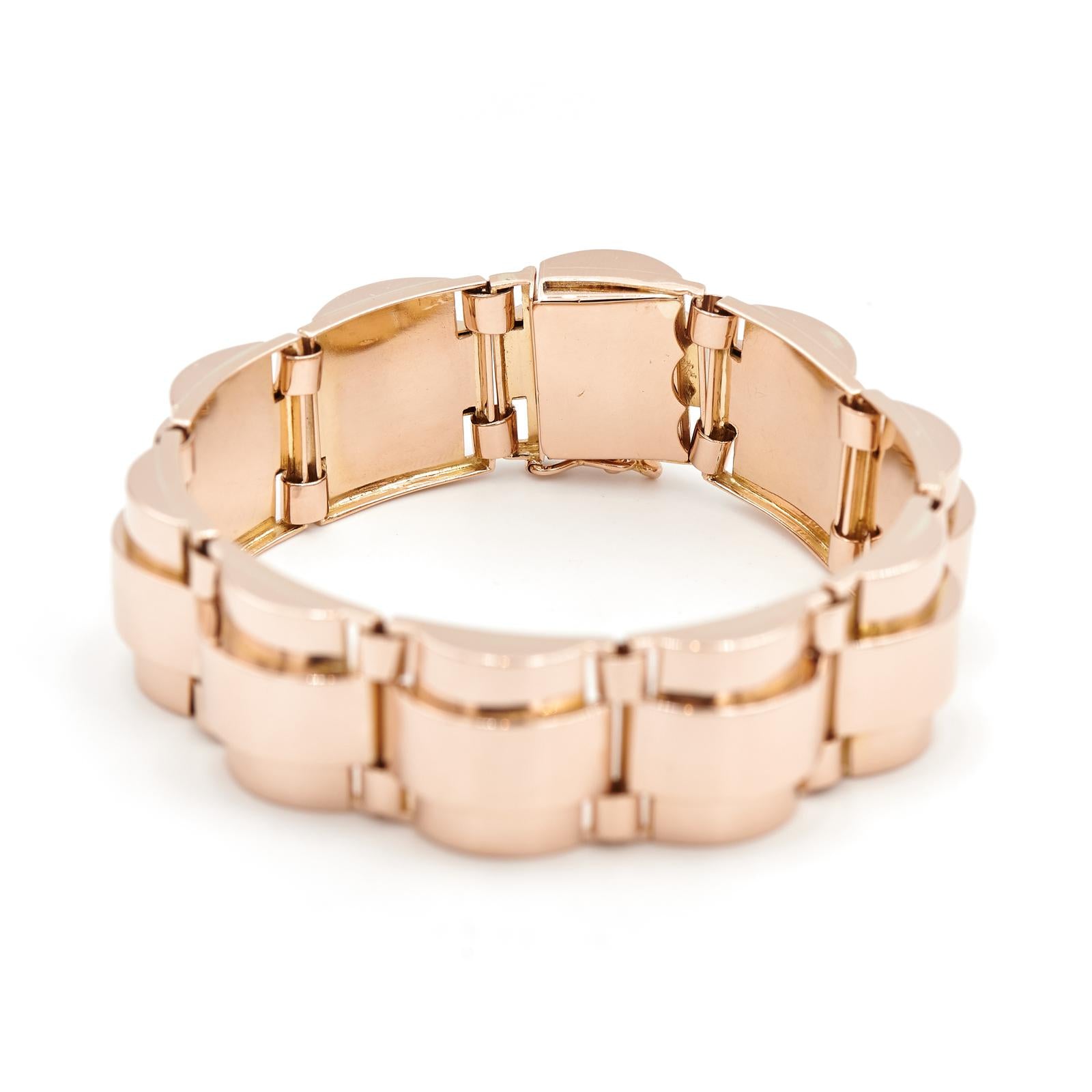 Bracelet tank en or rose 750 millièmes (18 carats), semi rigide, fermoir avec 8 de sécurité, longueur : 18,50 cm, largeur : 1,70 cm, poids total : 62,04 g, poinçon tête d'aigle, excellent état