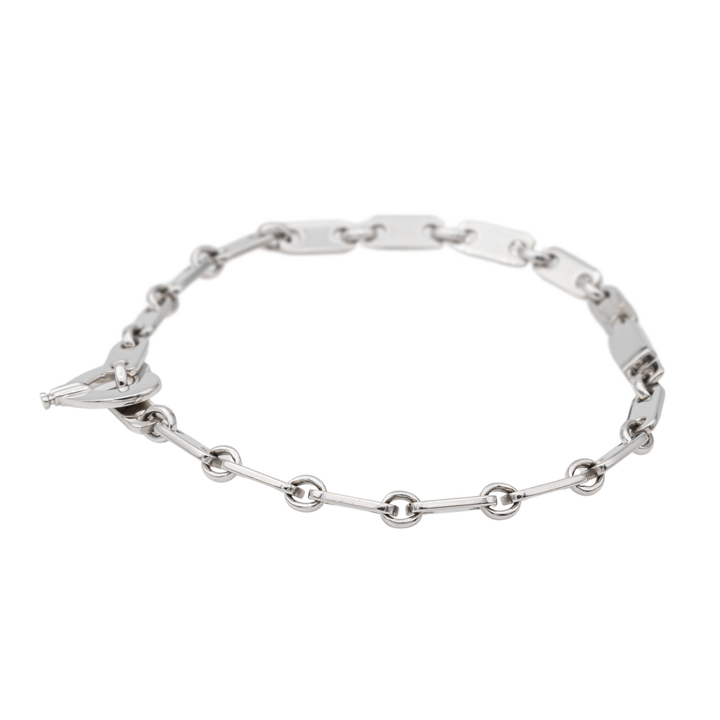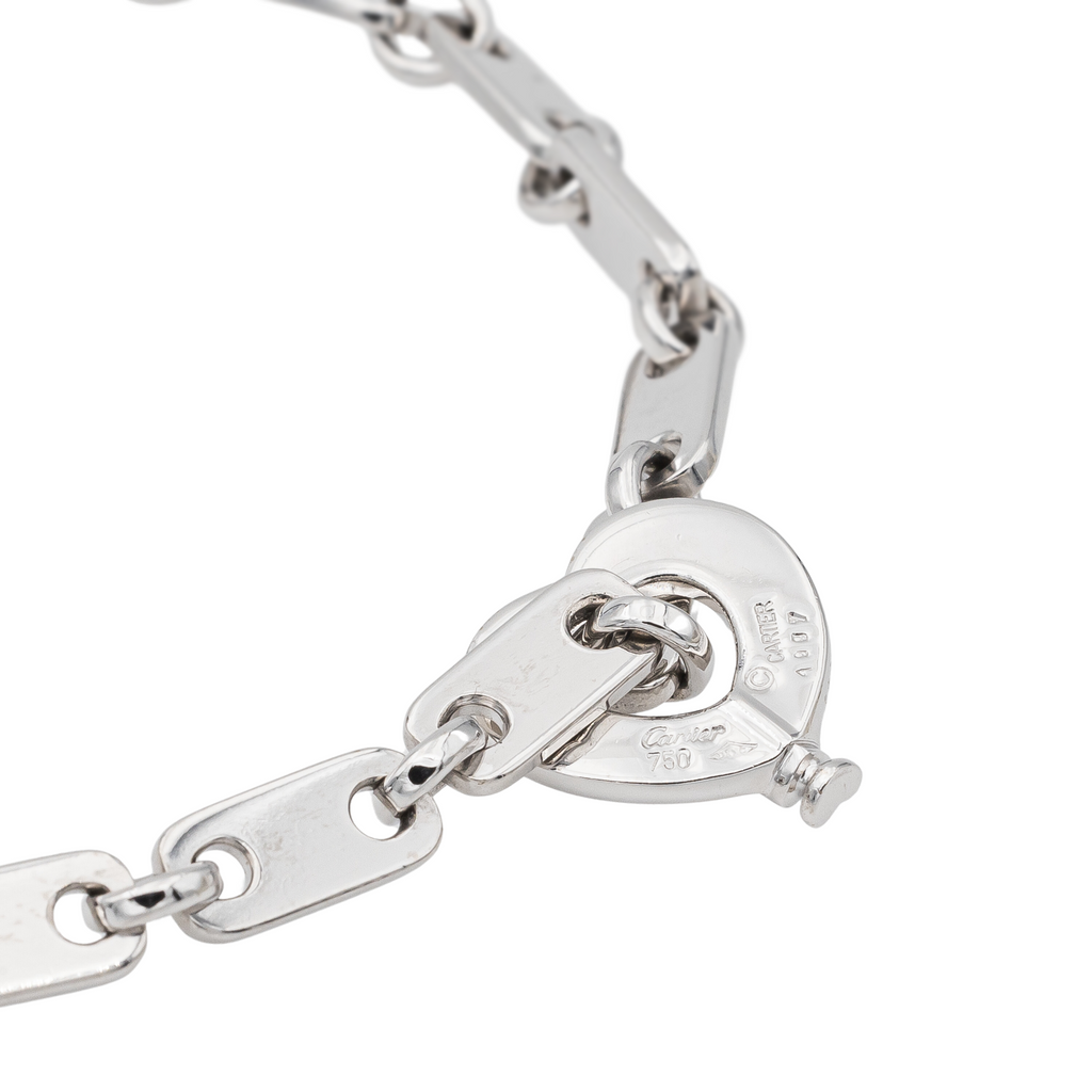 Bracelet signé de la Maison Cartier, en or blanc 750 millièmes (18 carats), Modèle Fidelity de 1997, Longueur du bracelet: 18 cm, Largeur : 0,48 cm, Dimensions d'un maillon : 1,09 x 0,48 cm, Dimensions du coeur: 1,46 x 1,39 cm, Le coeur sert de clef pour ouvrir le fermoir et est amovible, Signé et numéroté: K34487, Poids total: 22,49 g, Poinçon tête d'aigle, Excellent état