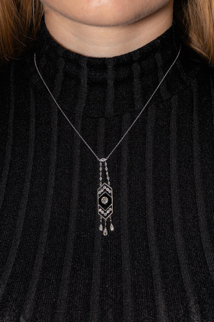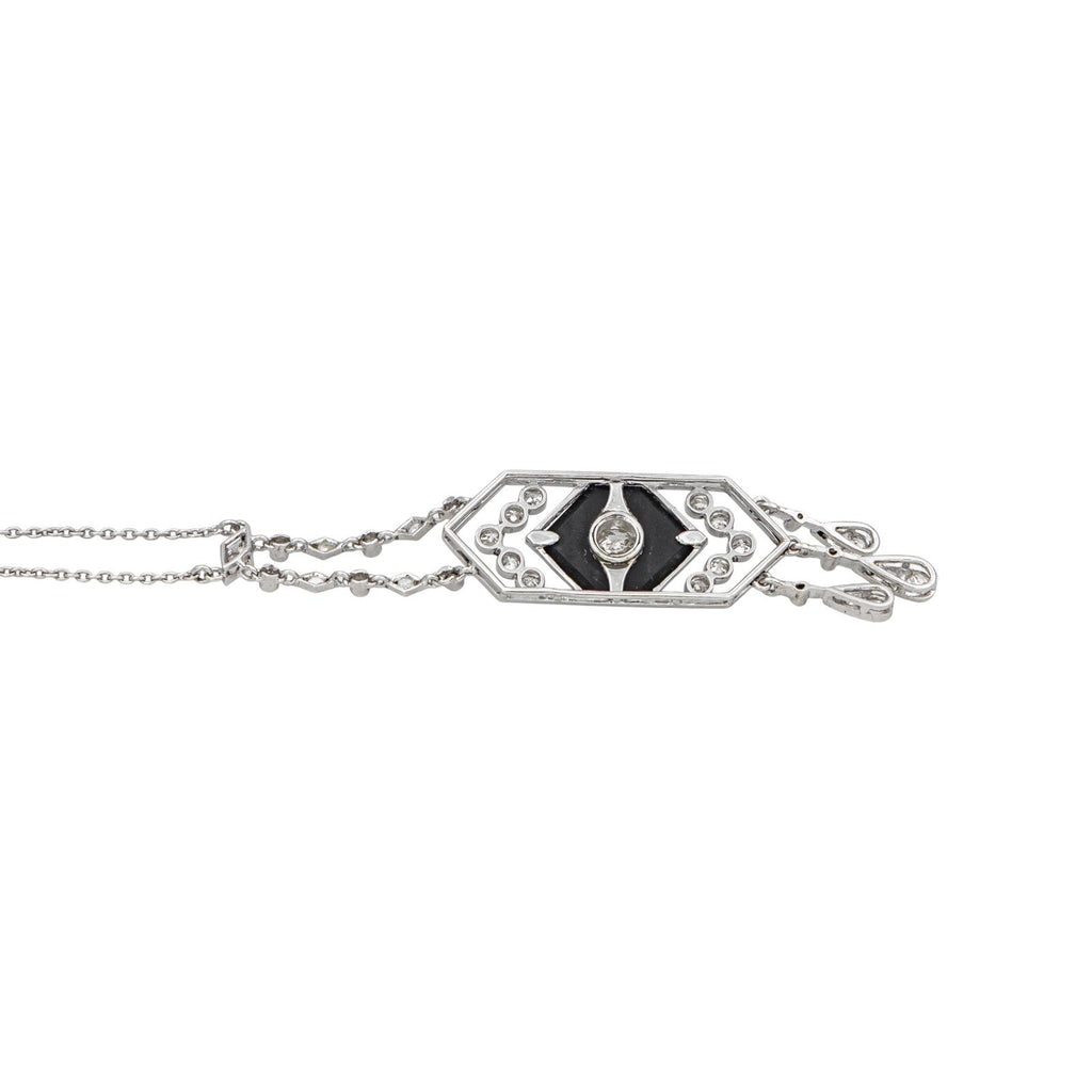 Collier art déco, en platine 950 millièmes, motifs géométriques sertis d'onyx et de diamants, un cabochon d'onyx, 31 diamants taille Ancienne, un diamant environ J-P, d'un poids d'environ 0,44 ct, un diamant environ K-P, d'un poids total d'environ 0,03 ct, 29 diamants environ H-SI, poids total diamants : environ 1,00 ct, (2 diamants d'un poids d'environ 0,025 ct, 10 diamants d'un poids d'environ 0,01 ct et 17 diamants d'un poids d'environ 0,005 ct), poids total de diamants environ 1,46 ct, maille forçat, longueur : 43,00 cm, largeur de la chaîne : 0,07 cm, longueur de la partie comprenant les motifs : 6,22 cm, largeur : 1,18 cm, poids total : 8,48 g, poinçon tête de chien, excellent état
