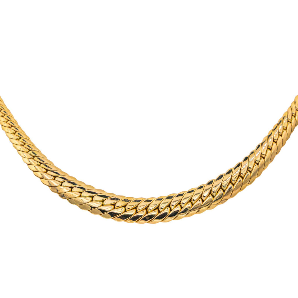 Chaîne en or jaune 750 millièmes (18 carats), maille anglaise, longueur : 45,00 cm, largeur : 0,85 cm à 0,41cm en chute, poids total : 18,62 g, poinçon tête d’aigle, excellent état