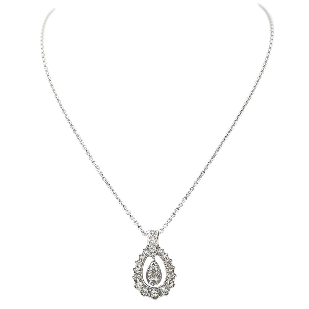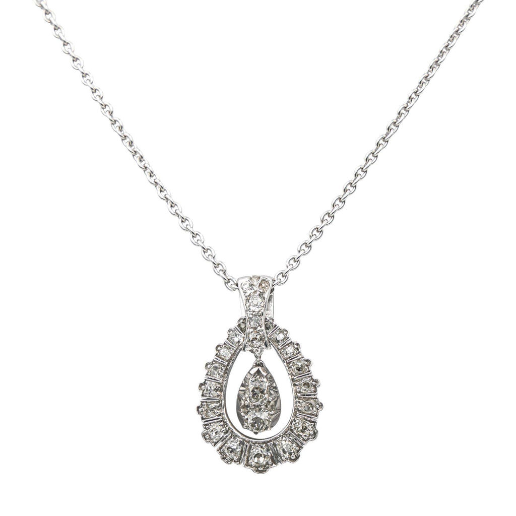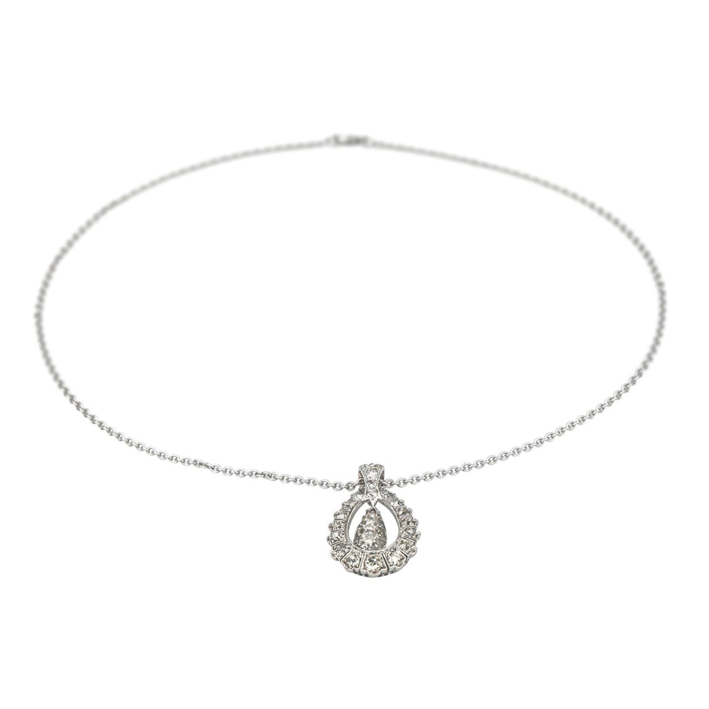 Collier en or blanc 750 millièmes (18 carats) testé, sertie de 26 diamants, taille ancienne, 3 diamants environ I-P, d'un poids total d'environ 0,73 ct, (2 diamants d'un poids d'environ 0,33 ct, un diamant d'un poids d'environ 0,07 ct), 7 diamants environ J-SI, d'un poids total d'environ 0,71 ct, (un diamant d'un poids d'environ 0,15 ct, 2 diamants d'un poids d'environ 0,10 ct, 4 diamants d'un poids d'environ 0,09 ct), 16 diamants environ H-SI, d'un poids total d'environ 1,28 ct, (chaque diamants d'un poids d'environ 0,08 ct), poids total diamants environ : 2,72 cts, maille forçat, longueur : 45,00 cm, largeur de la chaîne : 0,15 cm, dimensions du pendentif : 3,15 cm x 2,01 cm, poids total : 12,93 g, excellent état