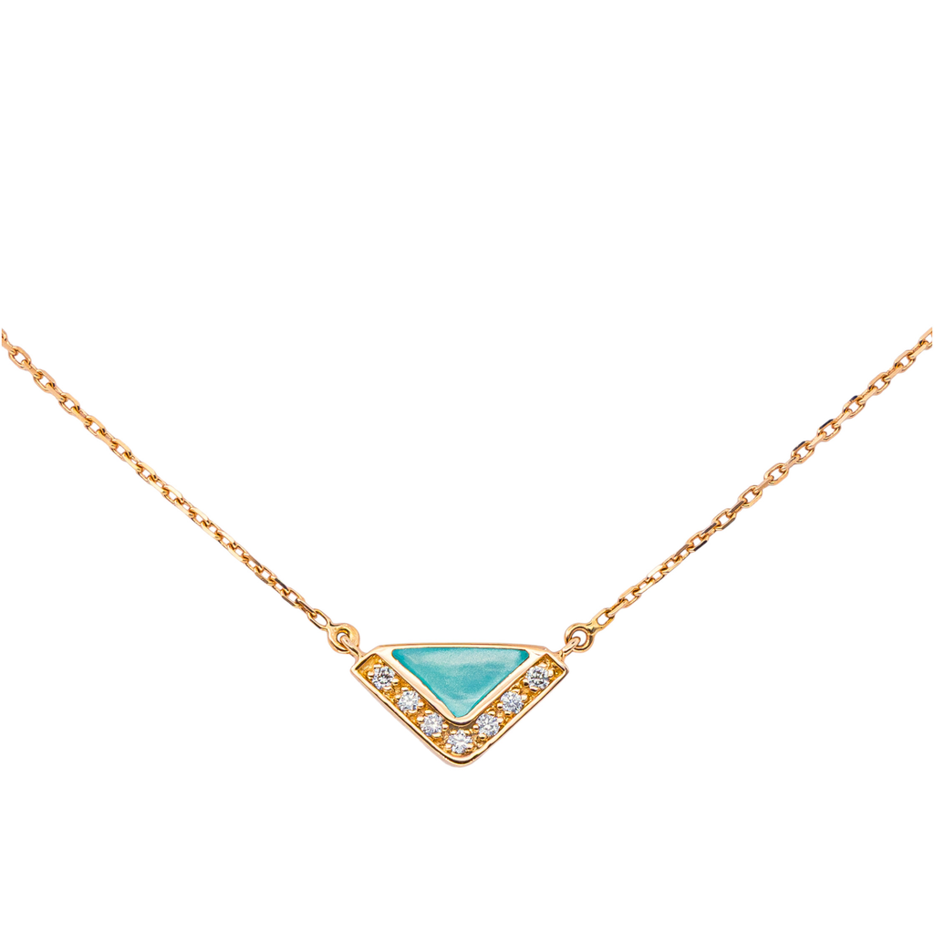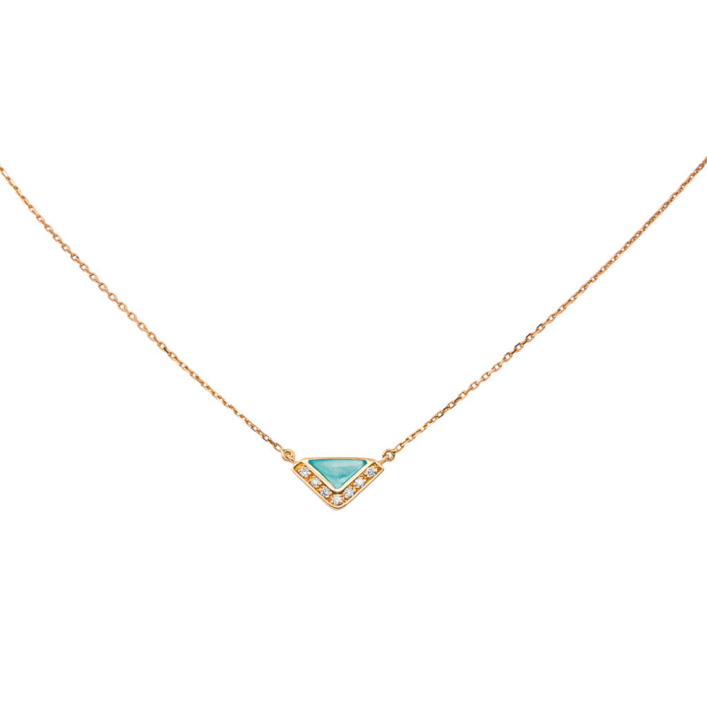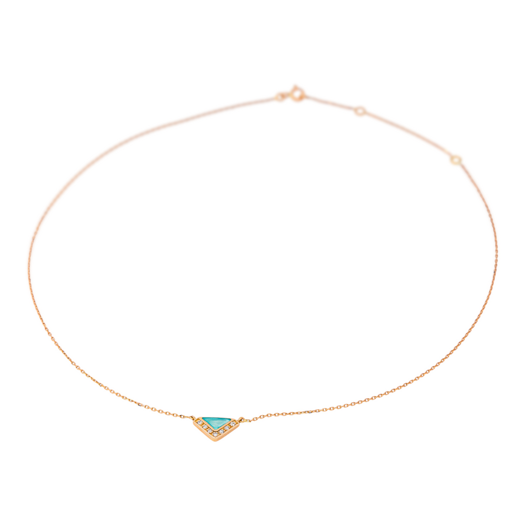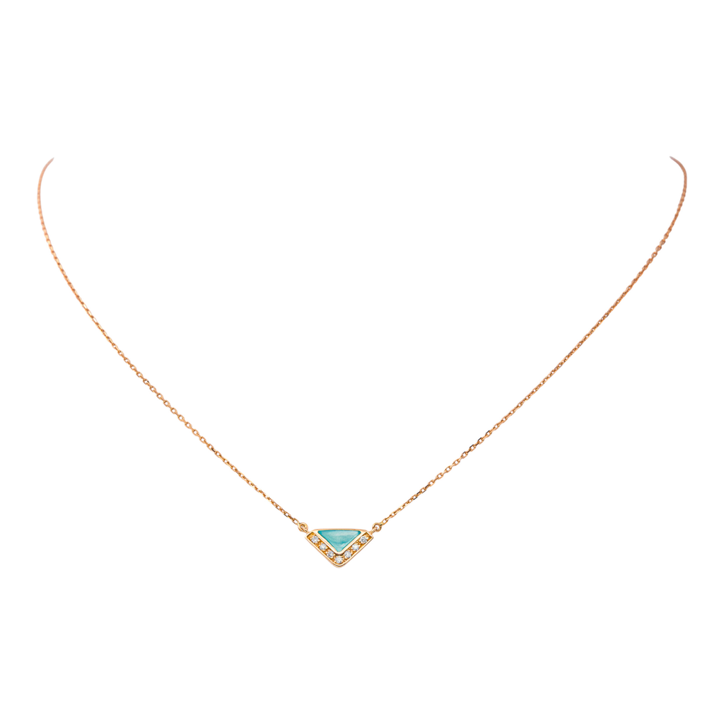 Collier en or rose 750 millièmes (18 carats) testé, motif géométrique serti de résine bleue et de 7 diamants, taille brillant, environ H-VS, d'environ 0,01 ct chacun, poids total diamant : 0,07 ct, maille forçat, longueur : 42 cm, largeur de la chaîne : 0,10 cm, longueur de la partie comprenant les motifs : 1,23 cm, largeur : 0,70 cm, poids total : 2,49 g, excellent état