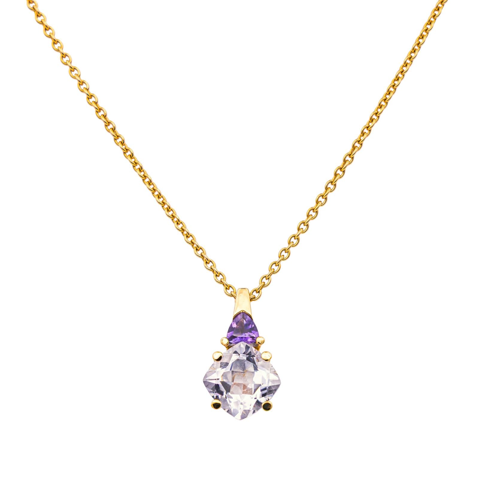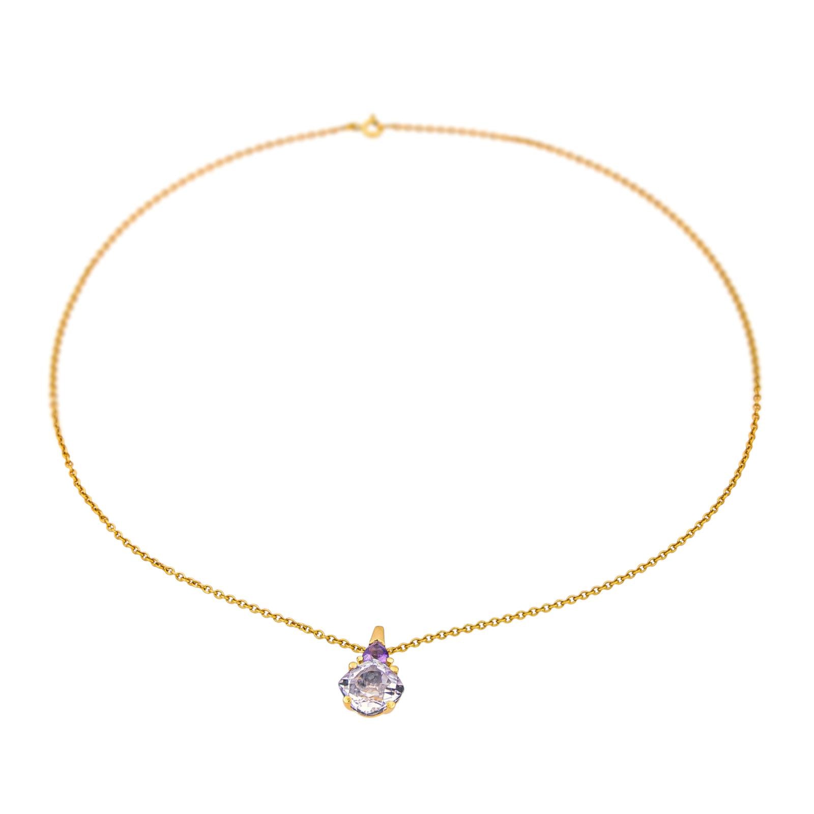 Collier en or jaune 750 millièmes (18 carats) sertis d'améthystes, 1 améthyste taille coussin d'un poids total d'environ 5,79 cts et 1 améthyste taille coeur d'un poids total d'environ 0,25 ct, maille jaseron, longueur : 46 cm, largeur de la chaîne : 0,10 cm, longueur de la partie comprenant les motifs : 2 cm, largeur : 1,18 cm, poids total : 8,32 g, poinçon hibou, excellent état