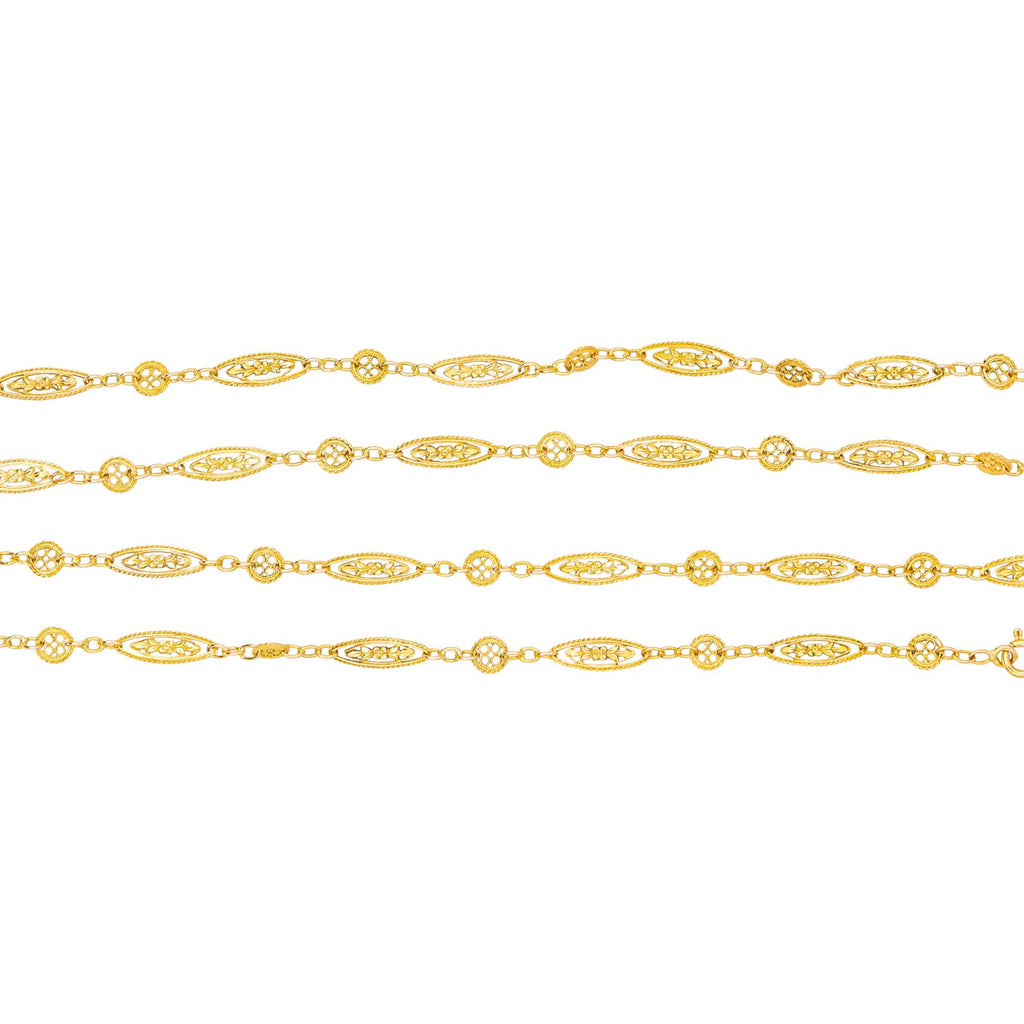 Sautoir en or jaune 750 millièmes (18 carats), maille filigrane, longueur : 120,00 cm, largeur : 0,68 cm, poids total : 35,14 g, poinçon tête d’aigle, excellent état