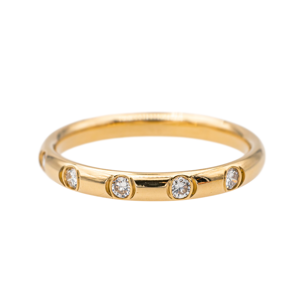 Alliance en or jaune 750 millièmes (18 carats), sertie de 5 diamants taille brillant environ H/VS, d'environ 0,035 ct chacun, poids total diamants: environ 0,175 ct, largeur sur le dessus: 0,25 cm, tour de doigt: 51, poids total: 2,57 g, poinçon tête d'aigle, excellent état