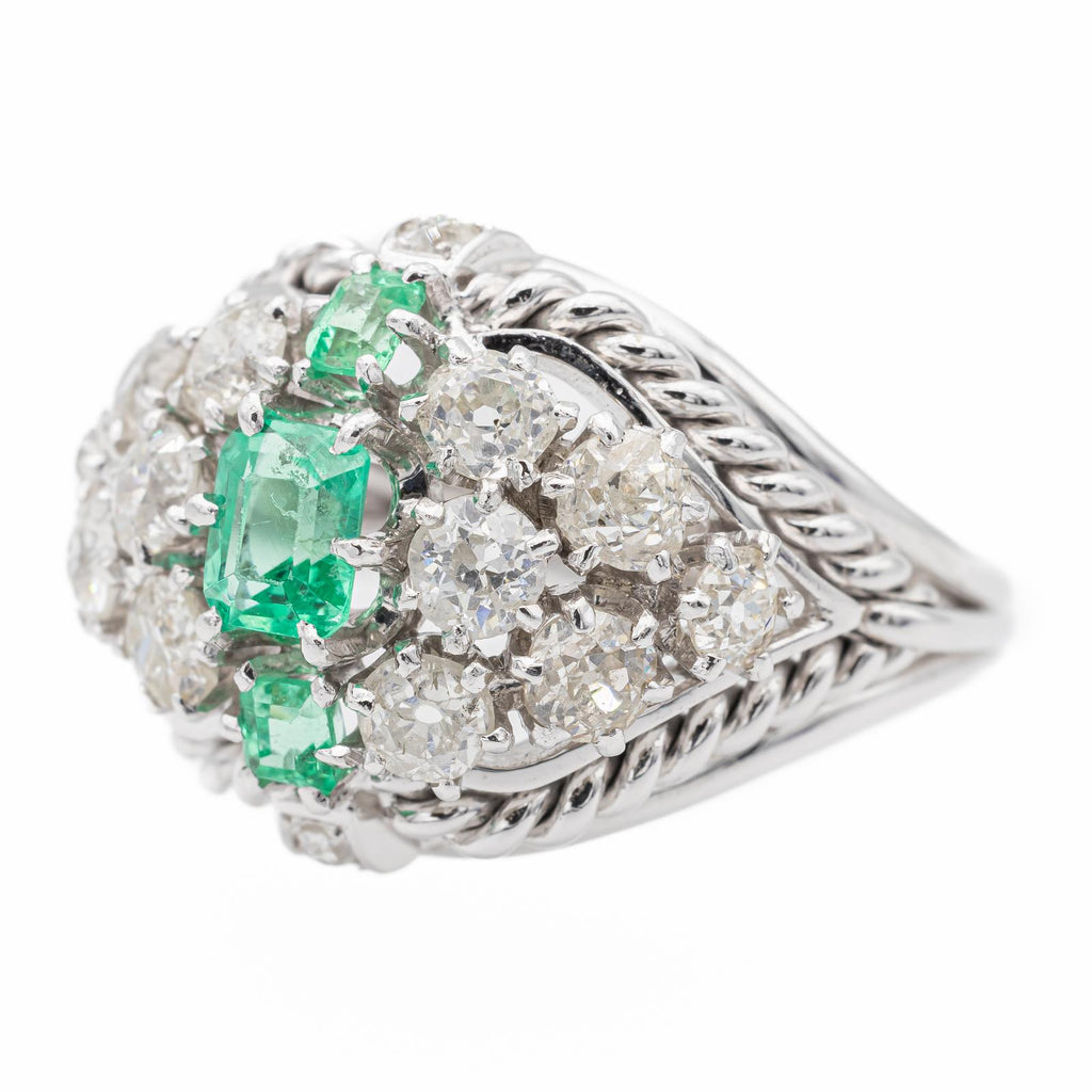 Bague Cocktail Rétro en or blanc 750 millièmes (18 carats) et platine 950 millièmes, sertie de 3 émeraudes taille émeraude, poids de l'émeraude centrale: environ 0,34 ct, poids de chacune des 2 plus petites émeraudes: environ 0,08 ct, poids total des émeraudes: environ 0,50 ct, 14 diamants taille ancienne, estimés I/I, d'un poids total d'environ 1,72 cts, poids de chacun des 12 diamants sur le dessus de la bague: environ 0,14 ct, poids de chacun des 2 plus petits diamants: environ 0,02 ct, largeur sur le dessus: 2,06 cm, tour de doigt: 54, poids total: 12,48 g, poinçon tête d'aigle et poinçon tête de chien, excellent état