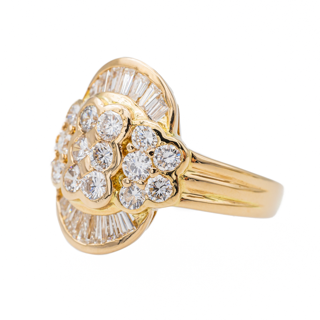 Bague en or jaune 750 millièmes (18 carats), sertie de diamants, 16 diamants taille brillant, environ H-VS, d'un poids total d'environ 1,44 cts, (8 diamants d'un poids d'environ 0,10 ct et 8 diamants d'un poids d'environ 0,08 ct), entourés de 14 diamants taille baguette, environ I-VS, d'un poids total d'environ 0,84 ct, (chaque diamant d'un poids d'environ 0,06 ct), largeur sur le dessus : 1,95 cm, tour de doigt : 58, poids total : 8,35 g, poinçon hibou, excellent état