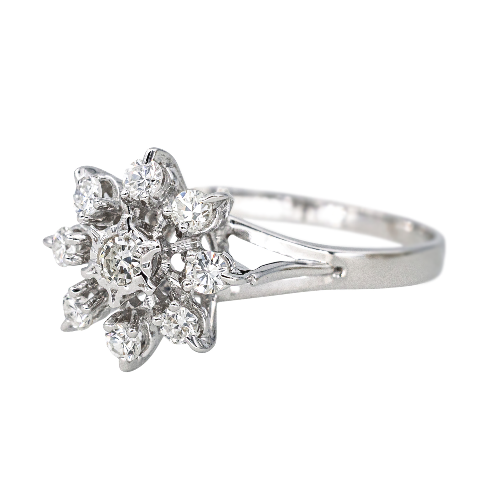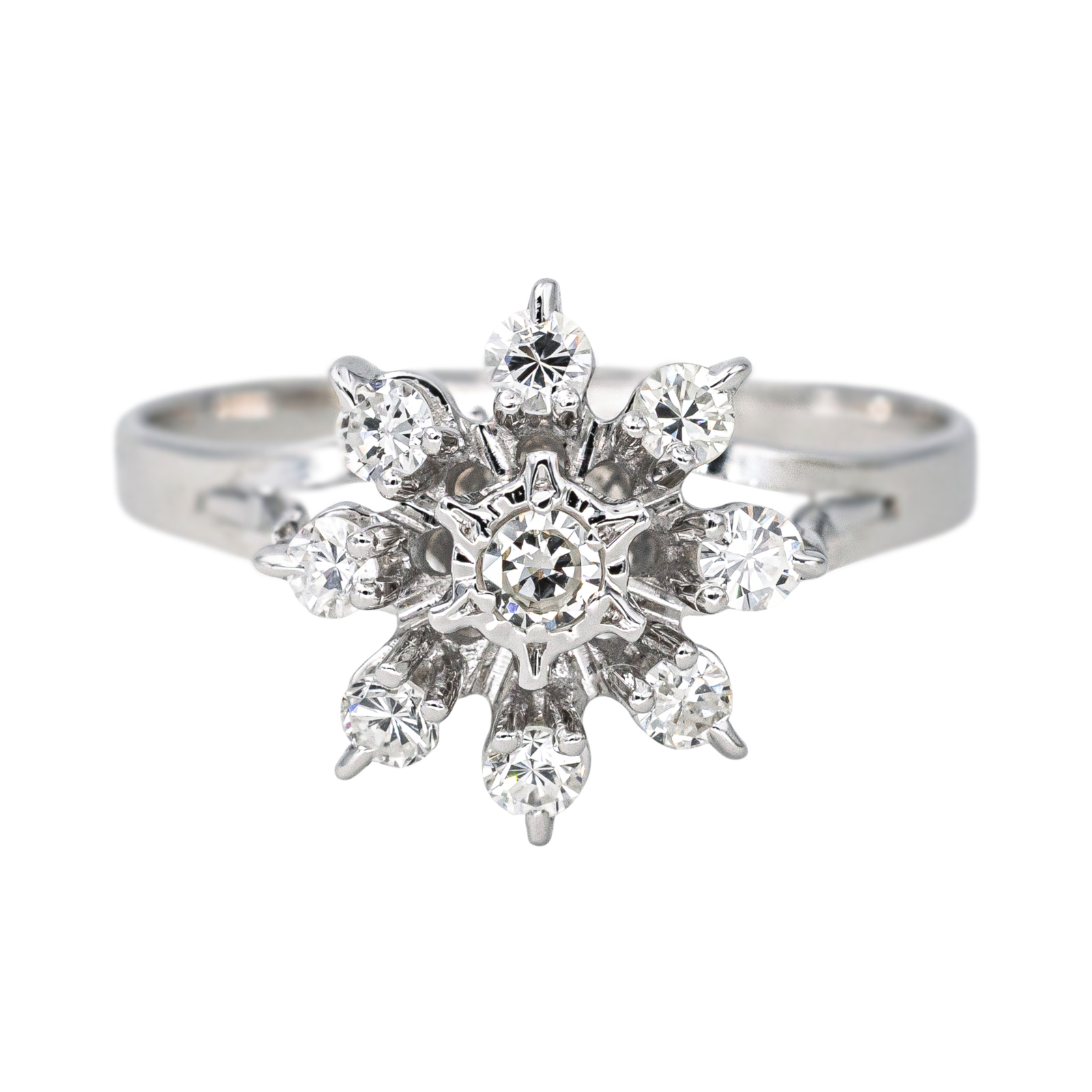 Bague marguerite en or blanc 750 millièmes (18 carats), pavée de diamants, 1 diamants taille brillant, environ I-VS, d'un poids total d'environ 0,08 ct, entouré de 8 diamants taille brillant, environ H-VS (chaque diamant d'un poids d'environ 0,02 ct), poids total diamant : 0,24 ct, largeur sur le dessus : 1,14 cm, tour de doigt : 54, poids total : 2,41 g, poinçon tête d'aigle, excellent état