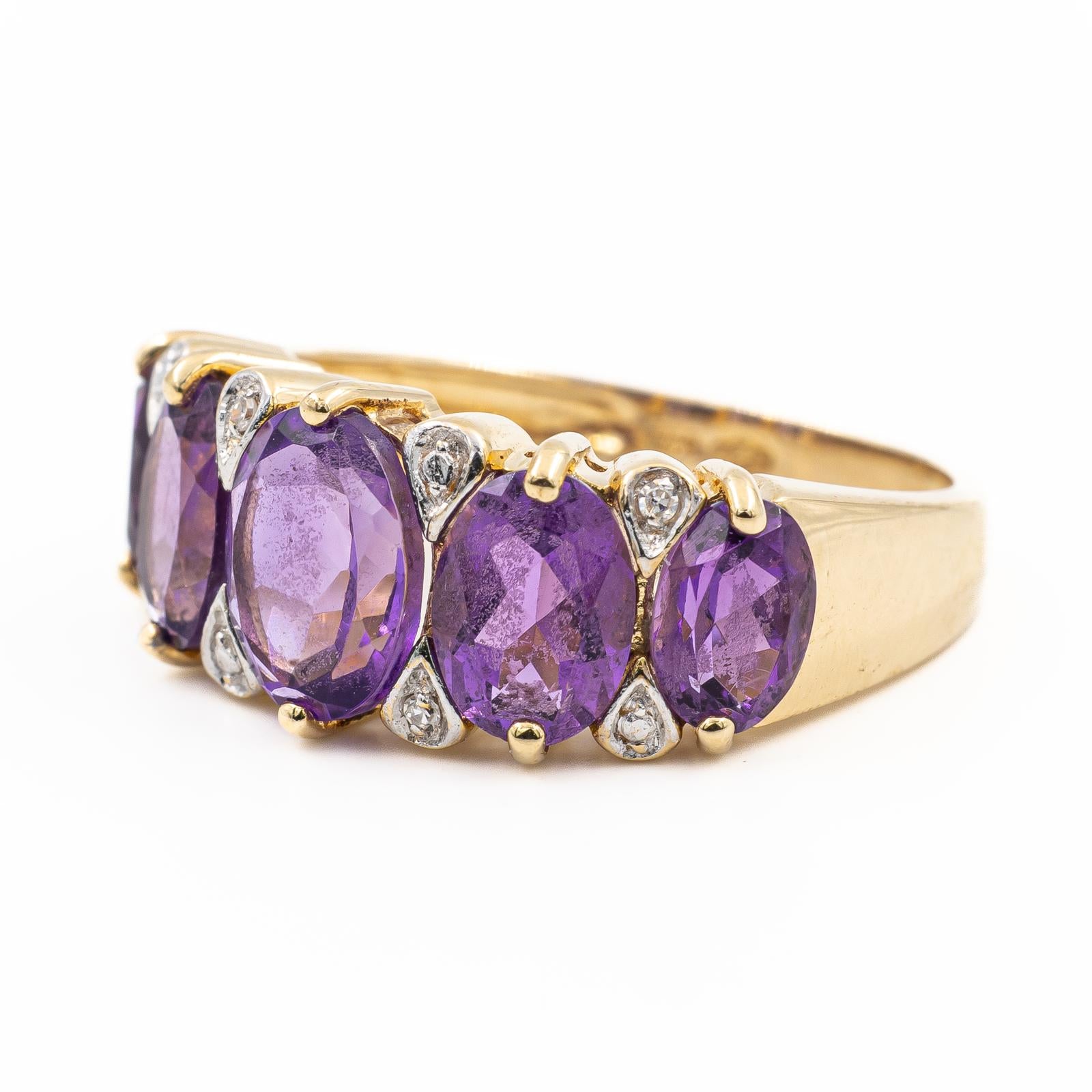 Bague bandeau sertie d' améthystes et de diamants, en jaune 750 millièmes (18 carats), améthystes taille ovale, d'un poids total d'environ 2,19 cts, (1 d'environ 0,99 ct, 2 d'environ 0,60 ct, et 2 d'environ 0,38 ct), et 8 diamants taille brillant, environ G/VS, d'un poids total d'environ 0,08 ct, (chaque diamant d'un poids d'environ 0,01 ct), largeur sur le dessus: 0,9 cm, taille de doigt: 53, poids total: 4,63 g, poinçon tête d'aigle, excellent état