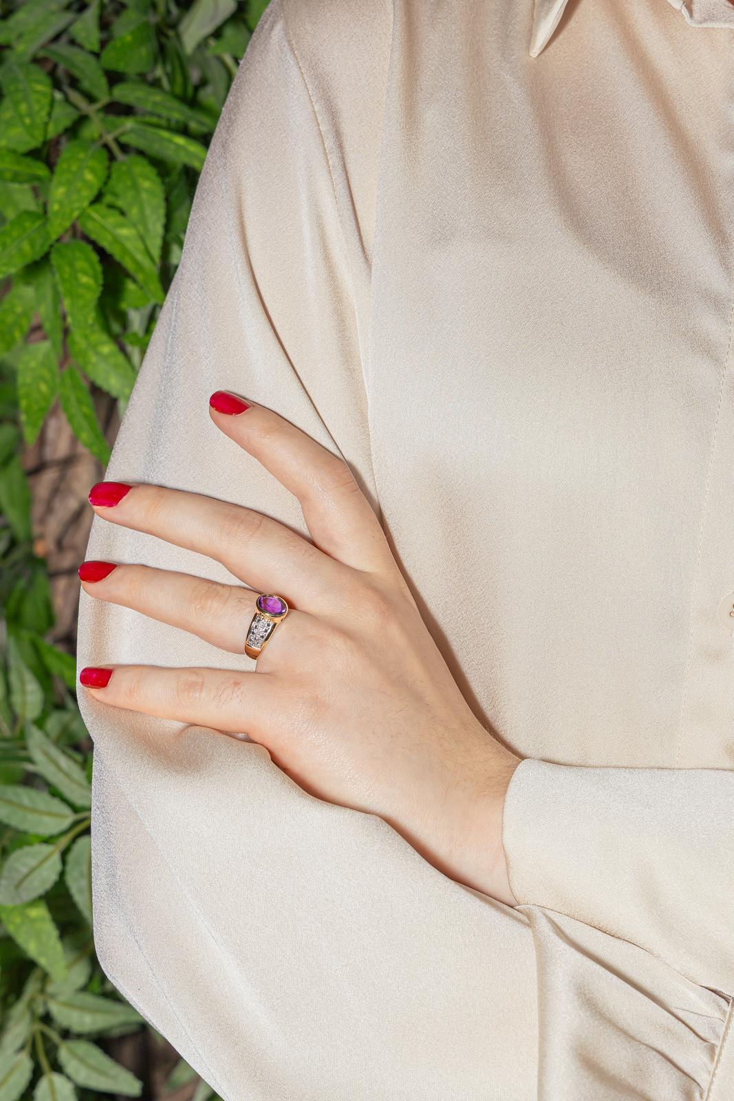Bague en or jaune 750 millièmes (18 carats), sertie d'une améthyste et de diamants, 1 améthyste taille ovale, d'un poids total d'environ 1,46 ct, entourée de 4 diamants demi-taille, environ I-SI, d'un poids total d'environ 0,008 ct, (chaque diamant d'un poids d'environ 0,002 ct), largeur sur le dessus : 1 cm, tour de doigt : 53, poids total : 3,87 g, poinçon tête d'aigle, excellent état