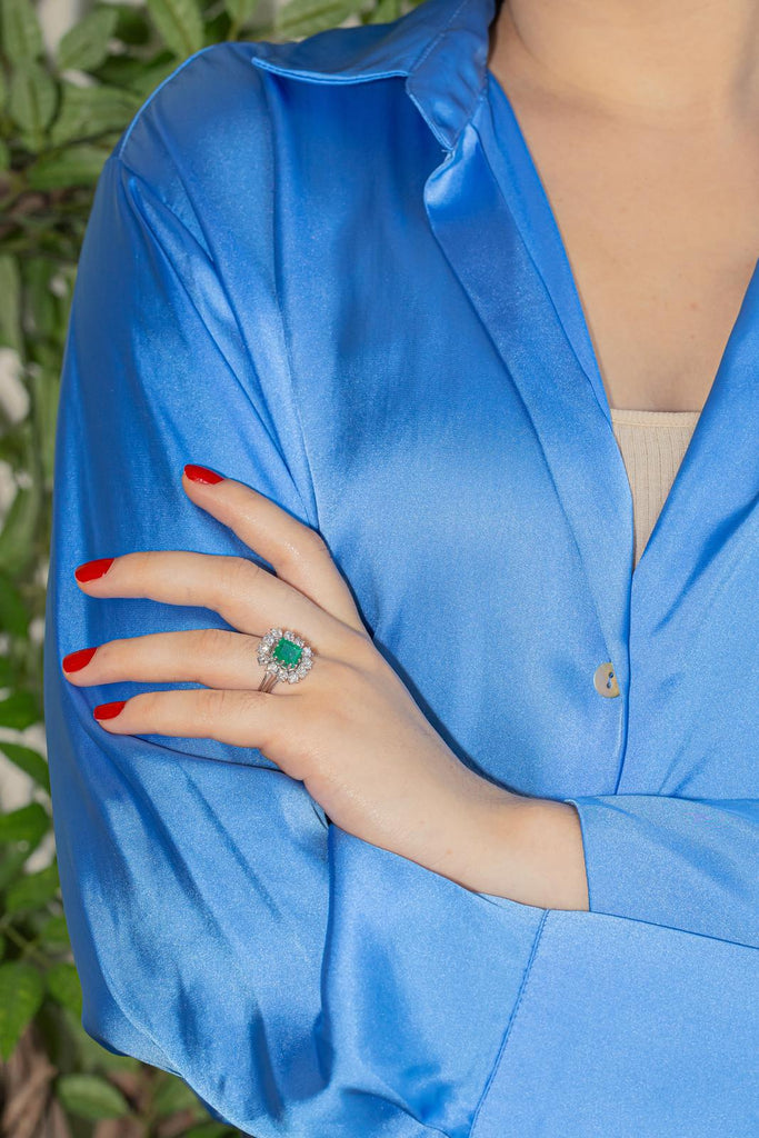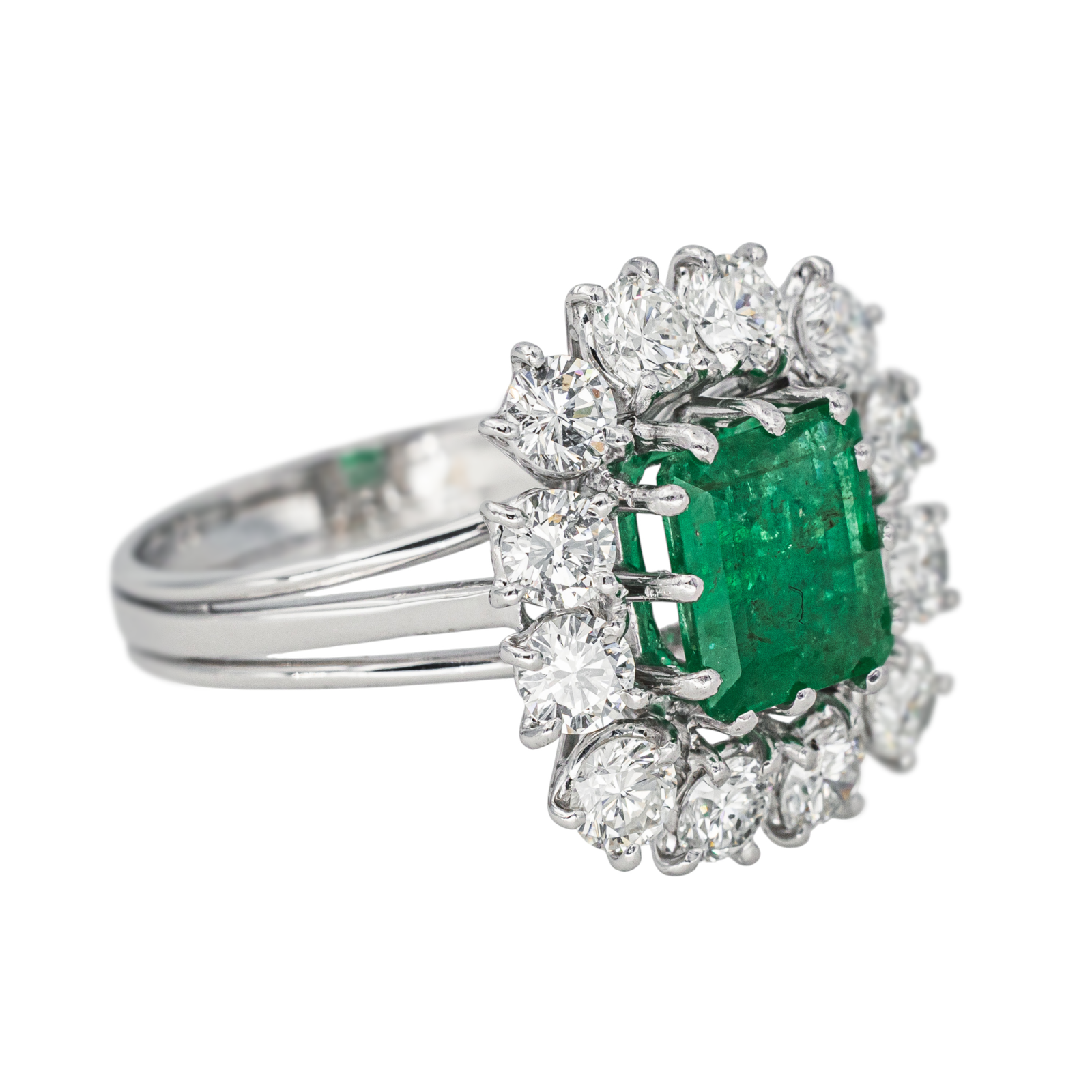 Bague Pompadour en or blanc 750 millièmes (18 carats), sertie d'une émeraude et de diamants, une émeraude taille émeraude, d'un poids total d'environ 1,59 cts, entourée de 12 diamants taille brillant, environ H-SI, d'un poids total d'environ 1,56 cts, (chaque diamant d'un poids d'environ 0,013 ct), largeur sur le dessus : 1,80 cm, tour de doigt : 57, poids total : 6,80 g, poinçon hibou, excellent état