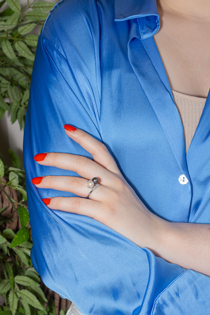 Bague en or blanc 750 millièmes (18 carats), sertie de perles et de diamants, 2 perles de culture, dimensions : 7,35 x 7,20 mm, entourées de 10 diamants taille ancienne, environ G/VS, d'un poids total d'environ 0,40 ct, (chaque diamant d'un poids d'environ 0,04 ct), largeur sur le dessus : 1,15 cm, tour de doigt : 51, poids total : 4,36 g, poinçon tête d'aigle, excellent état