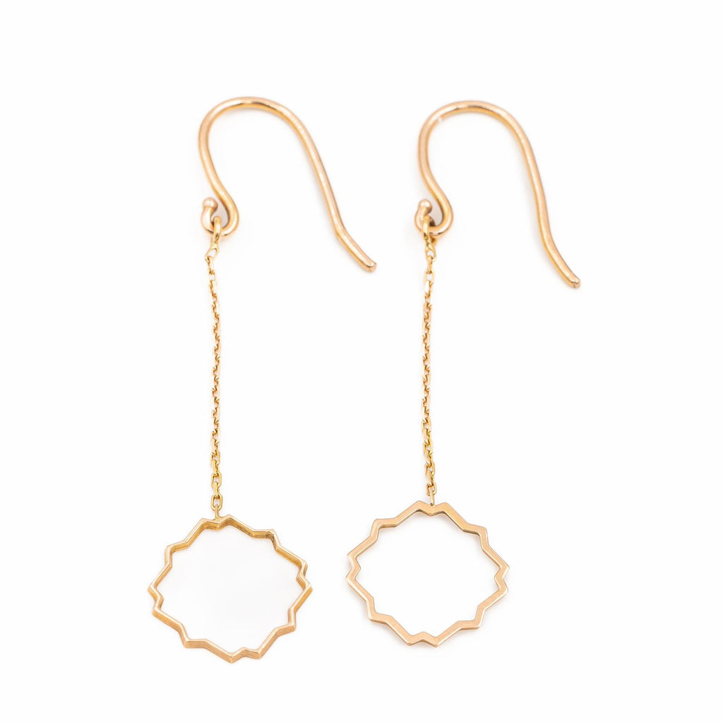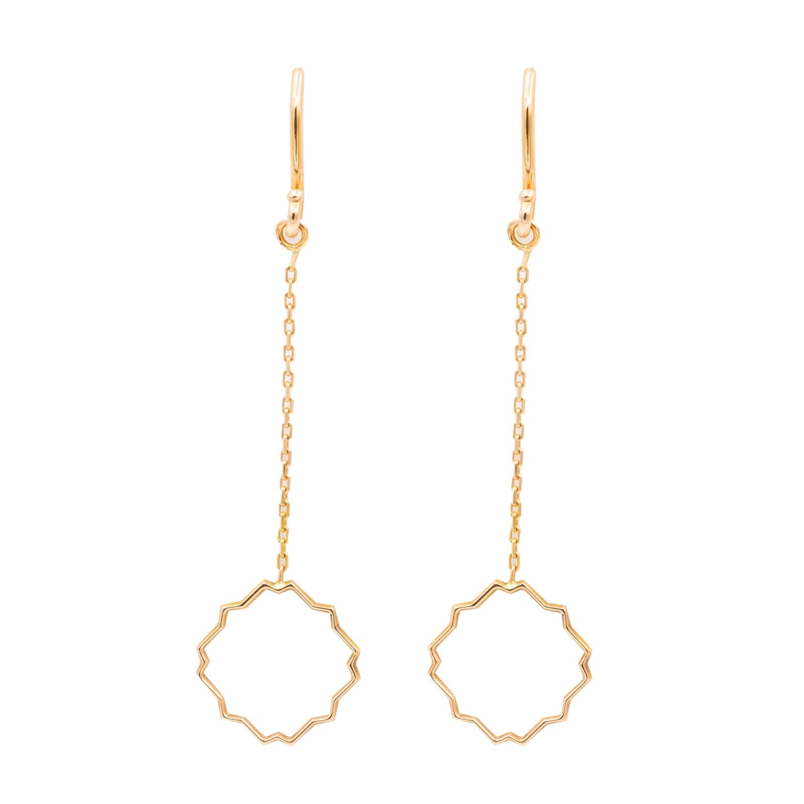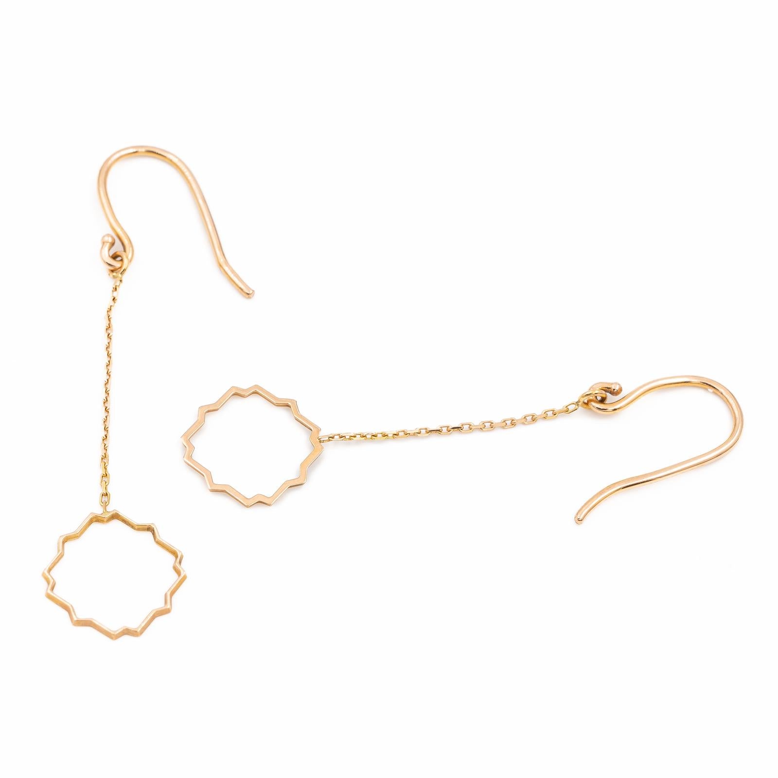 Dangling earrings in 750 thousandths (18 carat) pink gold, graphic motif in transparency suspended from a cable chain, dimensions of the motif: 1 cm x 1 cm, width of the chain: 0.7 mm, total length: 4 cm, total weight: 0.82 g, eagle's head hallmark, new condition, Internet exclusive