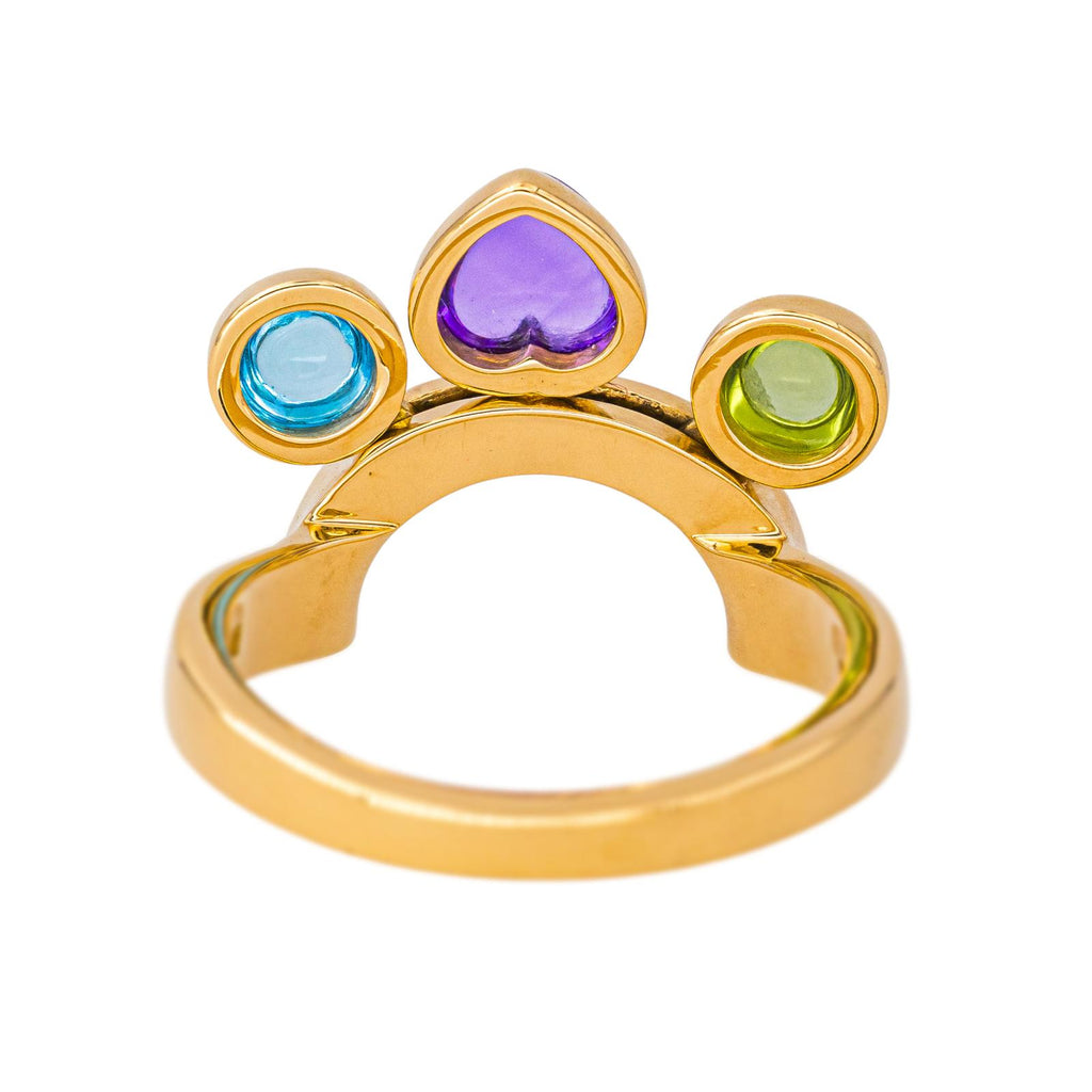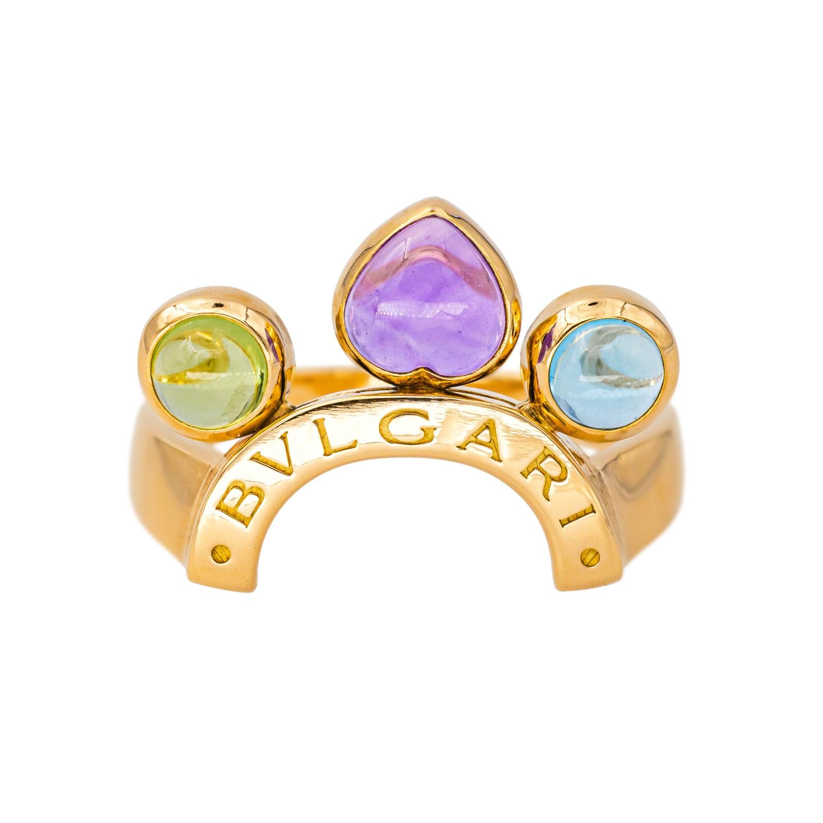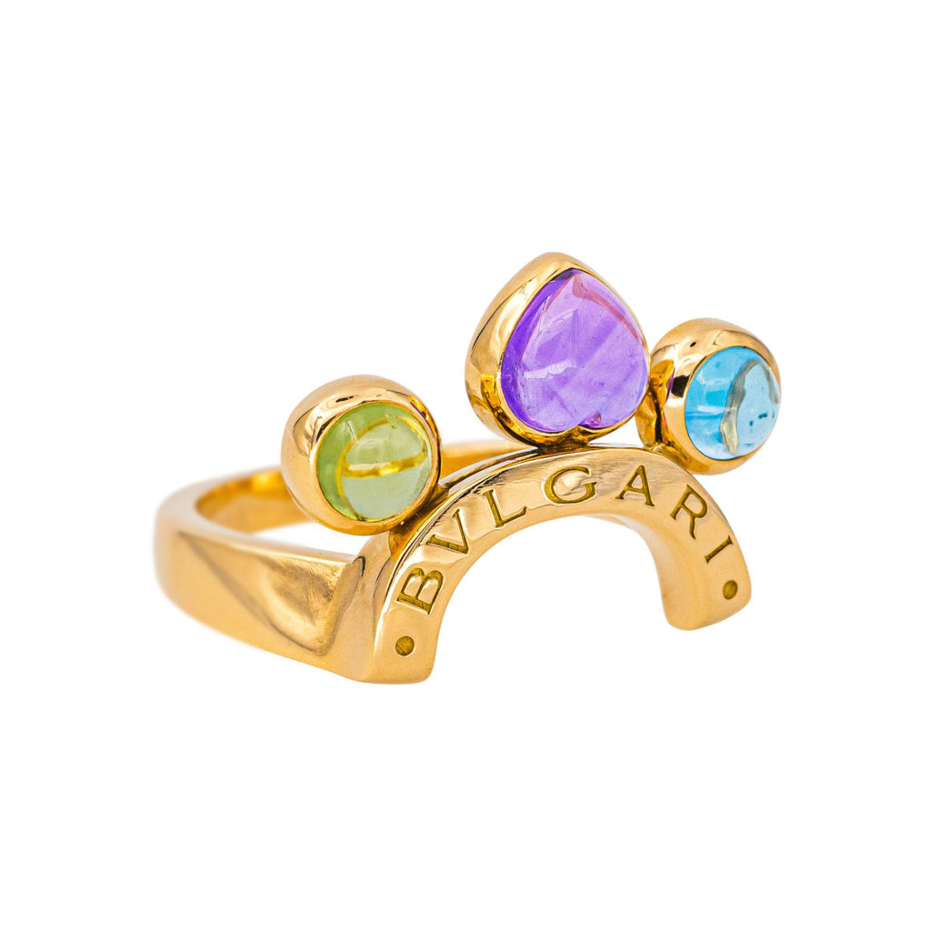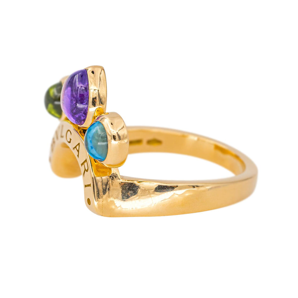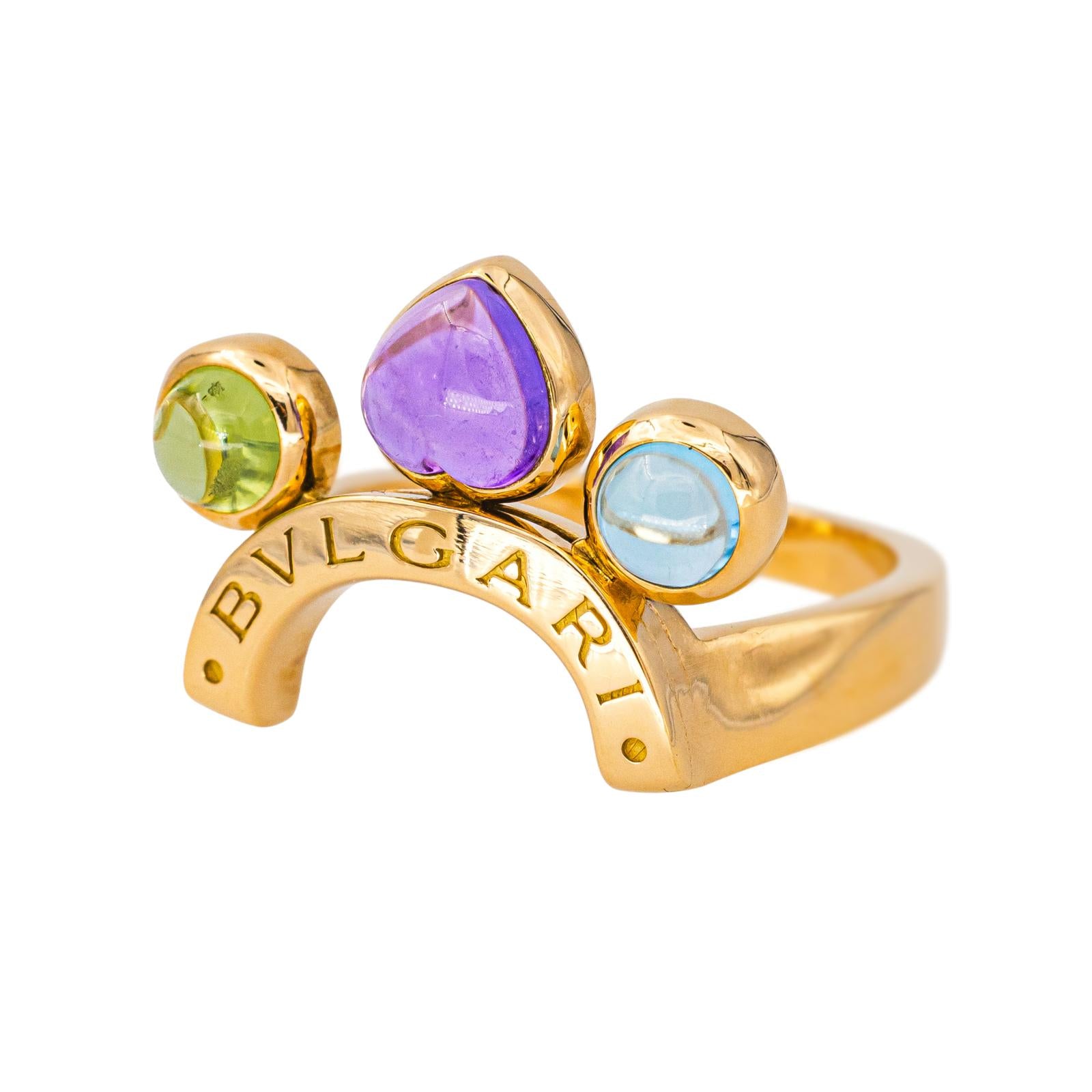 Bague en or jaune 750 millièmes (18 carats) signée de la maison Bulgari, modèle Allegra, sertie d'une améthyste taille cabochon d'un poids total d'environ 1,02 ct, d'un péridot taille cabochon d'un poids total d'environ 0,73 ct et d'une topaze taille cabochon d'un poids d'environ 0,67 ct, largeur sur le dessus : 1,62 cm, tour de doigt : 61, poids total : 9,41 g, numérotée : 1970AL, poinçon hibou, excellent état