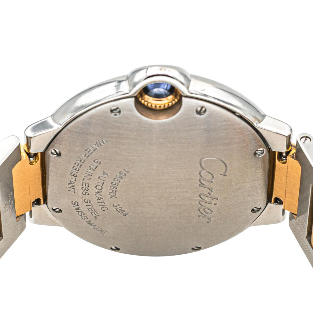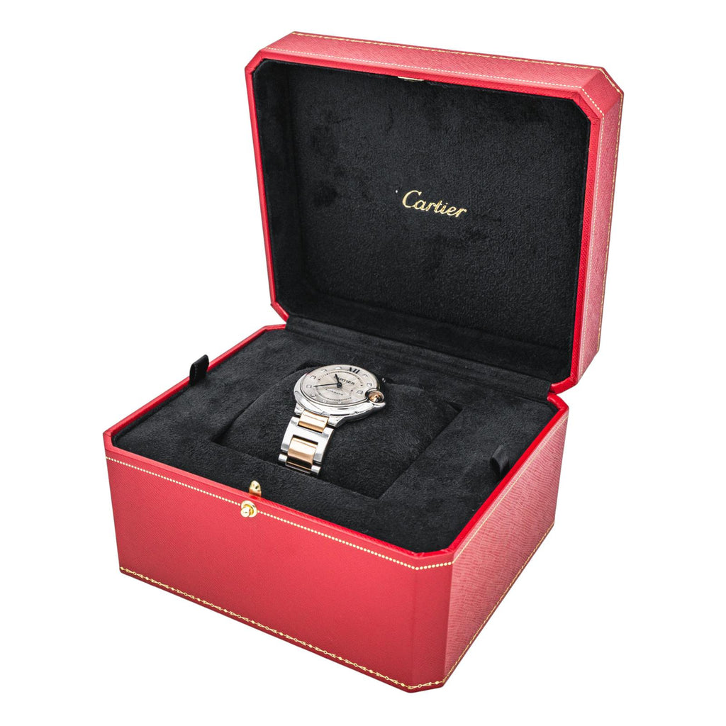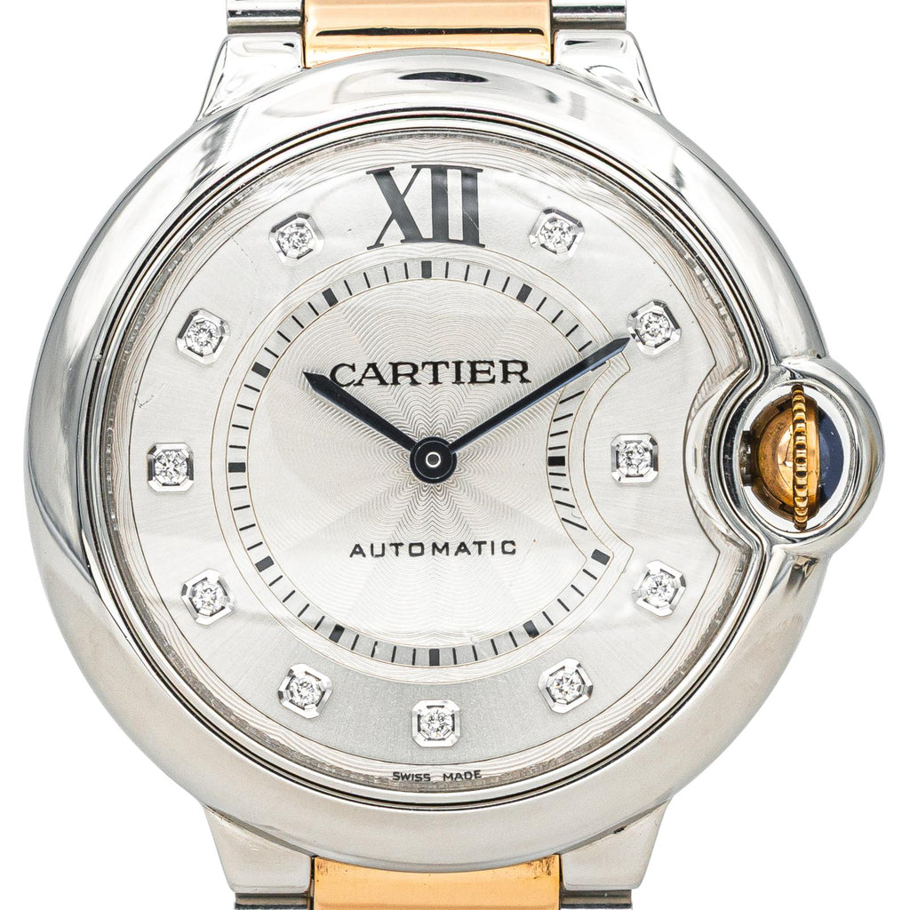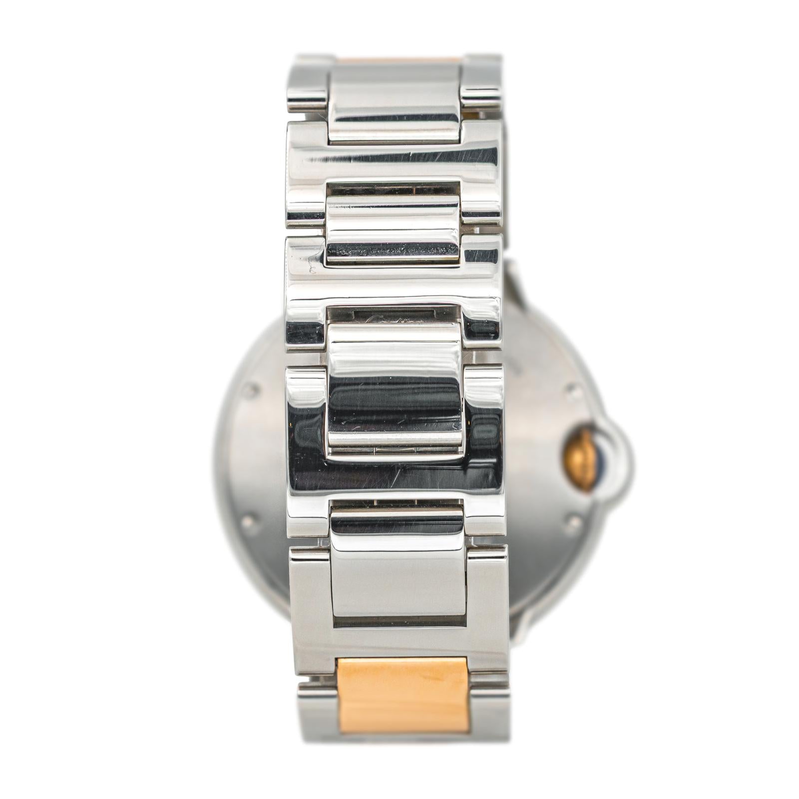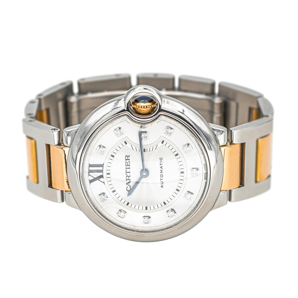 Montre Cartier modèle Ballon bleu acier et or rose 750 millièmes (18 carats), réf : WE902044, n°série 196556RX3284, cadran argenté guilloché à index en diamants, poids total diamant env 0,05 ct, mouvement mécanique à remontage automatique, boîtier 33 mm, verre saphir, bracelet en acier à boucle déployante, Longueur 17,50 cm, largeur 1,80 cm, poids total 100,30 g, années 2010, boite Cartier d'origine, révision complète et garantie 1 an, très bon état