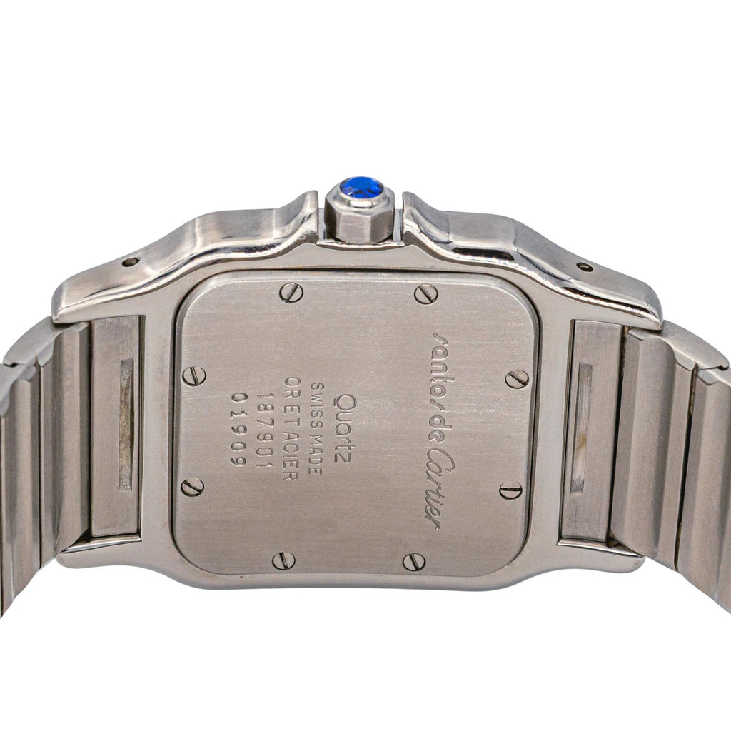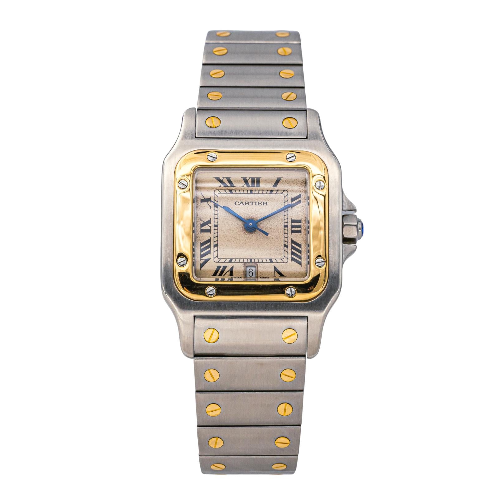 Montre Cartier modèle Santos 187901 en acier et or jaune 750 millièmes (18 carats), n°série 01909, cadran champagne à chiffres romains, mouvement à quartz, boîtier 29 mm, verre saphir, bracelet en acier et or, fermoir déployant (taille poignet 18 cm, largeur bracelet 17,8 à 15 cm en chute), poids total : 84,28 g, années 1990, vendue avec pochon d'origine, révision complète et garantie 1 an, excellent état