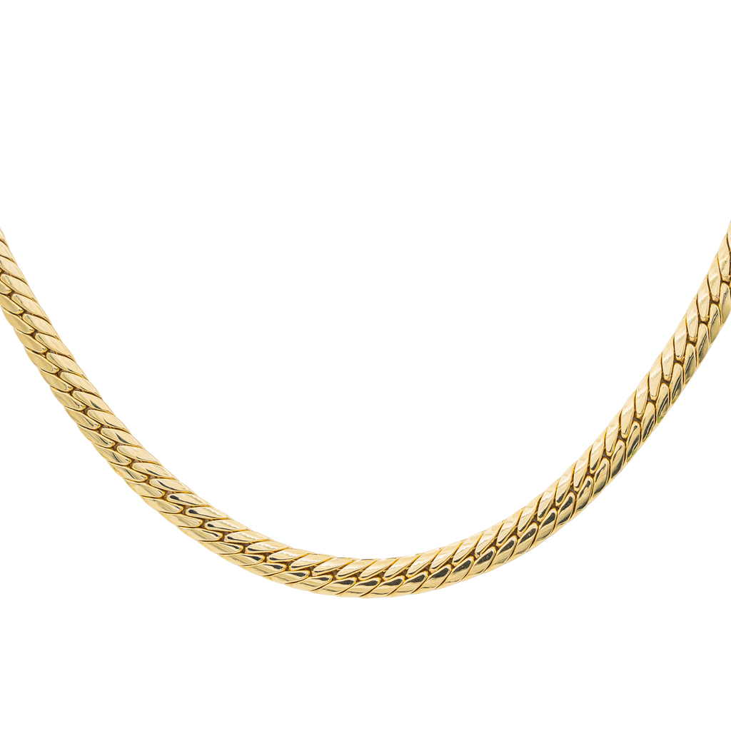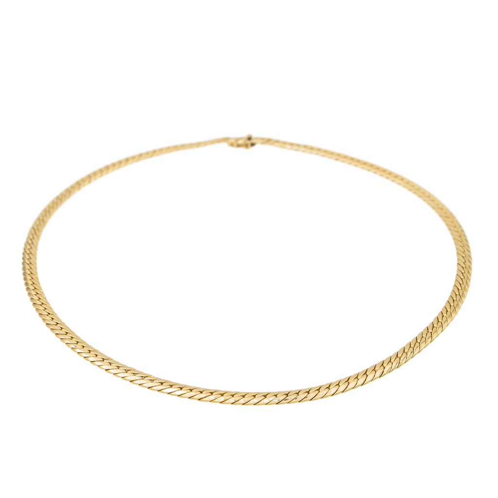 Chaine en or jaune 750 millièmes (18 carats), maille anglaise, longueur : 50,00 cm, largeur : 0,53 cm, épaisseur : 0,21 cm, poids total : 23,49 g, fermoir languette avec huit de sécurité, poinçon hibou , excellent état