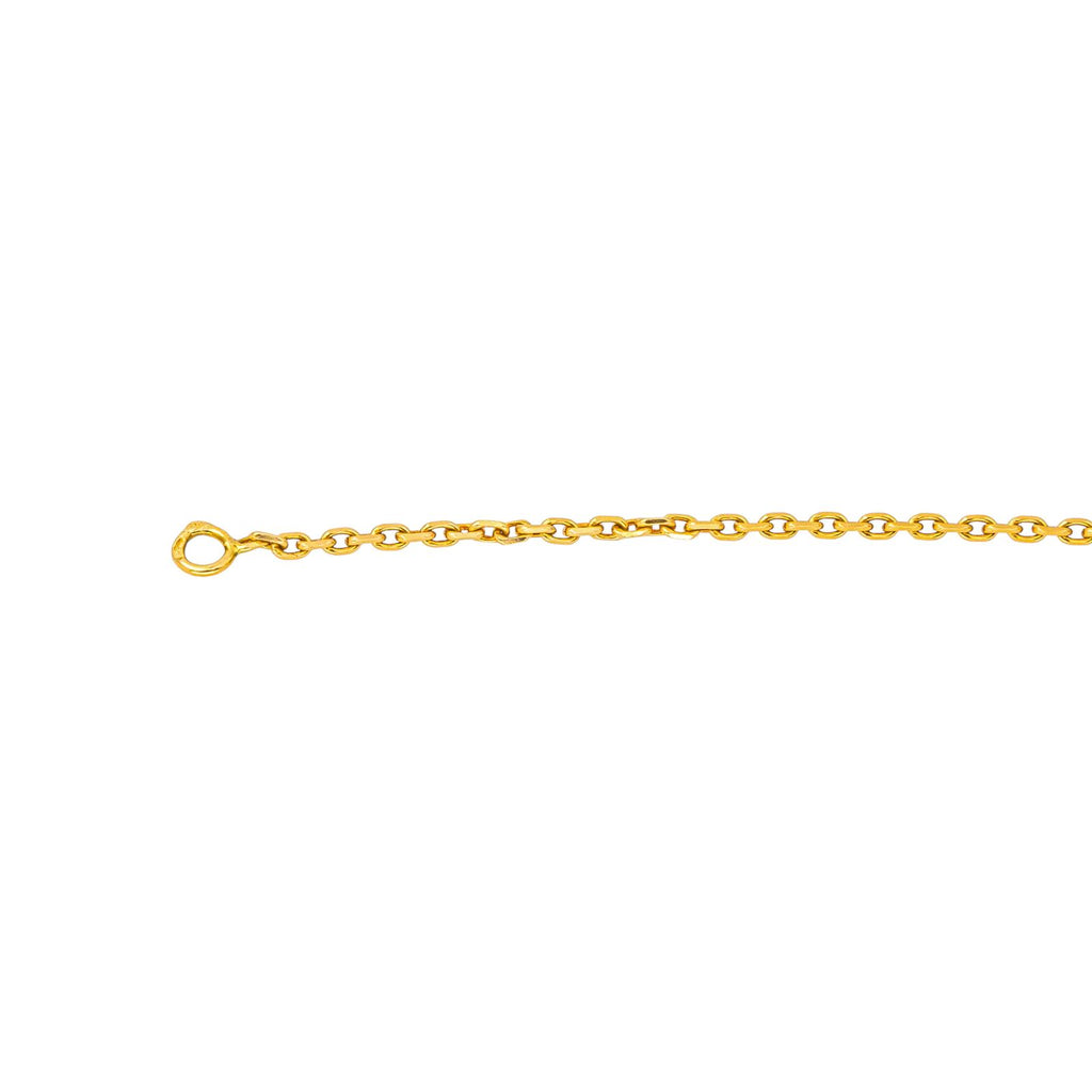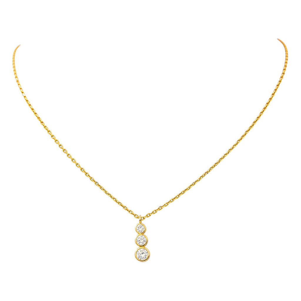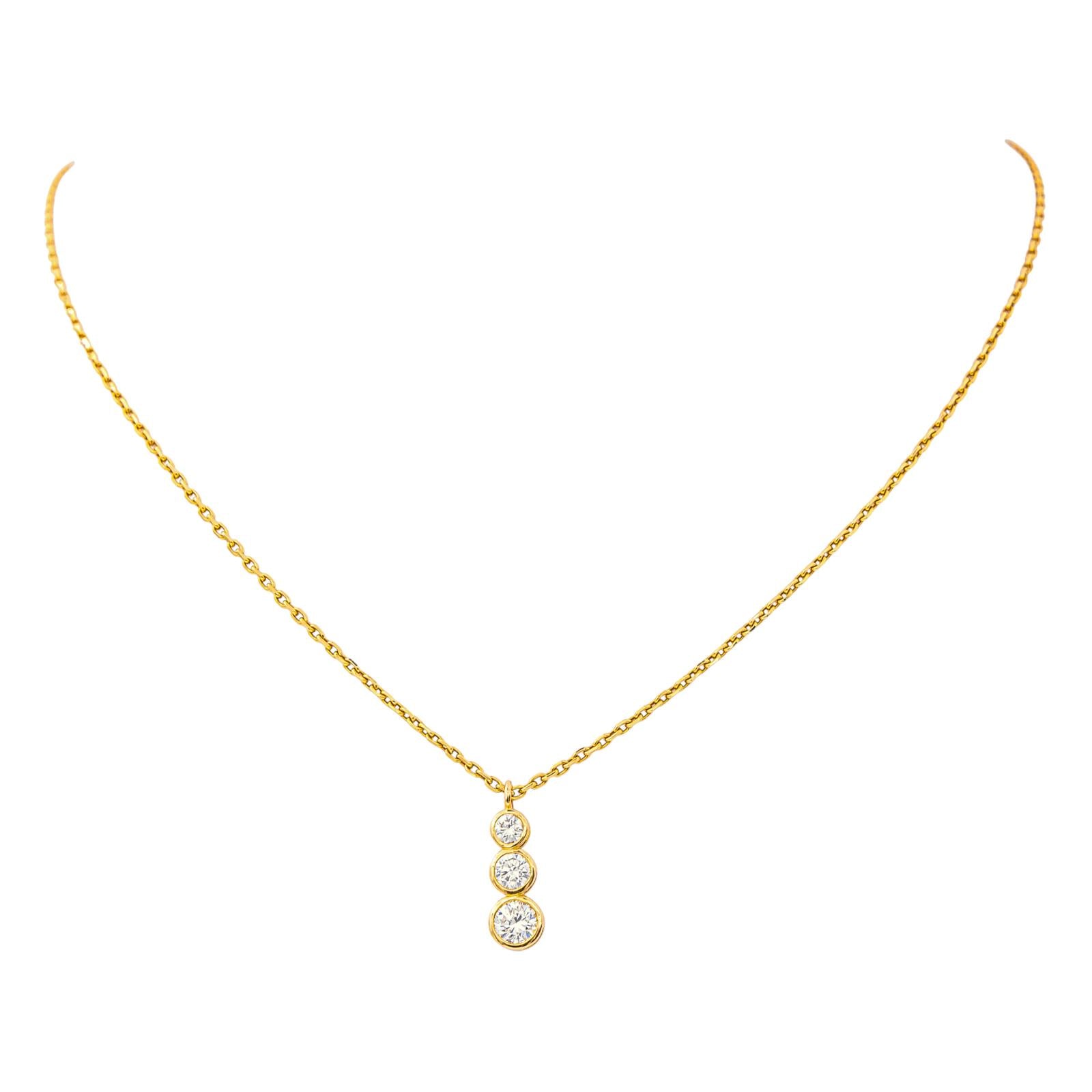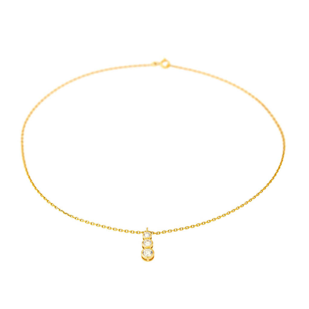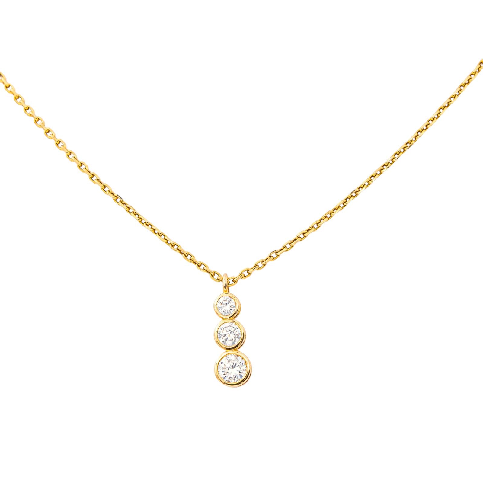 Collier en or jaune 750 millièmes (18 carats), sertis de 3 diamants taille brillant, environ H-VS, poids total diamants : environ 0,78 ct (chaque diamant d'un poids de respectivement 0,4 ct, 0,25ct et 0,13ct), maille forçat limée, longueur : 40,00 cm, largeur de la chaîne : 0,14 cm, longueur de la partie comprenant les motifs : 1,84 cm, largeur : 0,57 cm, poids total : 4,92 g, poinçon charançon, excellent état