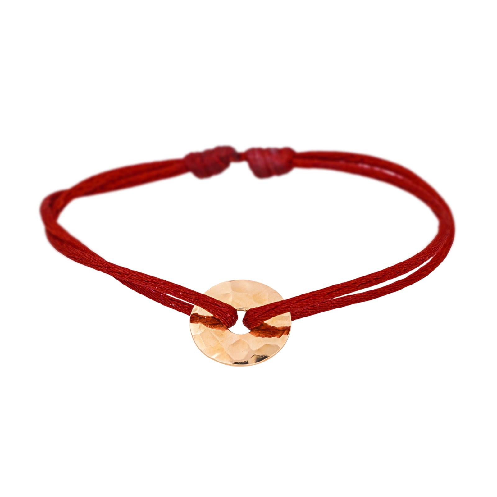Bracelet signé de la maison Dinh Van, pendentif Pi, en or rose 750 millièmes (18 carats) testé, face martelée, longueur : 15,00 cm, largeur : 0,15 cm, diamètre du Pi : 1,40 cm, taille ajustable grâce aux nœuds coulissants du cordon, poids : 1,33 g, excellent état