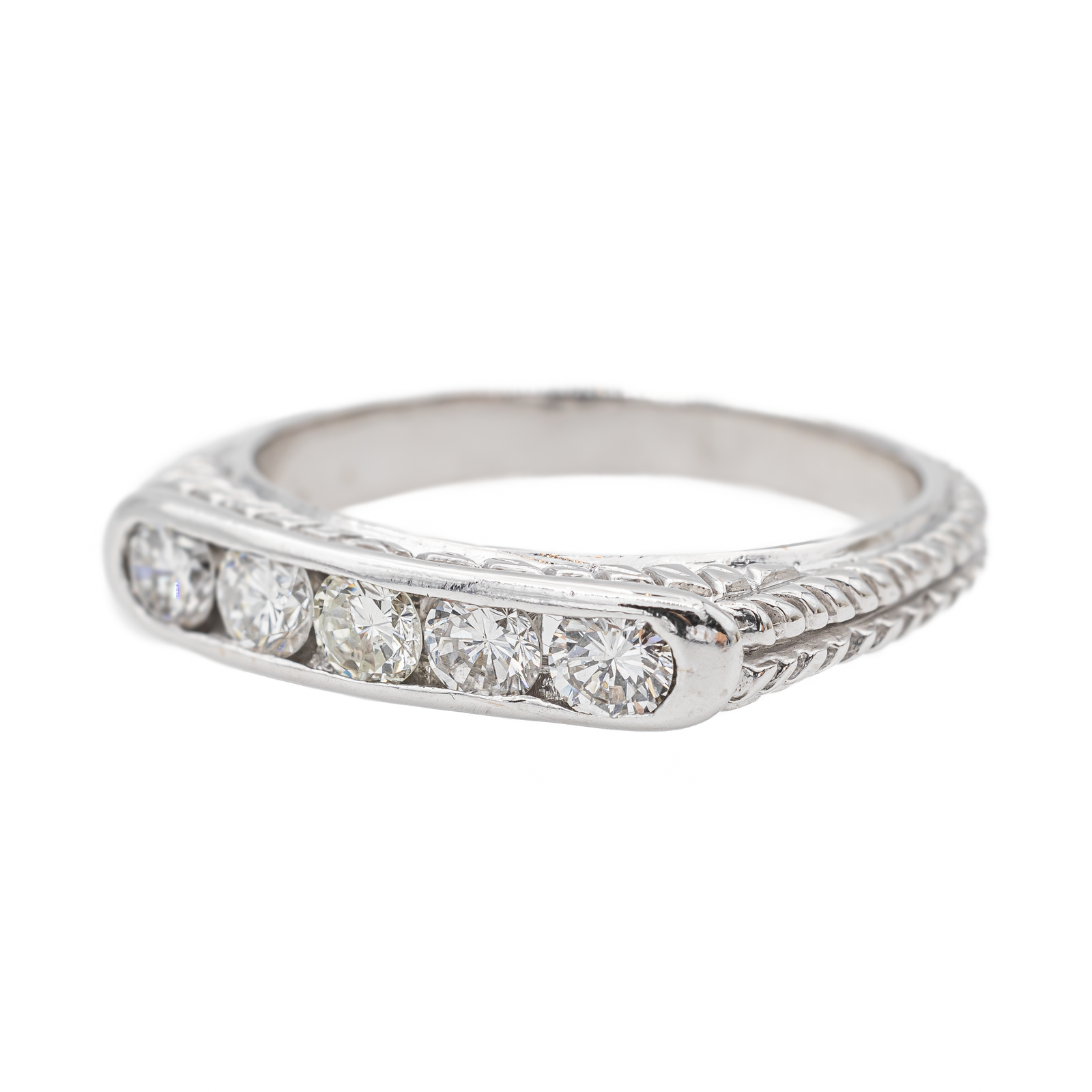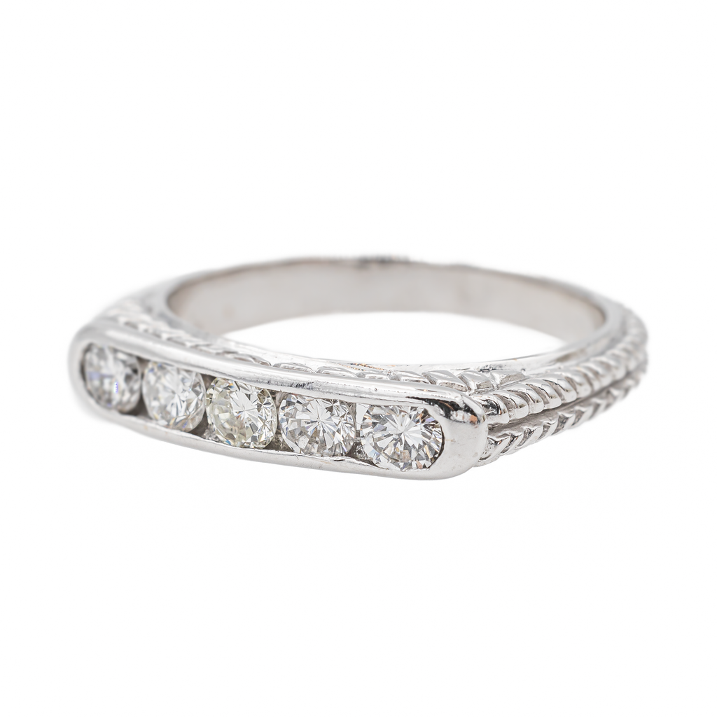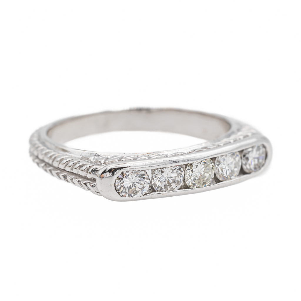Demi-alliance en or blanc 750 millièmes (18 carats), sertie de 5 diamants taille brillant, environ H-SI, d'environ 0,80 ct chacun, poids total diamants : environ 0,16 ct, largeur sur le dessus : 0,38 cm, tour de doigt : 52, poids total : 4,47 g, poinçon hibou, excellent état