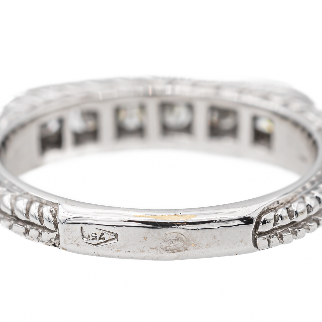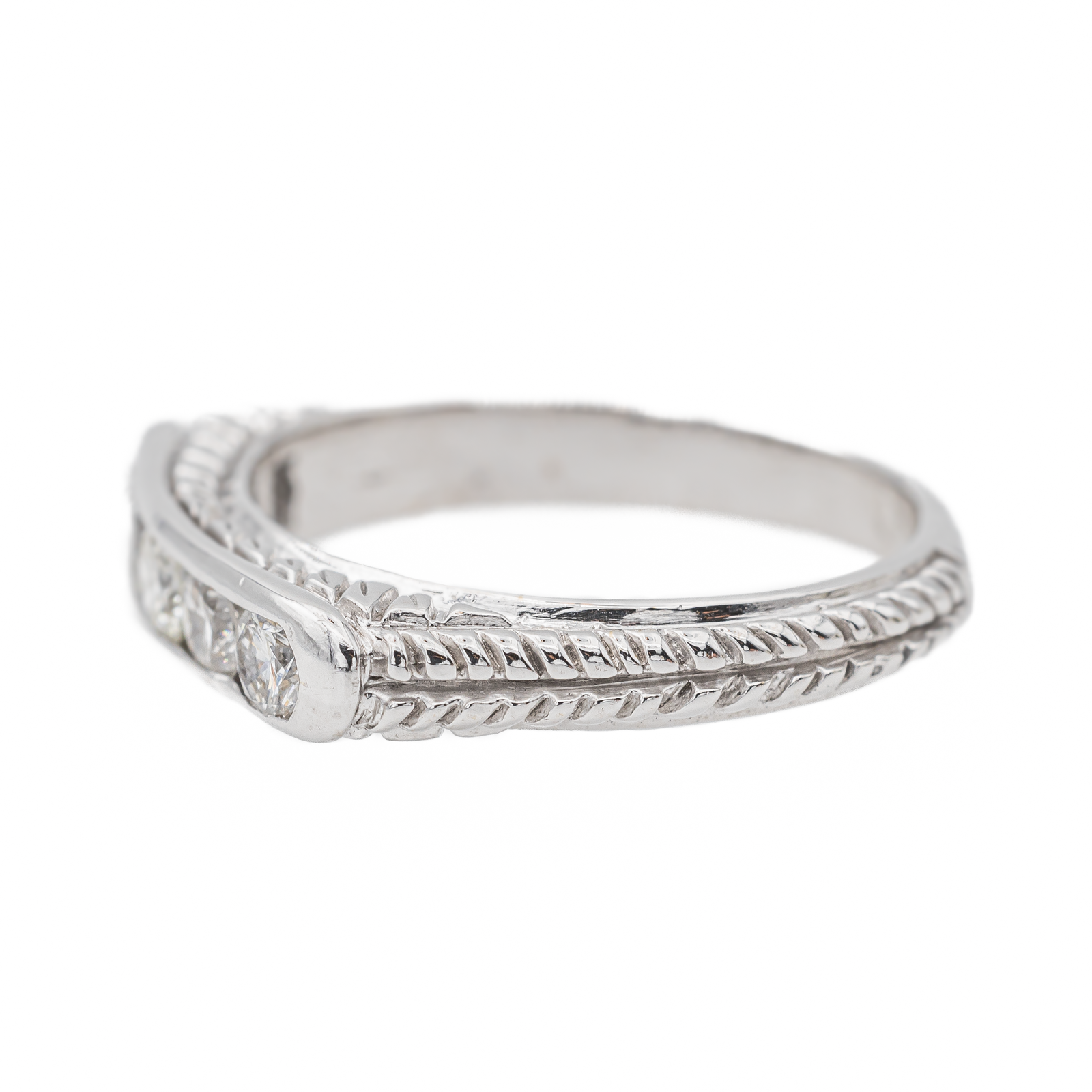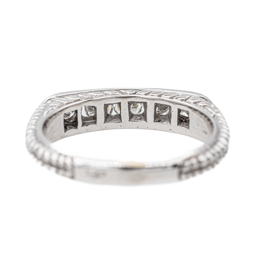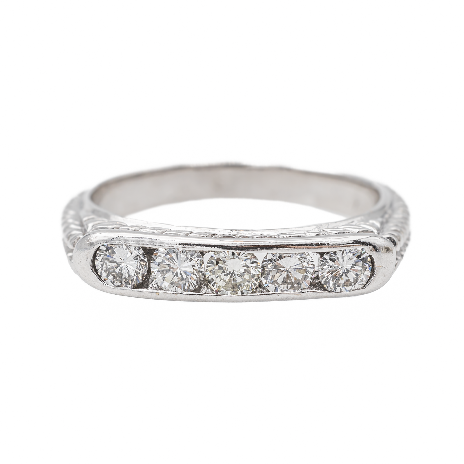Demi-alliance en or blanc 750 millièmes (18 carats), sertie de 5 diamants taille brillant, environ H-SI, d'environ 0,80 ct chacun, poids total diamants : environ 0,16 ct, largeur sur le dessus : 0,38 cm, tour de doigt : 52, poids total : 4,47 g, poinçon hibou, excellent état
