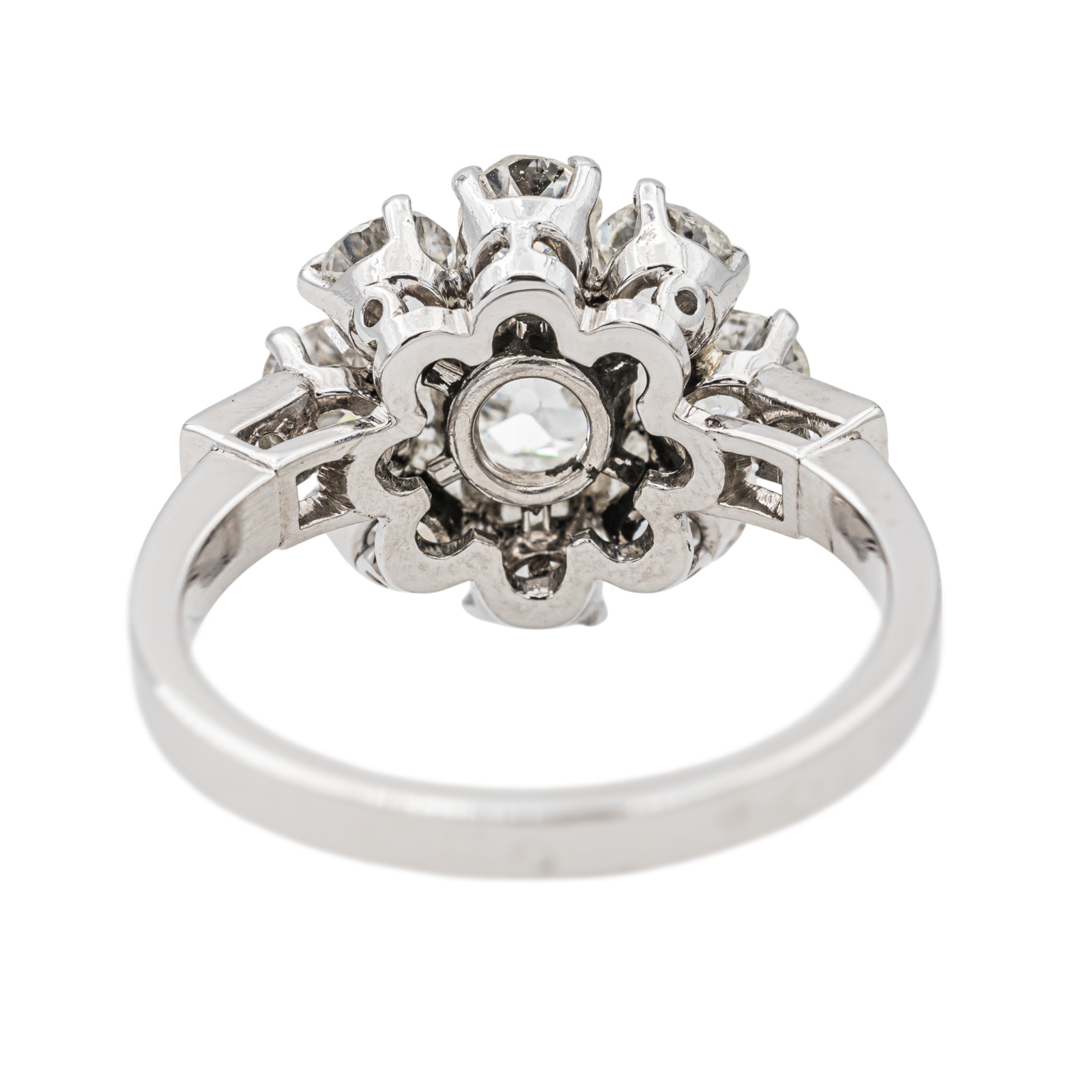 Bague Marguerite en platine 950 millièmes, sertie de 11 diamants taille ancienne, un diamant environ H-I/VS, d'un poids d'environ 1,95 cts, entouré de 10 diamants, environ H/SI, d'un poids total d'environ 3,16 cts, (8 diamants d'un poids d'environ 0,38 ct et 2 diamants d'un poids d'environ 0,06 ct), poids total diamants environ : 5,11 cts, largeur sur le dessus : 1,56 cm, tour de doigt : 60, poids total : 9,35 g, poinçon tête de loup, excellent état