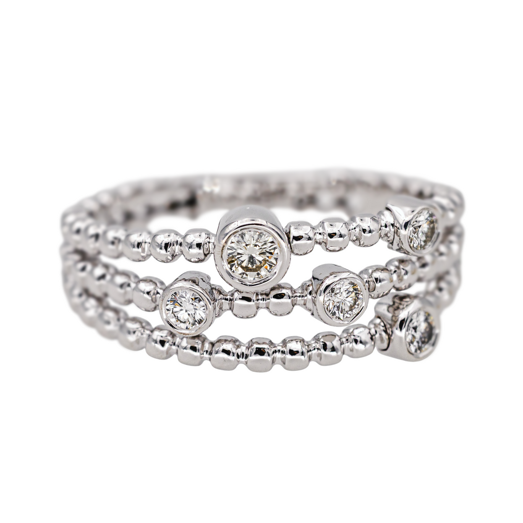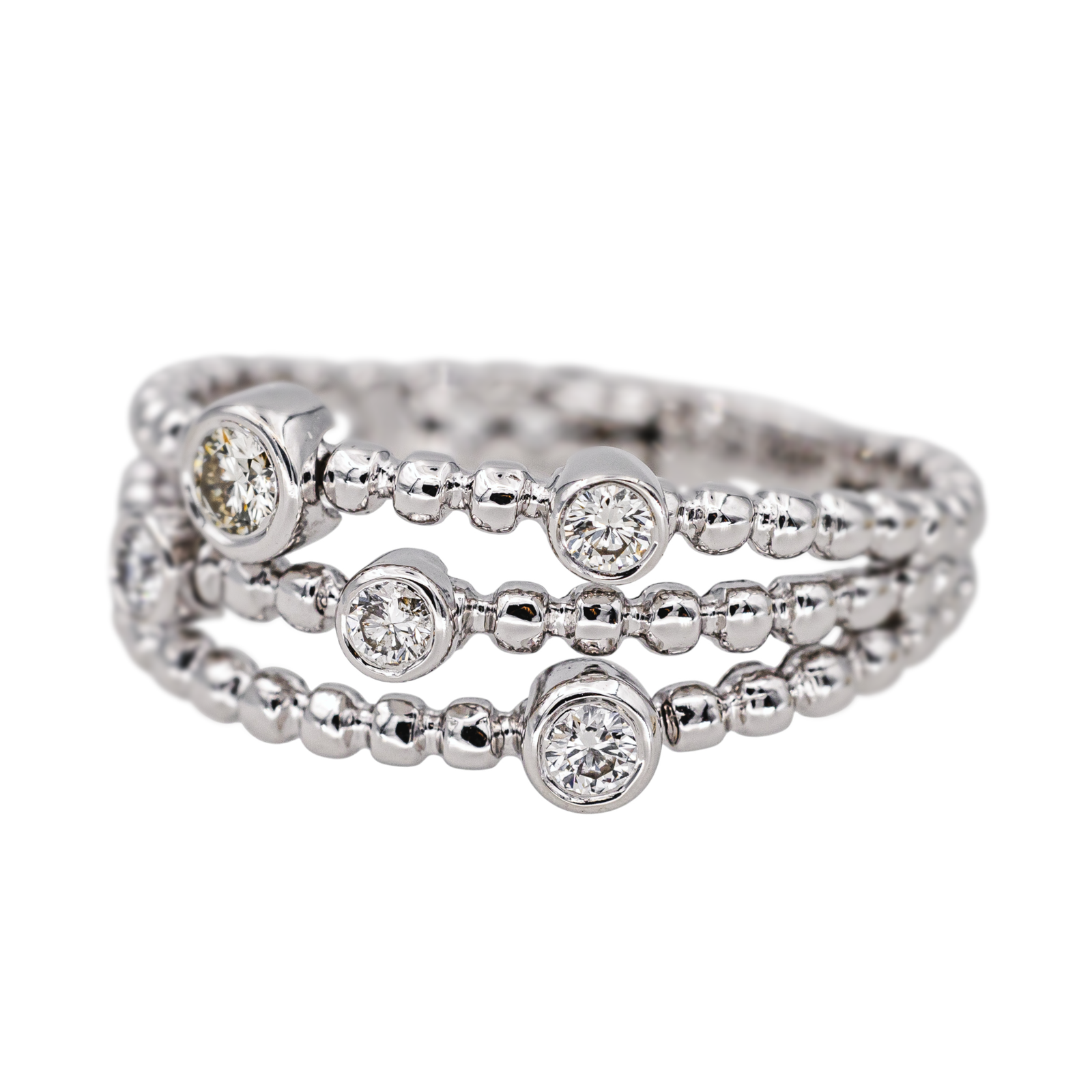 Bague en or blanc 750 millièmes (18 carats), pavée de diamants, 1 diamants taille brillant, environ I-SI, d'un poids total d'environ 0,09 ct, 1 diamant taille brillant, environ I-SI, d'un poids total d'environ 0,05 ct, 3 diamants taille brillant, environ I-SI d'un poids total d'environ 0,09 ct (chaque diamant d'un poids d'environ 0,03 ct), largeur sur le dessus : 0,81 cm, tour de doigt : 54, poids total : 3,46 g, poinçon tête d'aigle, excellent état