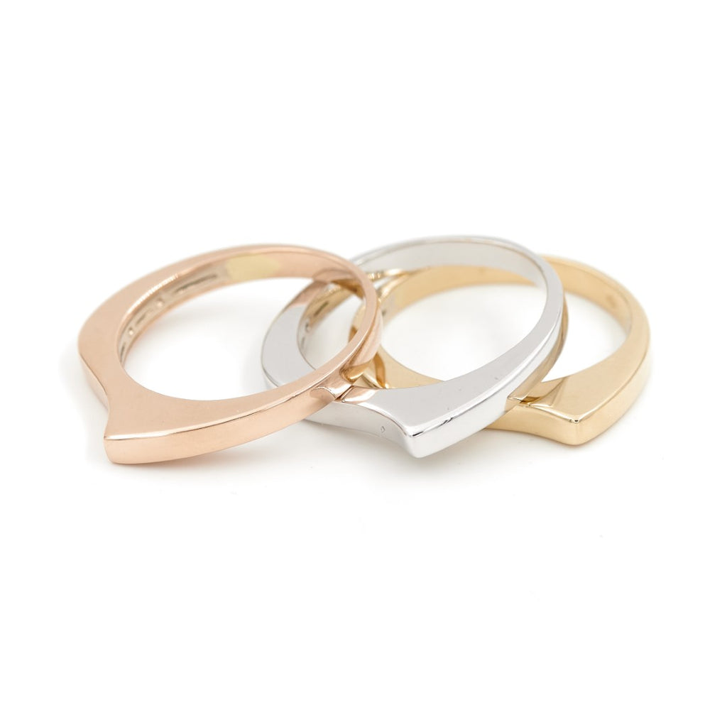 Trilogie de bagues en or jaune, or blanc et or rose 750 millièmes (18 carats), largeur sur le dessus : 0,24 cm, tour de doigt : 54, poids total : 9,46 g, poinçon tête d'aigle, excellent état