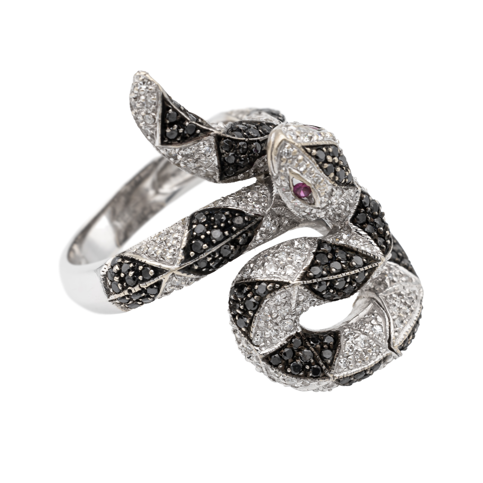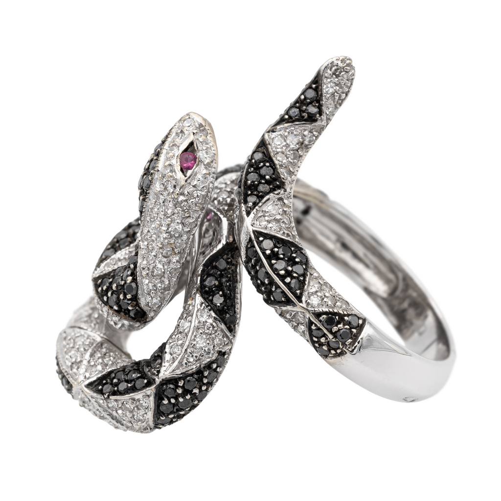 Bague serpent en or blanc 750 millièmes (18 carats), sertie de pavages de diamants blancs taille huit/huit estimés H/SI, d'environ 0,005 ct chacun, poids total diamants blancs: environ 1,065 cts, et de pavages de diamants noirs taille brillant, d'environ 0,005 ct chacun, poids total diamants noirs: environ 0,675 ct, largeur sur le dessus: 3,15 cm, tour de doigt: 53, poids total: 9,23 g, poinçon tête d'aigle, excellent état