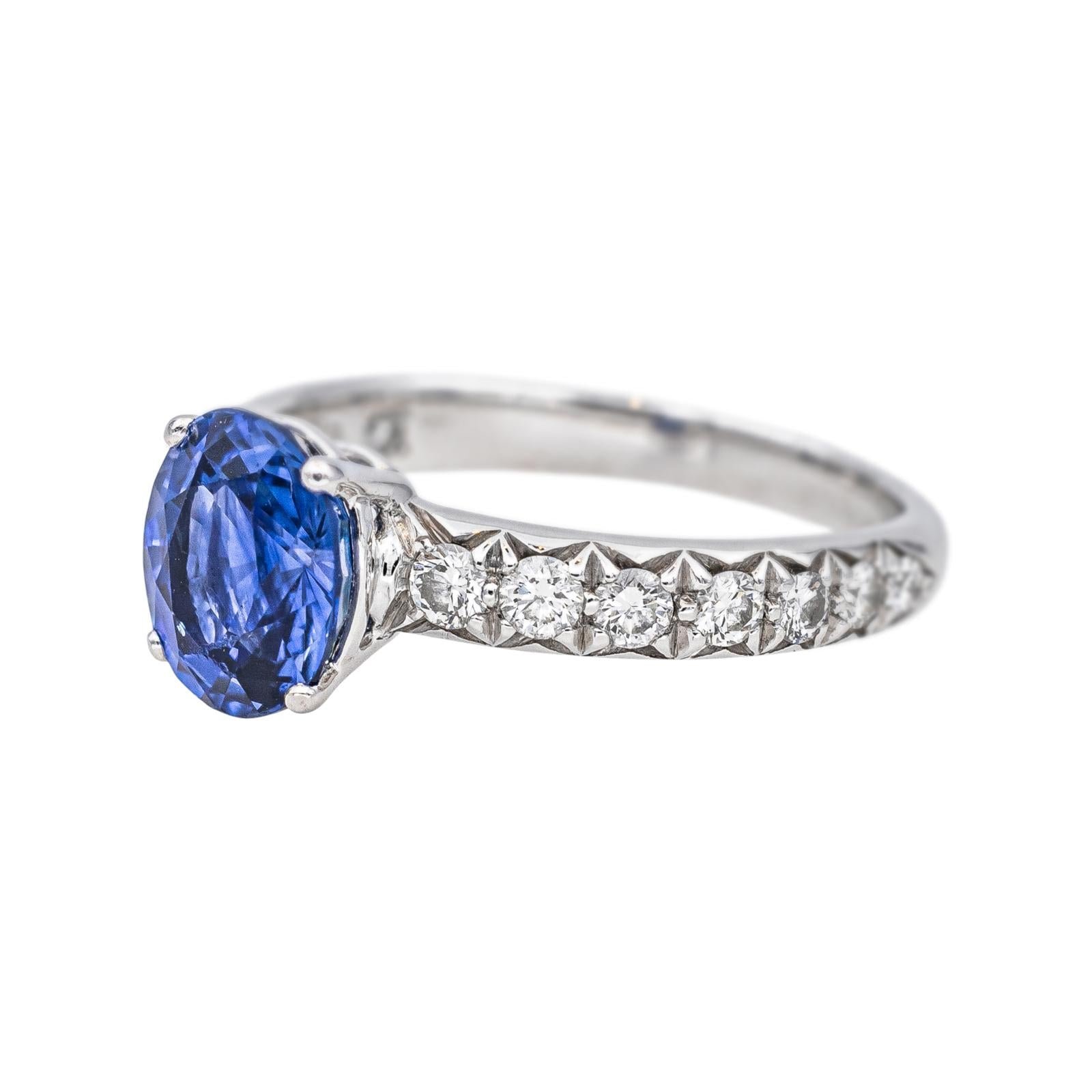 Bague en or blanc 750 millièmes (18 carats), sertie d'un saphir et de diamants, 1 saphir taille ovale, d'un poids total d'environ 2,16 cts, entouré de 14 diamants taille brillant, environ G-VS, d'un poids total d'environ 0,42 ct, (chaque diamant d'un poids d'environ entre 0,04 et 0,02 ct en chute), largeur sur le dessus : 0,80 cm, tour de doigt : 52, poids total : 3,82 g, poinçon tête d'aigle, excellent état