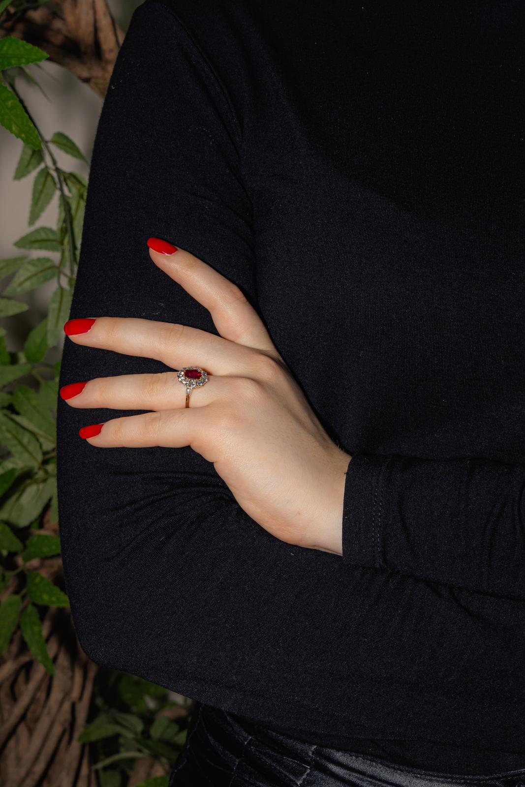 Bague en or jaune 750 millièmes (18 carats) et platine 950 millièmes, sertie d'un rubis et de diamants, un rubis taille ovale, d'un poids d'environ 1,43 ct, entouré de 12 diamants taille brillant, environ H-VS, d'un poids total d'environ 0,84 ct, (10 diamants d'un poids d'environ 0,08 ct et 2 diamants d'un poids d'environ 0,02 ct), largeur sur le dessus : 1,50 cm, tour de doigt : 51, poids total : 4,59 g, poinçon tête d'aigle et tête de chien, excellent état